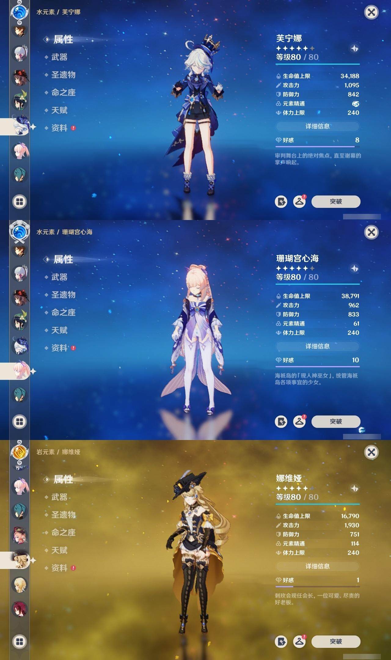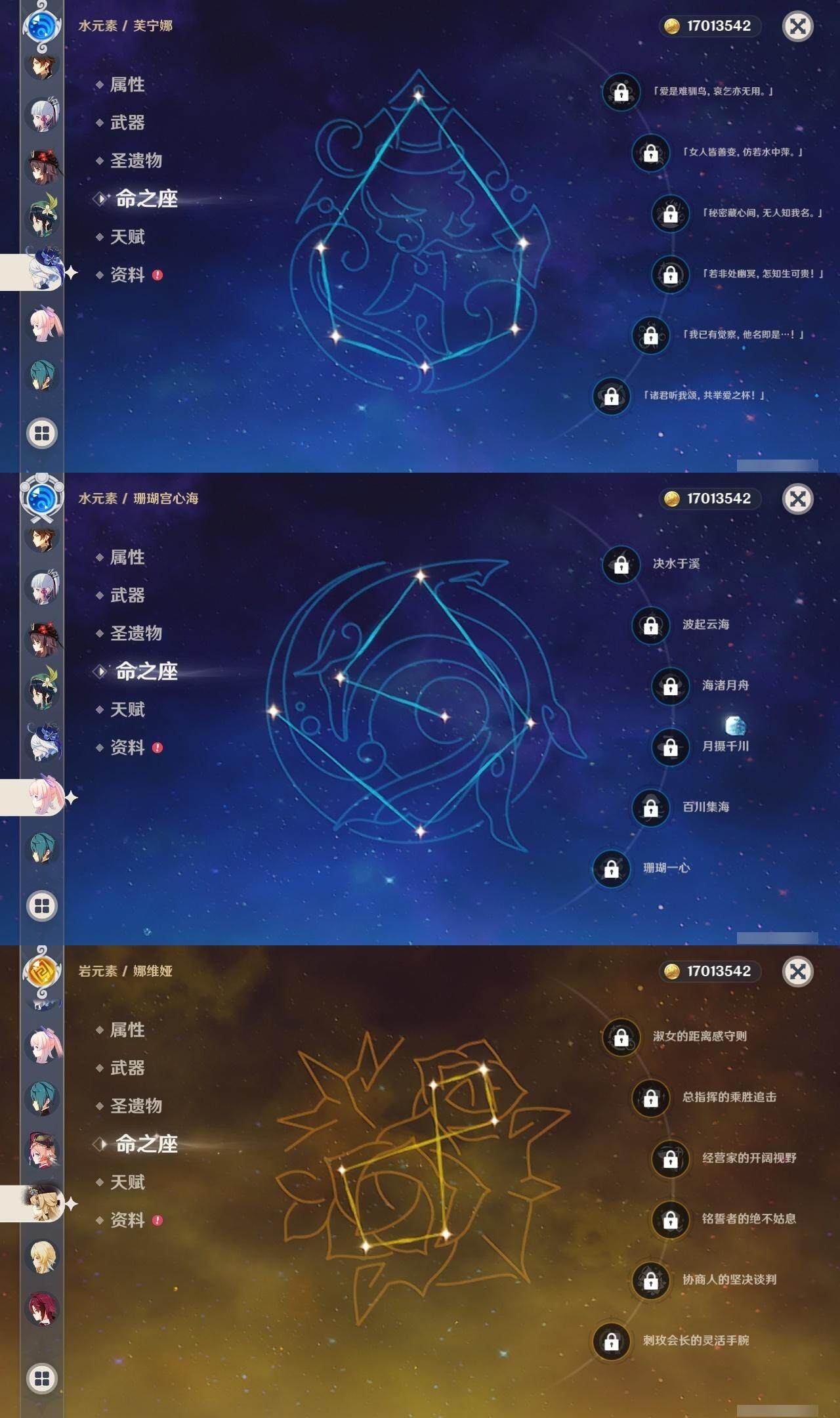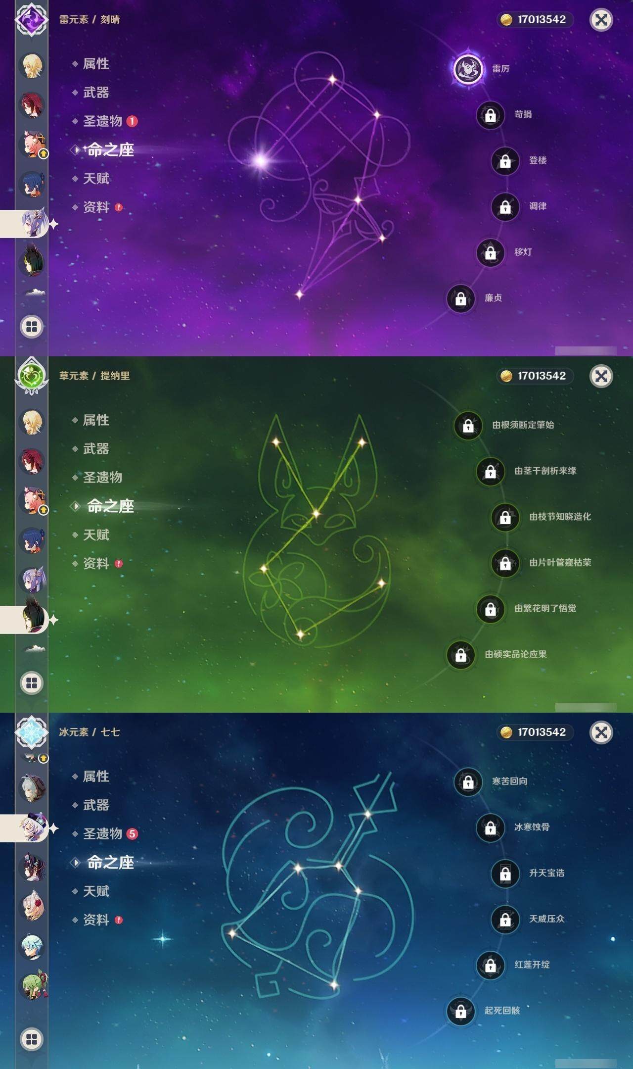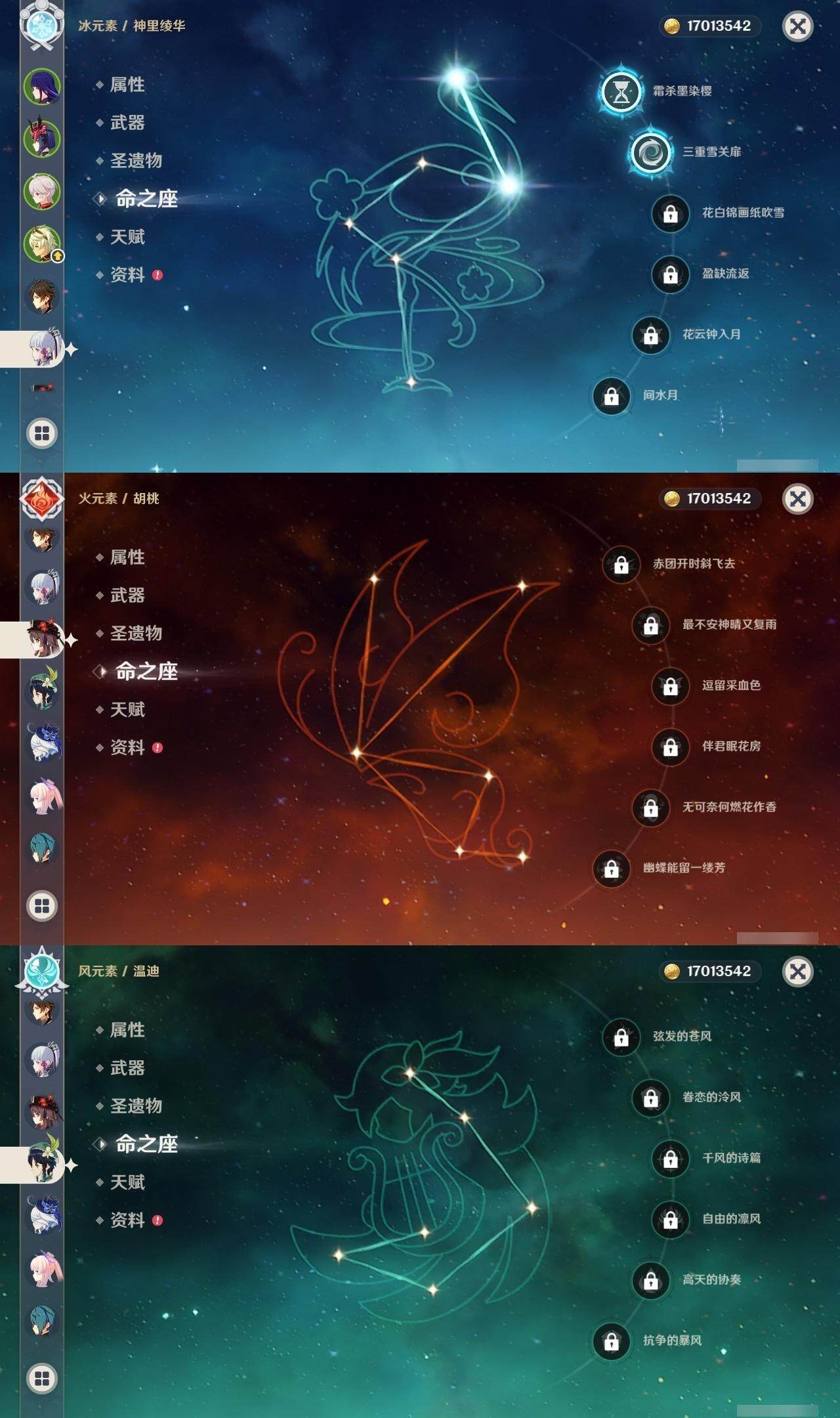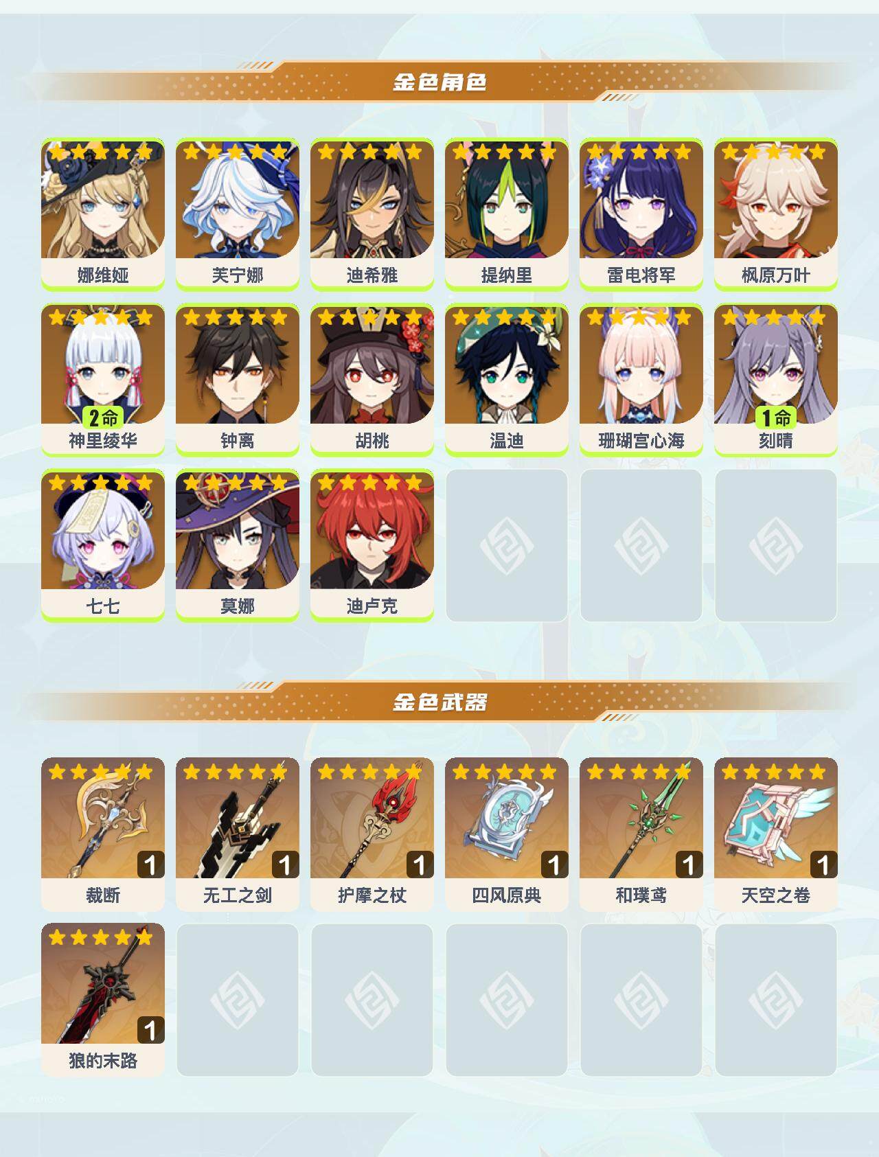 0命娜维娅,0命芙宁娜,0命迪希雅,0命提纳里,0命雷电将军,0命枫原万叶,2命神里绫华,0命钟离,0命胡桃,0命温迪,0命珊瑚宫心海,1命刻晴,0命七七,0命莫娜,0命迪卢克,精1裁断,精1无工之剑,精1护摩之杖,精1四风原典,精1和璞鸢,精1天空之卷,精1狼的末路
