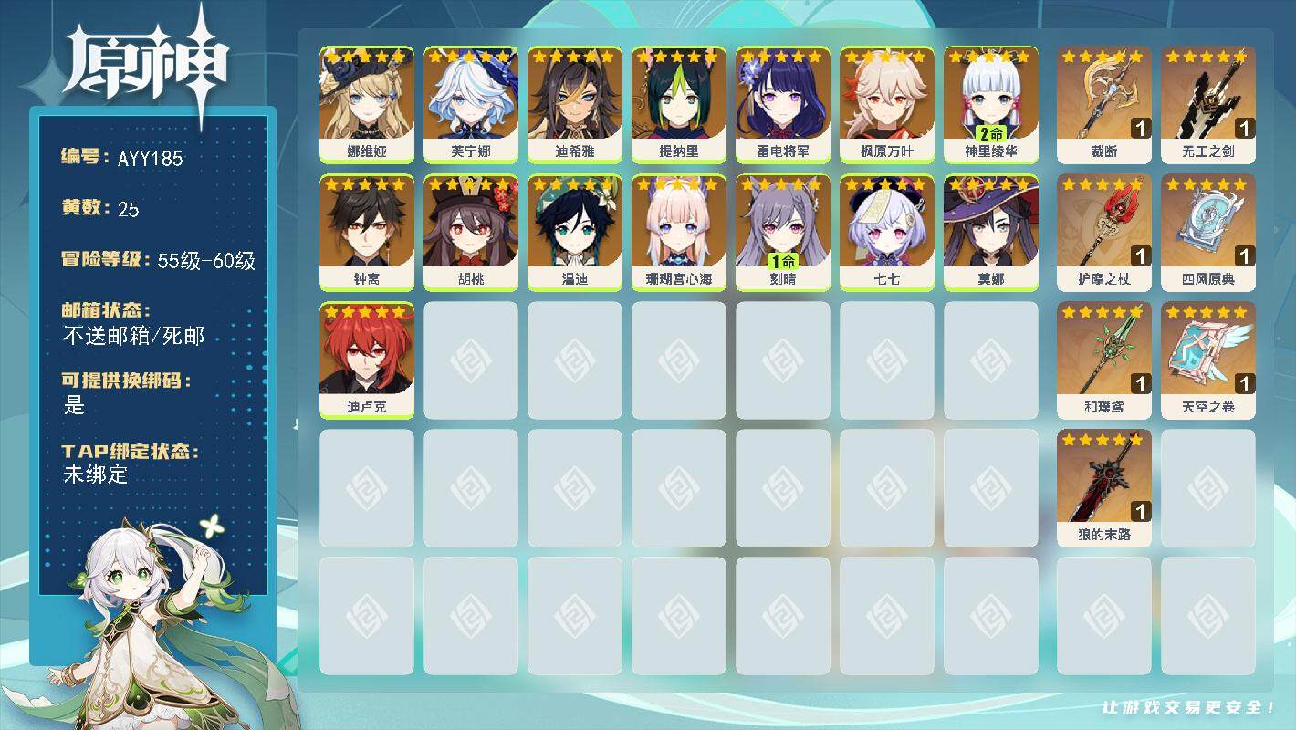 [15188444]【店主推荐捡漏号】58级/25黄/女主/15个五星角色/7个五星武器 0命娜维娅,0命芙宁娜,0命迪希雅,0命提纳里,0命雷电将军,0命枫原万叶,2命神里绫华,0命钟离,0命胡桃,0命温迪,0命珊瑚宫心海,1命刻晴,0命七七,0命莫娜,0命迪卢克,精1裁断,精1无工之剑,精1护摩之杖,精1四风原典,精1和璞鸢,精1天空之卷,精1狼的末路