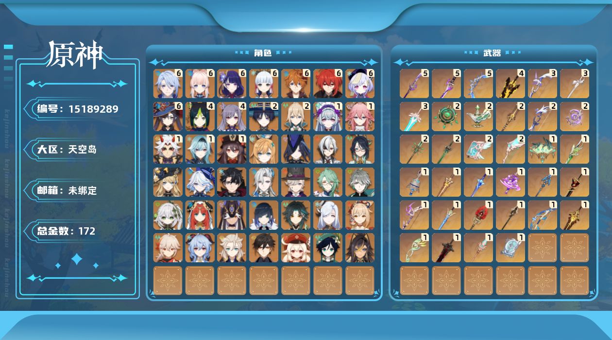 0命克洛琳德,0命阿蕾奇诺,0命闲云,0命娜维娅,0命芙宁娜,0命莱欧斯利,0命那维莱特,0命林尼,0命白术,0命迪希雅,0命艾尔海森,2命流浪者,0命纳西妲,0命妮露,0命赛诺,4命提纳里,0命夜兰,满命神里绫人,1命八重神子,0命申鹤,1命荒泷一斗,1命优菈,满命雷电将军,0命枫原万叶,满命神里绫华,0命钟离,1命胡桃,0命甘雨,0命魈,0命宵宫,0命温迪,0命可莉,满命达达利亚,0命阿贝多,满命珊瑚宫心海,4命刻晴,满命七七,2命琴,满命莫娜,满命迪卢克,1命梦见月瑞希,0命爱可菲,精1鹤鸣余音,精2碧落之珑,精1苇海信标,精1裁叶萃光,精1图莱杜拉的回忆,精2千夜浮梦,精2赤沙之杖,精1圣显之钥,精1猎人之径,精2若水,精1波乱月白经津,精1神乐之真意,精1息灾,精1赤角石溃杵,精1终末嗟叹之诗,精5冬极白星,精2不灭月华,精5薙草之稻光,精1飞雷之弦振,精5雾切之回光,精1苍古自由之誓,精4无工之剑,精1护摩之杖,精2磐岩结绿,精1四风原典,精2和璞鸢,精1天空之脊,精1贯虹之槊,精2天空之翼,精3阿莫斯之弓,精2天空之卷,精3风鹰剑,精1狼的末路,精3天空之傲