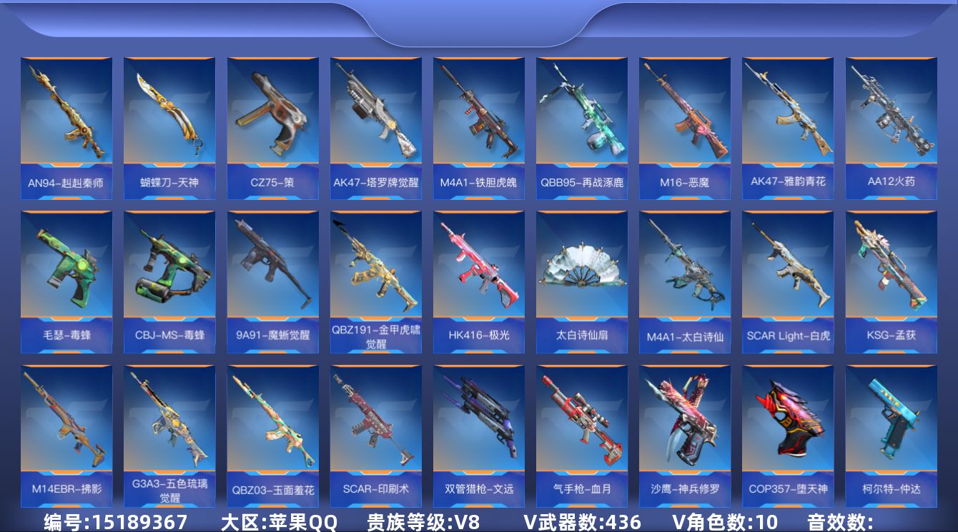 [15189367]12英雄角色数-424英雄武器数-18王者-多三国武器, 【王者系列】:王者之击,王者之力,王者之影,王者之怒,王者之魄,王者之心*2,王者之锋*2,王者之蝶,王者之圣,王者之兽,王者之狱,王者之魂*2,王者之烈,王者之霆,王者之业,QBZ03-王者蔷薇,王者之誉,M12S-雷霆王者 【热门武器】:KSG-孟获,81式-光明之神,MK47-仁德,AK47-孟德,M4A1-仲达,AK47-奉先,M4A1-星象,AK47-游骑兵*2,M4A1-游骑兵,AWM-妙才,COP 357-雷霆*2,COP 357-星象,COP 357-堕天神,81式-阿波罗,CZS2-仲康,AN94-盖 【角色】:审判者,萝拉,葵,樱,瞳*2,关小雨*2,云悠悠,关小雨-X,炽天使-X,零-新生 【英雄武器】:AK47-无影,AK47-火麒麟*2,AK47-沙漠领主,AK47-游骑兵*2,AK47-机械迷城*2,AK47-无影-葵,AK47-变色龙,AK47-孟德,AK47-猩红传说,AK47-沙漠郡主-超觉,AK47-幸运日,AK47-燎天净火,AK47-雷麒麟,AK47-雷暴,AK47-奉先,AK47-血武士,AK47-华夏传说,AK47-黑鲨,AK47-春雅,AK47-雅韵青花,AK47-塔罗牌觉醒,AK47-谜城烟火*2,M4A1-雷神,M4A1-黑骑士*2,M4A1-死神*3,M4A1-玫瑰精灵,M4A1-游骑兵,M4A1-星象,M4A1-龙血,M4A1-仲达,M4A1-机械迷城,M4A1-海骑士,M4A1-冰锋觉醒,M4A1-堕天神,M4A1-心动次元觉醒,M4A1-运输船,M4A1-猎神,M4A1-千变,M4A1-太白诗仙,M4A1-铁胆虎魄,SCAR-幽暗骑士,SCAR Light-白虎,SCAR-探星者,SCAR-印刷术,SCAR-心动PICK,剑齿虎,AN94-四凶觉醒,AN94-赳赳秦师,AN94-盖,AUG-机械纪元,FAMAS-湮灭,9A91-天神,9A91-魔蜥觉醒,M14EBR-暗夜觉醒,M14EBR-天神,M14EBR-拂影*2,M14EBR-葫芦山庄,M16-恶魔,AK12-天启,QBZ03-金色蔷薇*3,QBZ03-死神*2,QBZ03-玉面羞花,HK416-极光,81式-光明之神,QBZ19-天使,MK47-机械纪元,MK47-云舞,MK47-仁德,SK