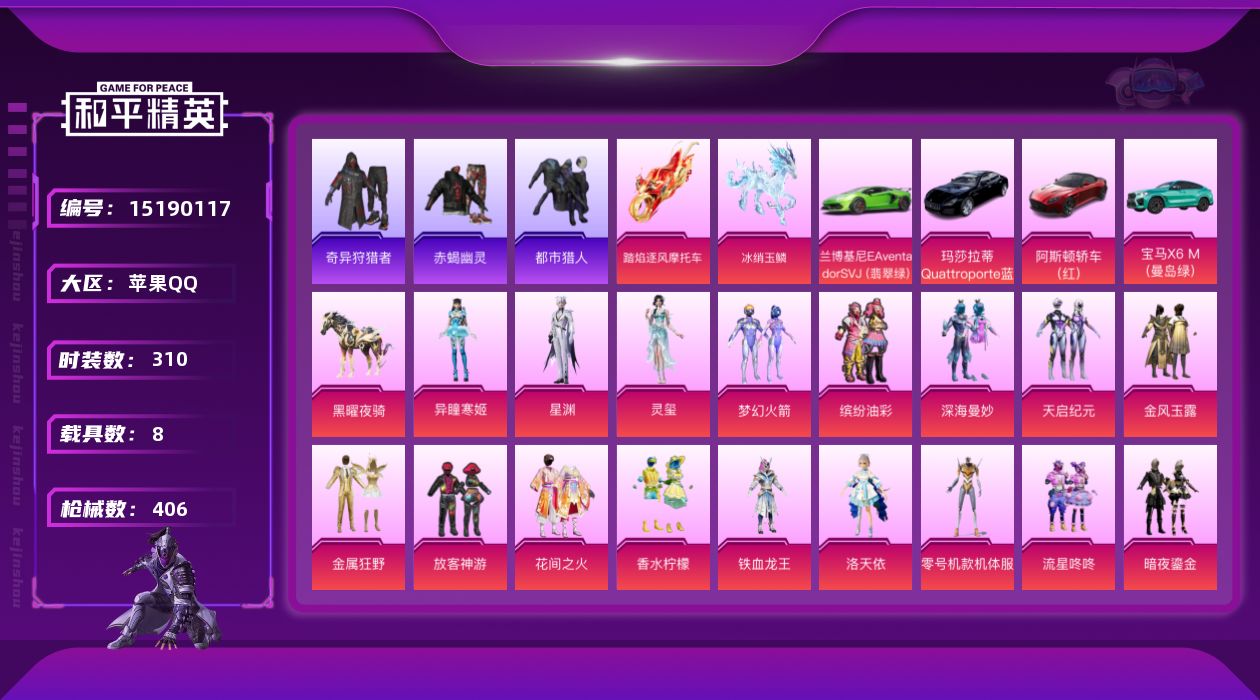 [15190117]【店主推荐捡漏号!可直接换绑】/素材身法号/绝世印记1/地铁满天赋 苹果 手Q-26粉装-18特效枪-8载具-9粉色飞行器-14.5w热力值-23王牌印记-310套装-406枪皮【热门品类】:粉装-梦幻火箭,粉装-缤纷油彩,套装-赤蝎幽灵,套装-都市猎人,套装-奇异狩猎者,套装-金羽特工,角色-2P战斗服款,套装-SS1特训,套装-龟仙人,小恶魔头饰,熔岩游骑兵面罩,套装-红熊茄茄【粉色载具】:兰博基尼Aventador SVJ(翡翠绿),阿斯顿马丁DBS(红),玛莎拉蒂Quattroporte(夜幕蓝),宝马X6 M(曼岛绿),踏焰逐风摩托车,僚机-冰龙团团,黑曜夜骑,冰绡玉鳞【粉色套装】:粉装-深海曼妙,粉装-梦幻火箭,粉装-天启纪元,粉装-金风玉露,粉装-金属狂野,粉装-缤纷油彩,粉装-放客神游,粉装-花间之火,粉装-香水柠檬,粉装-铁血龙王,角色-洛天依,角色-零号机款机体服,粉装-流星咚咚,粉装-暗夜鎏金,粉装-炫光之旅,角色-宙之时溯,角色-星云暗核,角色-紫钛骑兵,角色-守护天翼,粉装-幻彩电音,角色-罗征,角色-奇迹舞步 美琪,角色-奇迹舞步 美雪,角色-星渊,角色-灵玺,角色-异瞳寒姬【粉色枪皮等级】:AKM-炫紫旋律(五级),SCAR-L-机甲封神(五级),SCAR-L-魔童闹海 哪吒(三级),M416-心之恋语(六级),GROZA-焦糖拿铁(五级),UMP45-相思残雪(五级),Vector-绯穹魔姬(四级),野牛-流星咚咚(五级),AKS-74U-无垠阁(三级),P90-仙履奇缘(五级),P90-魔童闹海 敖丙(三级),Kar98K-巳巳如意(五级),AWM-花间之火(四级),M417-第五大道(四级),SPAS-12-音爆索尼克(四级),DP-28-豹影疾电(五级),MG3-洛神天依(五级),平底锅-喜羊羊与灰太狼(二级)【粉色飞行器】:深海曼妙飞行器,炫紫旋律飞行器,心之恋语飞行翼,霓虹漫游飞行器,终晖之翼飞行器,灵猫魔法师飞行器,飞天猪飞行器,灵珠游龙飞行器