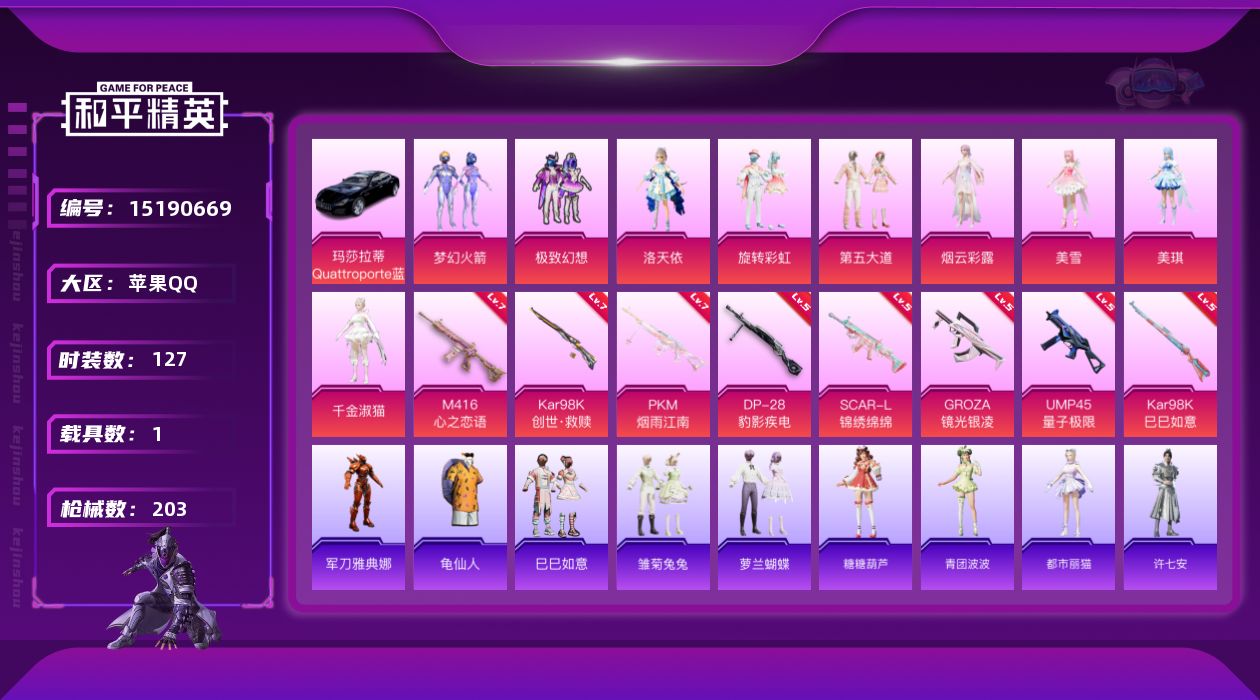 [15190669]【店主推荐捡漏号!可直接换绑】/素材身法号 苹果 手Q-9粉装-8特效枪-1载具-2粉色飞行器-6.5w热力值-14王牌印记-127套装-203枪皮【热门品类】:粉装-梦幻火箭,角色-军刀雅典娜,套装-龟仙人【粉色载具】:玛莎拉蒂Quattroporte(夜幕蓝)【粉色套装】:粉装-梦幻火箭,粉装-极致幻想,角色-洛天依,粉装-旋转彩虹,粉装-第五大道,角色-烟云彩露,角色-美雪,角色-美琪,角色-千金淑猫【粉色枪皮等级】:SCAR-L-锦绣绵绵(五级),M416-心之恋语(七级),GROZA-镜光银凌(五级),UMP45-量子极限(五级),Kar98K-创世·救赎(七级),Kar98K-巳巳如意(五级),DP-28-豹影疾电(五级),PKM-江南烟雨(七级)【粉色飞行器】:梦幻火箭飞行器,凤舞九天飞行器