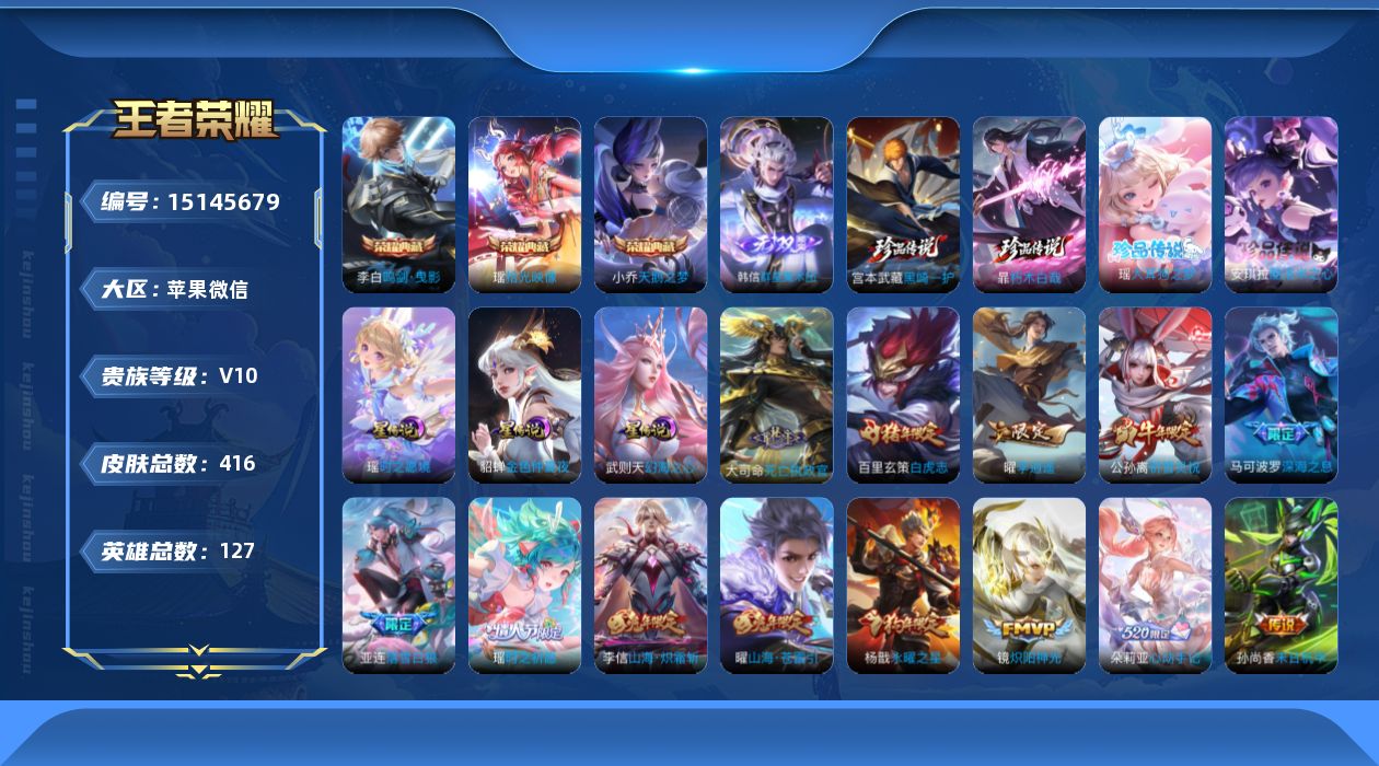 [15145679]女号!苹果WX-V10-最强王者段位-127英雄-416皮肤-3典藏皮肤-1典藏英雄-1无双-4珍品传说-47传说-143史诗-露比小兵!-3星传说(瑶时之愿境,武则天幻海之心,貂蝉金色仲夏夜) 【英雄全皮】:刘邦全皮,娜可露露全皮,鬼谷子全皮,金蝉全皮,暃全皮,空空儿全皮 【荣耀典藏】:武则天英雄,小乔天鹅之梦,李白鸣剑曳影,瑶拾光映像 【无双皮肤】:韩信群星魔术团 【珍品传说】:瑶大耳狗之梦,安琪拉酷洛米之心,暃朽木白哉,宫本武藏黑崎一护 【传说皮肤】:大司命死亡执政官,铠冥王哈迪斯,朵莉亚心动手记,亚连落雪白狼,艾琳觅芳踪,孙膑小动物乐团,云缨鹤归松栖,马可波罗妄想实况,诸葛亮鹤羽星尊,公孙离记忆之芯,花木兰燃星之曲,虞姬无限倾心,伽罗炽翼辉光,小乔山海琳琅生,曜山海苍雷引,李信山海炽霜斩,王昭君星穹之声,娜可露露前尘镜,孙尚香音你闪耀,马可波罗深海之息,后羿无尽星芒,马超无双飞将,大乔挚爱花嫁,孙策挚爱之约,露娜启示之音,蔡文姬花朝如约,瑶时之祈愿,孙尚香异界灵契,王昭君乞巧织情,西施游龙清影,曜李逍遥 ,公孙离祈雪灵祝,诸葛亮时雨天司,镜炽阳神光,虞姬启明星使,曜云鹰飞将,刘备时之恋人,貂蝉猫影幻舞,虞姬云霓雀翎,百里玄策白虎志,花木兰冠军飞将,后羿黄金射手座,杨戬永曜之星,貂蝉仲夏夜之梦,孙尚香末日机甲,孙悟空地狱火,武则天海洋之心 【限定皮肤】:铠冥王哈迪斯,暃埋骨钱,蔡文姬夏日便利店,大乔绒语心约,虞姬夏日便利店,姜子牙天穹之誓,狄仁杰阴阳师,小乔纯白花嫁,小乔山海琳琅生,赵云皇家上将,墨子神迹守卫,嬴政白昼王子,孙尚香蔷薇恋人,孙尚香异界灵契,鲁班七号狮舞东方,庄周高山流水,高渐离死亡摇滚,阿轲迷踪丽影,钟无艳超时空战士,扁鹊奇幻香踪,白起夜都怪侠,芈月幻夜卜梦,吕布猎兽之王,周瑜赤莲之焰,元歌云间偶戏,元歌无心,夏侯惇朔风刀,夏侯惇匿光决锋者,甄姬女儿国国王,甄姬游园惊梦,甄姬落雪兰心,曹操烛龙,典韦穷奇,典韦蓝屏警告,马可波罗逐梦之星,马可波罗暗影游猎,马可波罗深海之息,马可波罗山海玄木吟,马可波罗妄想实况,狄仁杰魔术师,狄仁杰万华元夜,达摩星际陆战队,达摩沙漠行僧,项羽海滩派对,老夫子醍醐杖,老夫子航海奇遇记,关羽冰锋战神,程咬金演武夺筹,露娜一生所爱,露娜启示之音,刘邦夺宝奇兵,王昭君凤凰于飞,王昭君午后时光,王昭君星穹之声,兰陵王驯魔猎