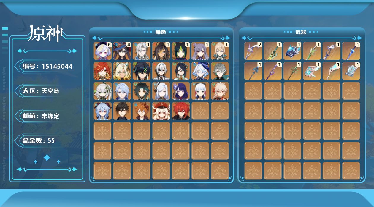 0命阿蕾奇诺,0命闲云,0命芙宁娜,1命那维莱特,1命迪希雅,0命艾尔海森,0命纳西妲,1命提纳里,0命神里绫人,0命申鹤,0命雷电将军,0命枫原万叶,0命神里绫华,0命钟离,0命甘雨,0命魈,0命可莉,0命达达利亚,1命刻晴,满命七七,1命琴,4命莫娜,0命迪卢克,0命基尼奇,0命希诺宁,0命玛薇卡,精1万世流涌大典,精1裁叶萃光,精1若水,精1波乱月白经津,精1息灾,精1薙草之稻光,精1四风原典,精1和璞鸢,精1天空之翼,精2阿莫斯之弓,精1天空之卷,精1山王长牙