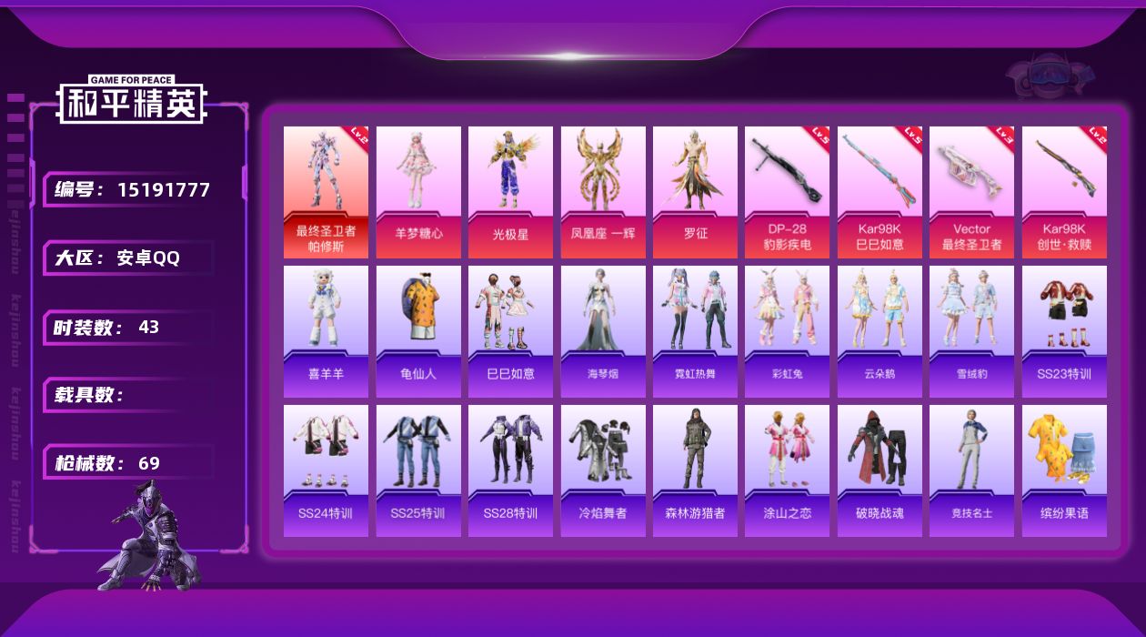 - [12755643]2级瑞拉!小丑女!巧克力三姐妹!苹果 手Q-1神装-15粉装-15特效枪-4载具-5粉色飞行器-99766热力值-16王牌印记-224套装-297枪皮 【红色神装等级】:圣域龙灵-瑞拉(二级) 【红色角色神装】:圣域龙灵-瑞拉 【热门品类】:粉装-缤纷油彩,粉装-繁龙极客,套装-浪漫天命,套装-赤蝎幽灵,套装-都市猎人,套装-深海小丑鱼,套装-奇异狩猎者,套装-胖达圆圆,套装-动感兔斯基人偶服,套装-龟仙人,套装-潮萌小黄鸭,套装-暗影哥特,角色-Mark.06 【粉色载具】:虚妄之影(炫耀紫),合金龙骨(蓝),护世瑞兽,黑曜夜骑 【粉色套装】:粉装-幻影战神,粉装-未来战士,粉装-甜心巧克力,粉装-宝贝奶油派,粉装-天使彩虹糖,粉装-智能音符,粉装-缤纷油彩,粉装-新星烈龙,粉装-彩虹鹿灵,粉装-山涧鹿灵,玩偶服-猪猪侠,粉装-繁龙极客,粉装-星穹咏叹调,角色-狂魅哈莉,角色-绯穹魔姬 【粉色枪皮等级】:AKM-炫紫旋律(五级),AKM-绿萝繁花(五级),SCAR-L-锦绣绵绵(五级),M416-五爪金龙(五级),M416-电玩时刻(五级),M416-灵猫魔法师(六级),AUG-星梦奇缘(三级),UMP45-量子极限(五级),Kar98K-巳巳如意(五级),Kar98K-圣域龙灵(三级),Mk14-爆裂游戏(五级),SLR-暗夜玫瑰(三级),DP-28-豹影疾电(五级),MG-36-幻彩电音(四级),破片手榴弹-热量炸弹(七级) 【粉色枪皮】:AKM-炫紫旋律,AKM-绿萝繁花,SCAR-L-锦绣绵绵,M416-五爪金龙,M416-电玩时刻,M416-灵猫魔法师,AUG-星梦奇缘,UMP45-量子极限,Kar98K-巳巳如意,Kar98K-圣域龙灵,Mk14-爆裂游戏,SLR-暗夜玫瑰,DP-28-豹影疾电,MG-36-幻彩电音,破片手榴弹-热量炸弹 【粉色飞行器】:镜光幻境飞行翼,镜域双华-灵镜之阶,万象金身飞行器,圣域金龙飞行器,灵猫魔法师飞行器 【粉色降落伞】:极限特训降落伞,未来战士降落伞,甜心宝贝降落伞,梦幻火箭降落伞,金风玉露降落伞,暗夜玫瑰降落伞,林间仙鹿降落伞,碧影闪光降落伞,旋转彩虹降落伞,飒粉甜心降落伞,江南烟雨降落伞,星梦奇缘降落伞,金丰海韵降落伞,盛世惊鸿降落伞,戏水时光降落伞,圣域龙灵降落伞,星穹咏叹调降落伞,双重狂想降落伞,最终圣卫