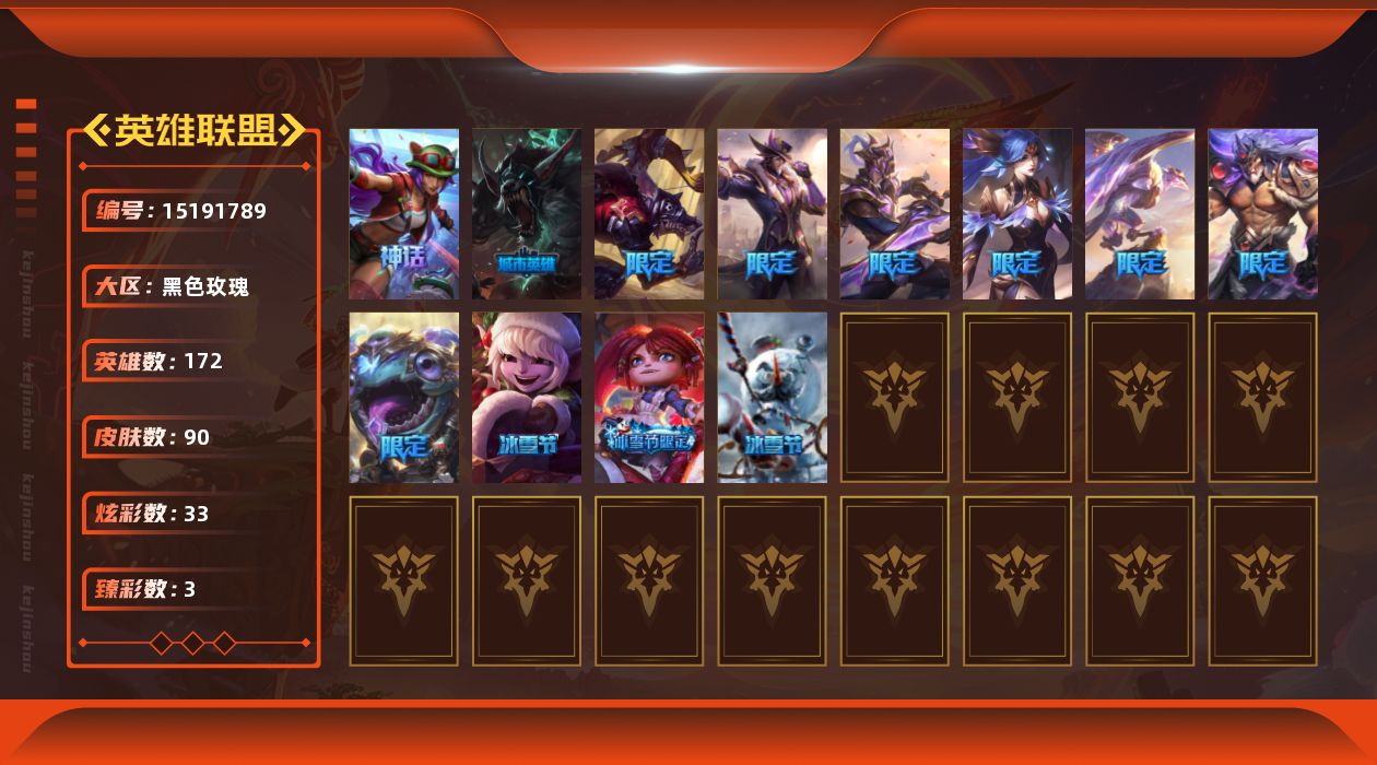 [15191789]【特价出售/店主推荐】未定级段位-172英雄-90皮肤-33炫彩-0终极-1神话-13限定-11传说-15史诗