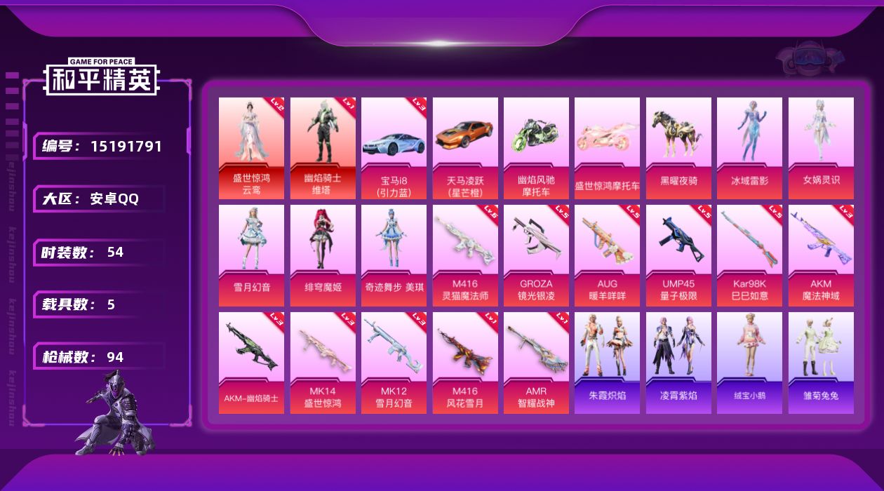 [15191791]扭蛋碎片708【暑期末清货/特价急出/永久包赔】:安卓 手Q-2红装-5粉装-11特效枪-5载具-4.4w热力值-1印记-54套装-94枪皮【角色神装等级】:盛世惊鸿-云鸾(二级),幽焰骑士-维塔(一级)【稀有载具】:宝马i8(引力蓝),天马凌跃(星芒橙),幽焰风驰摩托车,盛世惊鸿摩托车,黑曜夜骑【稀有载具等级】:宝马i8(引力蓝)(三级)【特效枪等级】:AKM-魔法神域(三级),AKM-幽焰骑士(三级),M416-风花雪月(一级),M416-灵猫魔法师(六级),GROZA-镜光银凌(五级),AUG-暖羊咩咩(五级),UMP45-量子极限(五级),Kar98K-巳巳如意(五级),Mk14-盛世惊鸿(三级),AMR-智耀战神(一级),MK12-雪月幻音(三级)【优质套装】:角色-冰域雷影,角色-女娲灵识,粉装-雪月幻音,角色-绯穹魔姬,角色-奇迹舞步 美琪【优质飞行器】:魔法神域飞行器,幽焰列车飞行器,脆鲨七海飞行器,凤舞九天飞行器,灵猫魔法师飞行器
