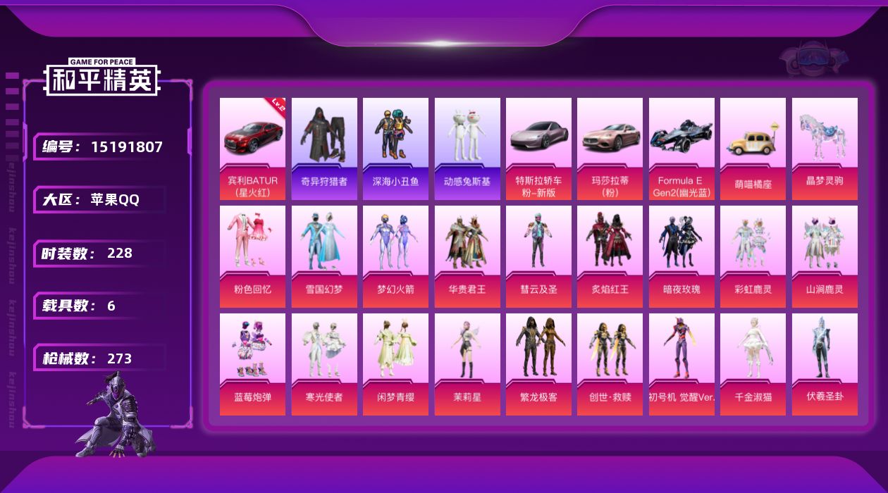 [15191807]【暑期末清货/特价急出/永久包赔】:苹果 手Q-22粉装-8特效枪-6载具-10.5w热力值-15印记-228套装-273枪皮【热门品类】:套装-深海小丑鱼,套装-小丑鱼,套装-奇异狩猎者,套装-动感兔斯基人偶服【稀有载具】:特斯拉Roadster(沁心粉),玛莎拉蒂Ghibli(粉),宾利BATUR(星火红),Formula E Gen2(幽光蓝),萌喵橘座,晶梦灵驹【稀有载具等级】:宾利BATUR(星火红)(二级)【特效枪等级】:AKM-梦之光华(六级),SCAR-L-童趣迷兔(七级),M416-心之恋语(七级),UMP45-恐龙拽拽(七级),Kar98K-伏魔团(五级),Kar98K-巳巳如意(五级),SLR-暗夜玫瑰(五级),SPAS-12-蜜语绒猫(三级)【优质套装】:粉装-粉色回忆,粉装-雪国幻梦,粉装-梦幻火箭,粉装-华贵君王,粉装-彗云及圣,粉装-炙焰红王,粉装-暗夜玫瑰,粉装-彩虹鹿灵,粉装-山涧鹿灵,粉装-蓝莓炮弹,粉装-寒光使者,粉装-闲梦青缨,角色-茉莉星,粉装-繁龙极客,套装-创世·救赎,角色-初号机 觉醒Ver.,角色-千金淑猫,角色-伏羲圣卦,角色-女娲灵识,角色-晶梦幻蝶,粉装-幻彩电音,角色-荧海星豚【优质飞行器】:酣梦熊熊飞行器,伏魔团飞行器,相思残雪飞行器,繁龙极客飞行器
