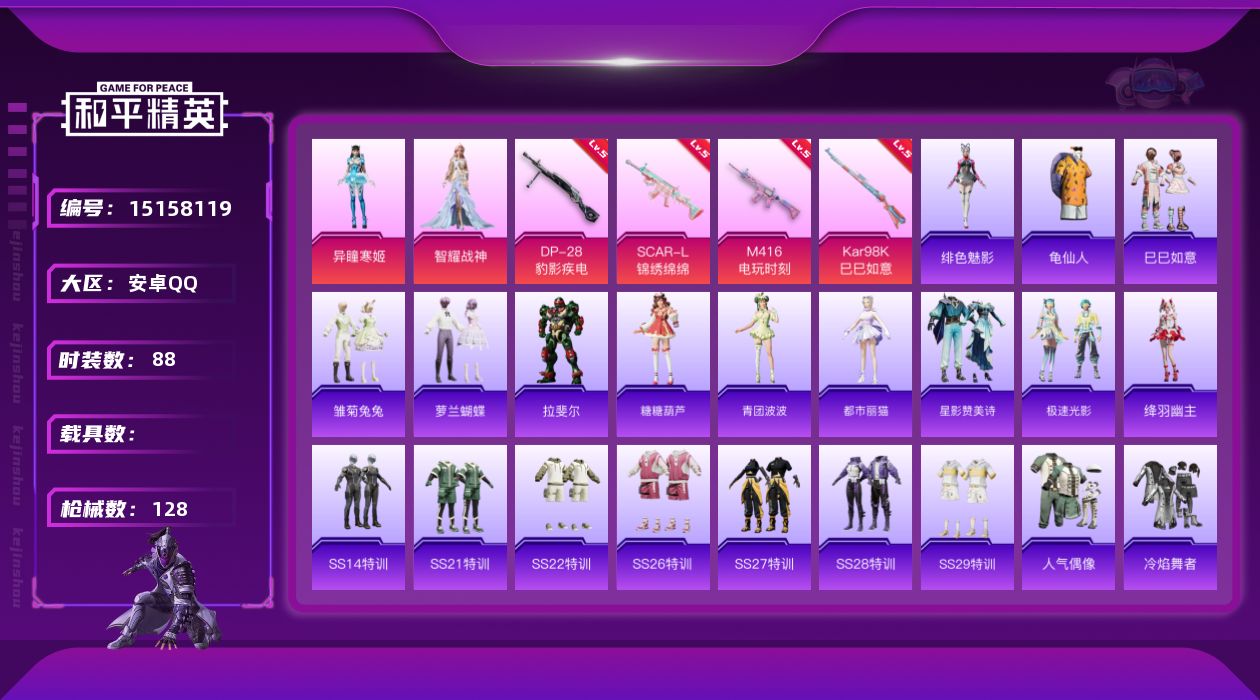 [15158119]安卓 手Q-2粉装-4特效枪-0载具-2粉色飞行器-34312热力值-9王牌印记-88套装-128枪皮 【热门品类】:套装-龟仙人 【粉色套装】:角色-智耀战神,角色-异瞳寒姬 【粉色枪皮等级】:SCAR-L-锦绣绵绵(五级),M416-电玩时刻(五级),Kar98K-巳巳如意(五级),DP-28-豹影疾电(五级) 【粉色枪皮】:SCAR-L-锦绣绵绵,M416-电玩时刻,Kar98K-巳巳如意,DP-28-豹影疾电 【粉色飞行器】:百变魔方飞行器 【粉色降落伞】:碧影闪光降落伞,音爆索尼克降落伞,第五大道降落伞,江南烟雨降落伞,英伦信使降落伞,时光之吻降落伞,荧海星豚降落伞,极意拳锋降落伞 【稀有套装】:套装-龟仙人,套装-巳巳如意,套装-雏菊兔兔,套装-萝兰蝴蝶,角色-拉斐尔,套装-糖糖葫芦,套装-青团波波,角色-都市丽猫,套装-星影赞美诗,套装-极速光影,角色-绛羽幽主,角色-绯色魅影,套装-炫彩糖果 【稀有枪皮】:AKM-夜灯,AKM-破晓战魂,AKM-霓虹街区,AKM-极光猎影,M16A4-幻世战舞者,M16A4-莲影清波,SCAR-L-夜灯,SCAR-L-玉兔迎春,SCAR-L-红色方程式,M416-糯团青竹,M416-红色方程式,M416-蓝色火焰,GROZA-恐龙拽拽,AUG-耀粉歌者,QBZ-银河战甲,M762-天降萌叽,Mk47-炫光之旅,蜜獾-绯穹魔姬,UZI-啾咪啾咪,UZI-天降萌叽,UZI-幻影飞狐,UMP45-夜灯,UMP45-生命誓言,UMP45-极意拳锋,Vector-焰鹰斗篷,Vector-彩虹符号,P90-巳巳如意,Kar98K-六号树人,Kar98K-彩虹符号,AWM-焰鹰斗篷,AMR-鬼刀,MK20-H-樱桃泡泡,M200-六号稻草人,S686-彩虹符号,S686-生命誓言,S686-巳巳如意,S1897-荧海星豚,S12K-玩趣呆呆,S12K-夜灯,S12K-蓝晶绮麟,S12K-智耀战神,DBS-焰鹰斗篷,DBS-圣堂之誓,DBS-彩虹符号,M249-百万伏特,M249-破晓战魂,M249-莲影清波,DP-28-焰鹰斗篷,短管霰弹-星穹咏叹调,平底锅-咒蚀之裁,破片手榴弹-巳巳如意 【其他套装】:套装-SS14特训,套装-SS21特训,套装-SS22特训,套装-SS26特训,套装-SS27特训,套装-SS28特训,套装-