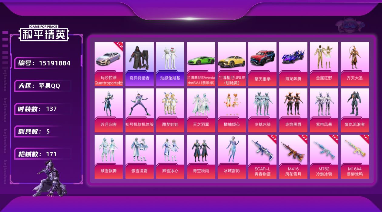 [15191884]【暑期末清货/特价急出/永久包赔】:苹果 手Q-16粉装-6特效枪-5载具-6.7w热力值-9印记-137套装-171枪皮【稀有载具】:兰博基尼Aventador SVJ(翡翠绿),兰博基尼URUS(明艳黄),玛莎拉蒂Quattroporte(幻星粉),擎天重拳,海龙奔腾【热门品类】:套装-奇异狩猎者,角色-军刀雅典娜,套装-动感兔斯基人偶服【稀有载具等级】:玛莎拉蒂Quattroporte(幻星粉)(二级)【特效枪等级】:M16A4-垂柳戏鸭(一级),SCAR-L-青春物语(七级),M416-风花雪月(七级),M762-冷魅冰骑(七级),Vector-环太平洋(一级),Kar98K-巳巳如意(一级)【优质套装】:粉装-金属狂野,粉装-齐天大圣,粉装-吟月归客,角色-初号机款机体服,粉装-酣梦娃娃,粉装-天之羽翼,粉装-橘柚倾心,粉装-冷魅冰骑,粉装-赤焰黑爵,粉装-紫电风暴,角色-复仇流浪者,粉装-绒雪飘舞,粉装-傲雪凌霜,粉装-霁雪冰心,粉装-青空秋雨,角色-冰域雷影【优质飞行器】:齐天大圣飞行器,天之羽翼飞行器,冠军兔兔飞行器