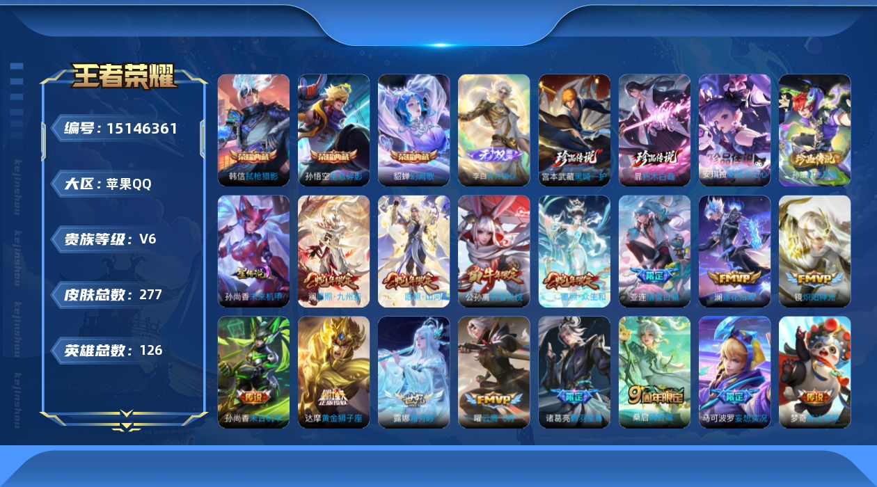 [15146361]【店主推荐捡漏号!可直接换绑】苹果Q-V8-最强王者段位-126英雄-277皮肤-3典藏-1星元-1无双-4珍品传说-17传说-80史诗