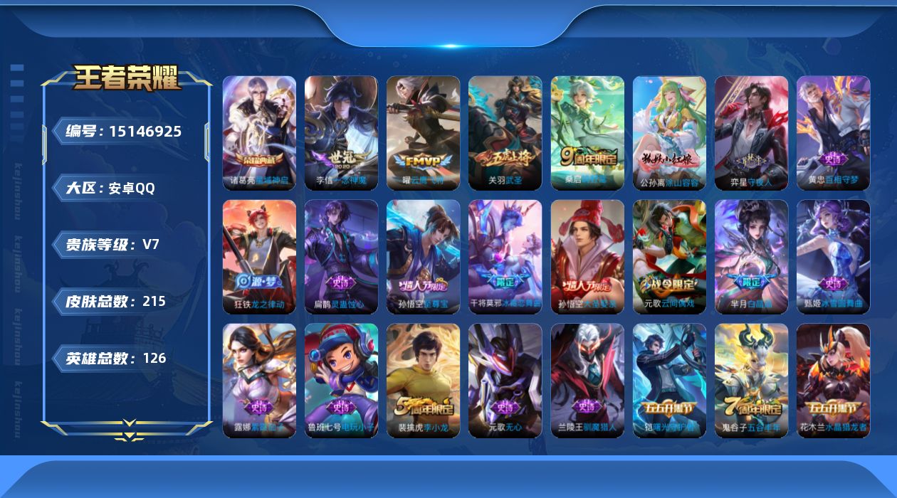 - [12083797]V8 1典藏 1无双 15传说 125英雄 273皮肤 可修改实名 优质装备:大秦宣太后,天机白泽,黄金狮子座,冠军飞将,云鹰飞将(小将军),炽阳神光,一念神魔,末日机甲-孙尚香(绿蚂蚱),地狱火,超时空战士-狄仁杰,记忆之芯(机甲兔),涂山容容 传说皮:云诺千山,祥瑞亨通 珍宝阁皮:蔷薇恋人 限定皮:白虎志(电光耗子),神威(电光马子),飞衡(韩信年限),遇见飞天,高山流水,武圣,梁祝,李小龙,辉光之辰,大圣娶亲,冰霜恋舞曲,寅虎·赤拳(老虎年限) 史诗皮:绮世丹青,龙之律动,百相守梦-周瑜,破空之剑,战舞者,涂山红红,东方月初,琥珀纪元伽罗,百相守梦-黄忠,黄金分割率,特工魅影,千年之狐,永昼,魅语,偶像歌手,暗夜猫娘,猫狗日记-孙策,时之恋人-孙尚香,乱世虎臣,节奏热浪,修罗,女仆咖啡,摇滚巨星,水果甜心,天才门将,心灵骇客,功夫厨神,德古拉伯爵,暗隐猎兽者,幽灵船长,鬼剑武藏,舞动绿茵,地狱岩魂,纤云弄巧,缤纷独角兽,乘风破浪,逐浪之夏,水晶猎龙者,曙光守护者,金属风暴,原初追逐者,圣诞狂欢,圣诞恋歌,鹰眼统帅,王者之锤,暗夜贵公子,魅力维加斯,黎明之约,未来纪元-赵云