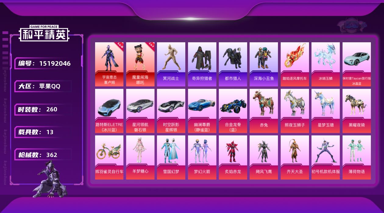 [15192046]素材身法号/宇宙意志-塞卢姆(四级)/老木乃伊/地铁满天赋/M416-至情至圣(九级) 苹果 手Q-2神装-26粉装-24特效枪-13载具-15粉色飞行器-14.2w热力值-16王牌印记-260套装-362枪皮【红色神装等级】:魔童闹海-哪吒(一级),宇宙意志-塞卢姆(四级)【热门品类】:粉装-雪国幻梦,粉装-梦幻火箭,套装-浪漫天命,套装-都市猎人,套装-冥河战士,套装-深海小丑鱼,套装-小丑鱼,套装-奇异狩猎者,套装-金羽特工,套装-暗夜行者,角色-忠猛周仓,角色-忠真马岱,角色-忠义严颜,套装-龟仙人,套装-暗影哥特,角色-8号机,角色-Mark.06,大砍刀-青龙偃月刀,撬棍-龙胆亮银枪【粉色载具】:路特斯ELETRE(冰川蓝),星河领航(磐石银),时空跃影(星辉银),保时捷Taycan 旅行版(冰晶蓝),幽澜尊爵(静谧蓝),合金龙骨(蓝),踏焰逐风摩托车,赤兔,照夜玉狮子,星梦玉骢,黑曜夜骑,冰绡玉鳞,辉羽雀灵自行车【粉色套装】:粉装-雪国幻梦,粉装-梦幻火箭,粉装-炙焰赤龙,粉装-飓风飞鹰,粉装-齐天大圣,角色-初号机款机体服,粉装-薄荷物语,粉装-恐龙拽拽,粉装-赤焰黑爵,粉装-紫电风暴,粉装-垂柳戏鸭,粉装-寒光使者,粉装-暗夜鎏金,粉装-雪梅暗香,粉装-挚爱序曲,角色-冰炎战车,角色-紫钛骑兵,角色-圣堂之誓,角色-引力星,套装-创世·救赎,角色-星梦奇缘,角色-初号机 觉醒Ver.,角色-狂花道·不知火舞,角色-千金淑猫,角色-狂魅哈莉,角色-羊梦糖心【粉色枪皮等级】:AKM-梦之光华(六级),AKM-绿萝繁花(五级),SCAR-L-梦幻火箭(七级),SCAR-L-锦绣绵绵(五级),M416-五爪金龙(一级),M416-风花雪月(三级),M416-至情至圣(九级),GROZA-镜光银凌(五级),AUG-暖羊咩咩(五级),M762-青锋波束(五级),Famas-初号机 觉醒Ver.(五级),UMP45-量子极限(五级),UMP45-宇宙意志(三级),Vector-最终圣卫者(一级),汤姆逊-热量炸弹(五级),P90-魔童闹海 敖丙(二级),Kar98K-巳巳如意(五级),Kar98K-圣域龙灵(三级),Mk14-甜梦熊击(五级),DP-28-豹影疾电(五级),MG-36-沧焰双生(五级),爆炸猎弓-雪梅暗香(二级)【粉色飞行器】:梦幻火箭飞行器,