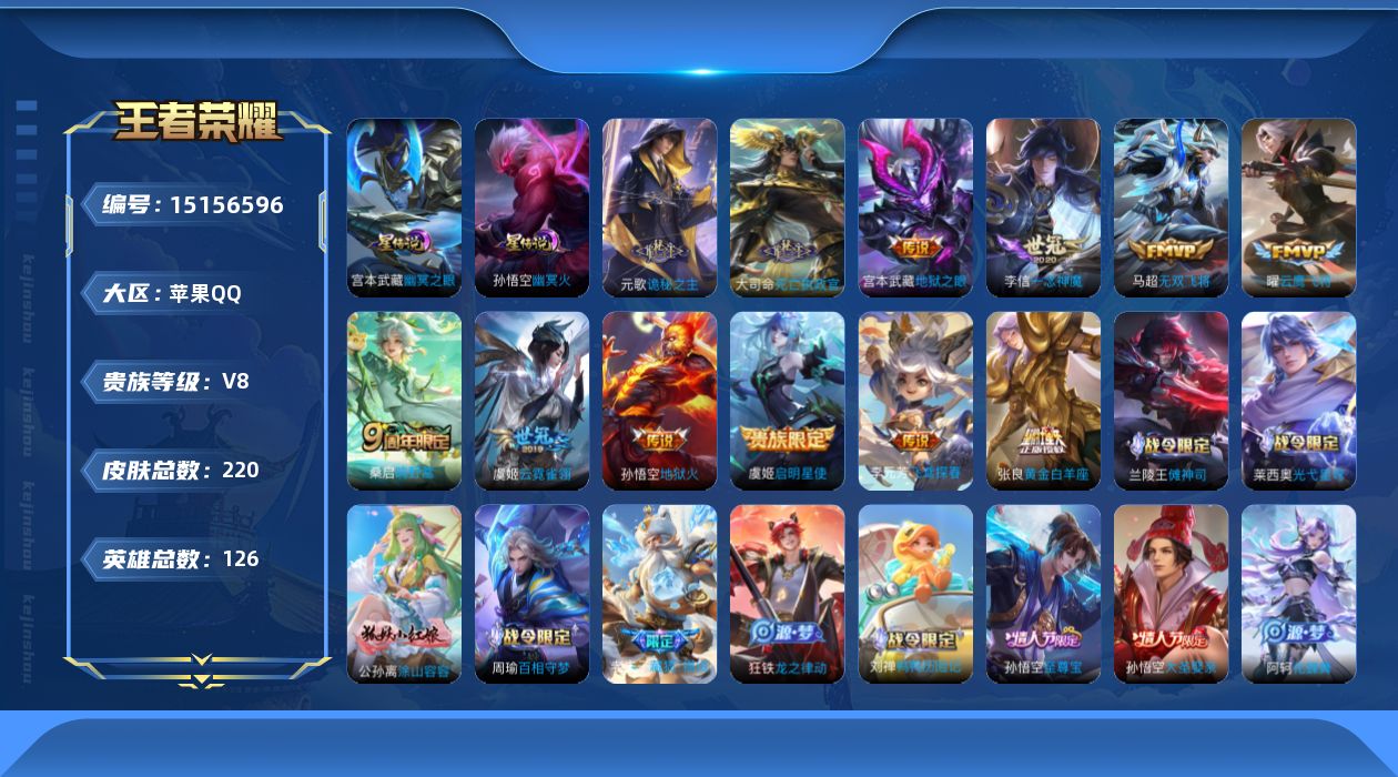 [15156596]【店主推荐捡漏号!可直接换绑】/游走33段,苹果Q-V8-最强王者段位-126英雄-220皮肤-14传说-55史诗