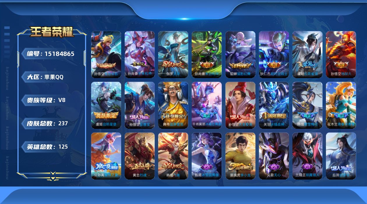 苹果Q-V8-至尊星耀III段位-125英雄-237皮肤-1典藏皮肤-7传说-59史诗