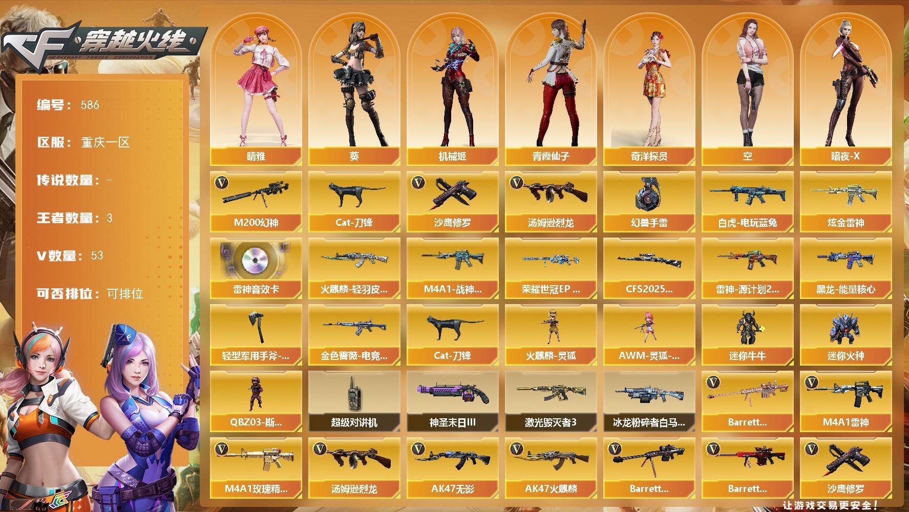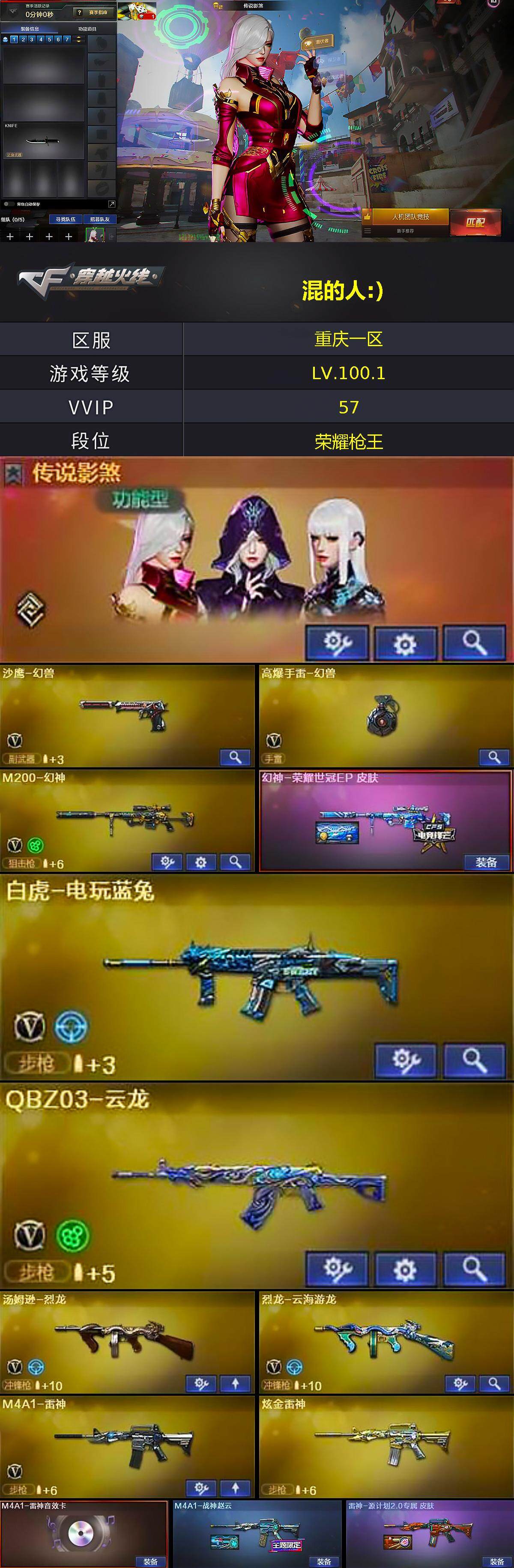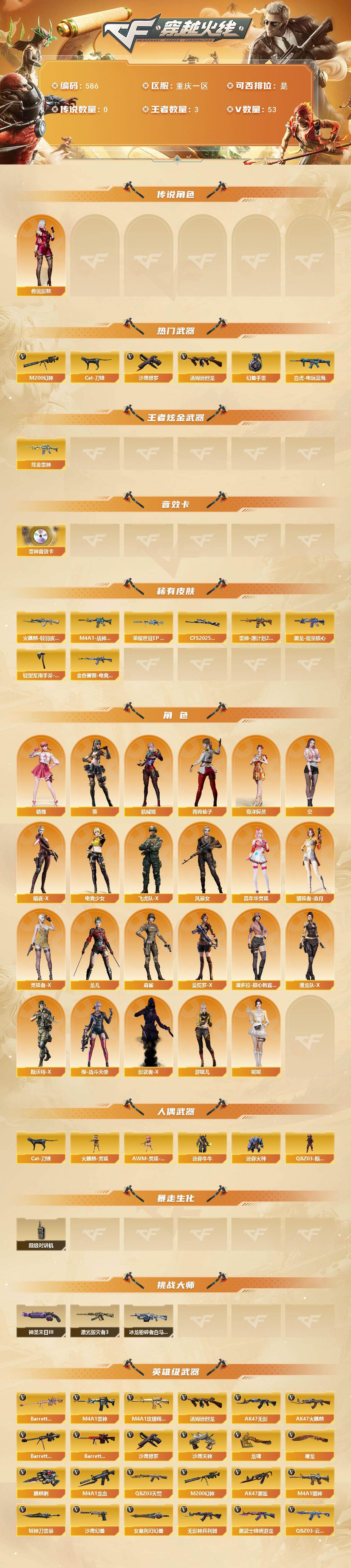 [15001940]重庆一区-53V-3王者-1炫金 【传说角色】:传说影煞 【热门武器】:M200-幻神,白虎-电玩蓝兔,Cat-刀锋,汤姆逊-烈龙,沙鹰-修罗,高爆手雷-幻兽 【王者炫金武器】:炫金雷神 【音效卡】:M4A1-雷神音效卡 【皮肤】:幻神-荣耀世冠EP 皮肤,金色蔷薇-电竞之星 皮肤,星神-CFS2025 皮肤,M4A1-战神赵云,雷神-源计划2.0专属 皮肤,火麒麟-轻羽皮肤,黑龙-能量核心,轻型军用手斧-再燃火线 【角色】:葵,晴雅,机械姬,妮妮,奇洋探员,空,暗夜-X,电竞少女,飞虎队-X,风暴女,嘉年华灵狐,猎狐者-追月,灵狐者-X,龙儿,麻雀,曼陀罗-X,潘多拉-甜心教官,潜龙队-X,青霞仙子,斯沃特-X,樱-战斗天使,影武者-X,游珑儿 【人偶武器】:火麒麟-灵狐,AWM-灵狐-15周年嘉年华,Cat-刀锋,迷你牛牛,迷你火种,QBZ03-斯沃特 【暴走生化】:超级对讲机 【挑战大师】:冰龙粉碎者-白马银枪,激光毁灭者III,神圣爆裂者-末日III 【英雄级武器】:AK47-火麒麟,M4A1-雷神,AK47-无影,AK47-黑鲨,M4A1-龙血,QBZ03-天罚,无影-神兵利器,QBZ03-云龙,黑武士-锦绣游龙,九霄圣角,M4A1-玫瑰精灵,M4A1-猎神,王者之势-觉醒版,AK47-B-战神,白虎-电玩蓝兔,Barrett-毁灭,Barrett-极光,M200-幻神,Barrett-金色蔷薇,汤姆逊-烈龙,烈龙-云海游龙,沙鹰-修罗,沙鹰-天神*2,沙鹰-幻兽,屠龙,龙啸*2,麒麟刺,斩神刀-雷暴,女皇利刃-幻兽,麒麟刺-百战金芒,王者之锋-觉醒版,高爆手雷-幻兽,高爆手雷-雷暴,高爆手雷-云龙*2,手雷-热带奇洋,闪光弹-幻兽,闪光弹-雷暴,闪光弹-云龙*2,烟雾弹-幻兽,烟雾弹-雷暴,烟雾弹-云龙*2,烟雾弹-荣耀世冠EP 【道具】:CFS限定背包,全能枪王背包,奇洋探员-海龟背包,战舰背包,虎牙炫彩背包,黄金曼提柯尔的背包,女皇终结者-魔龙之吻,救世主-黑桃战神,绿色巨人,灵魂忍者*2,变异宝贝,迷雾幽灵*2,生化弹匣,夺命之镰,防化服*3,金色流光-枪王排位,枪王排位28赛季金色流光,枪王排位29赛季金色流光,萌萌小葵表情,电玩兔兔表情,C4-红龙,防弹头盔*3,防弹衣*3,C4工具钳*4,手雷包*4 【特殊枪械】:1烈龙