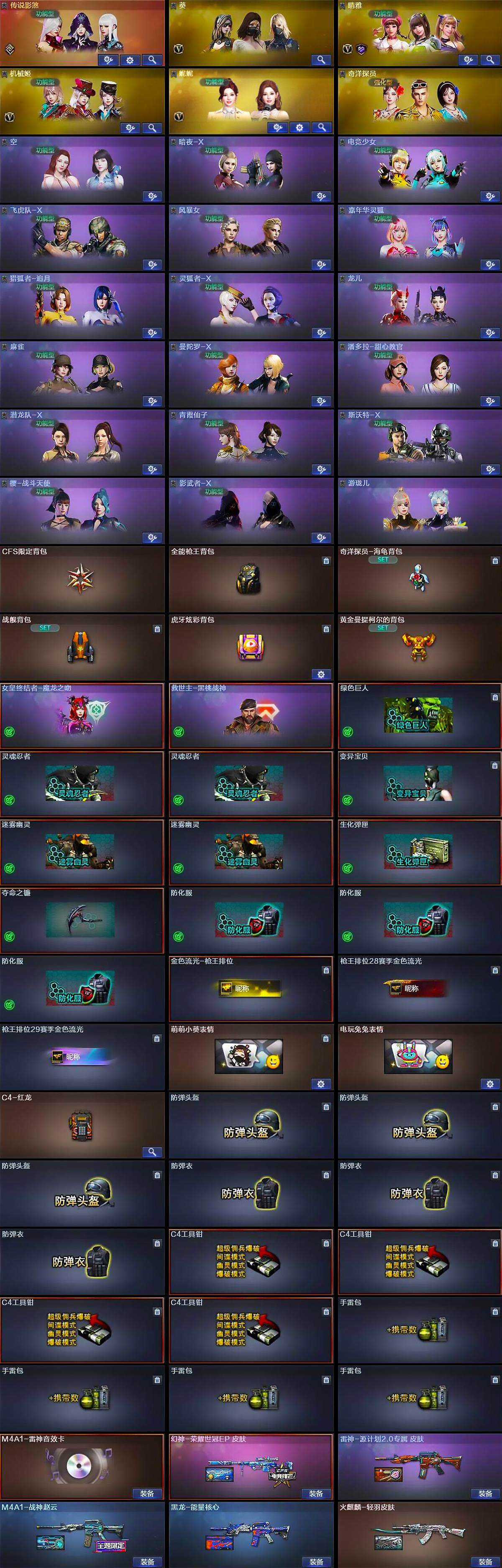 【道具】:CFS限定背包,全能枪王背包,奇洋探员-海龟背包,战舰背包,虎牙炫彩背包,黄金曼提柯尔的背包,女皇终结者-魔龙之吻,救世主-黑桃战神,绿色巨人,灵魂忍者*2,变异宝贝,迷雾幽灵*2,生化弹匣,夺命之镰,防化服*3,金色流光-枪王排位,枪王排位28赛季金色流光,枪王排位29赛季金色流光,萌萌小葵表情,电玩兔兔表情,C4-红龙,防弹头盔*3,防弹衣*3,C4工具钳*4,手雷包*4