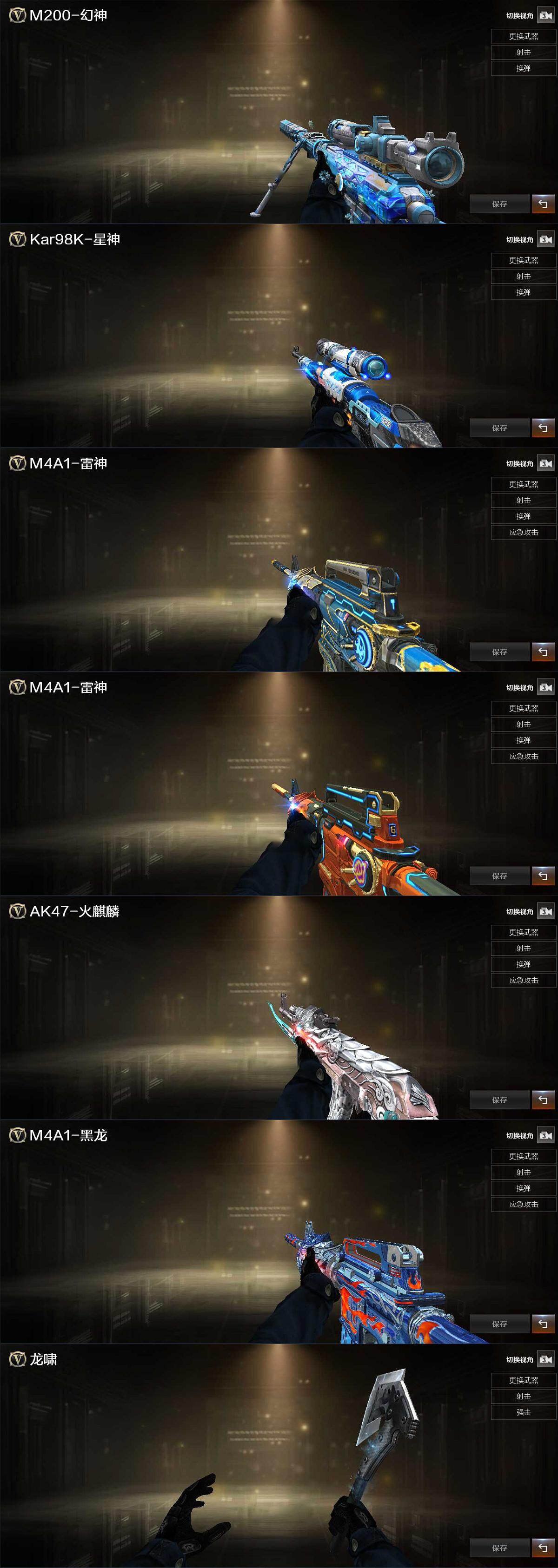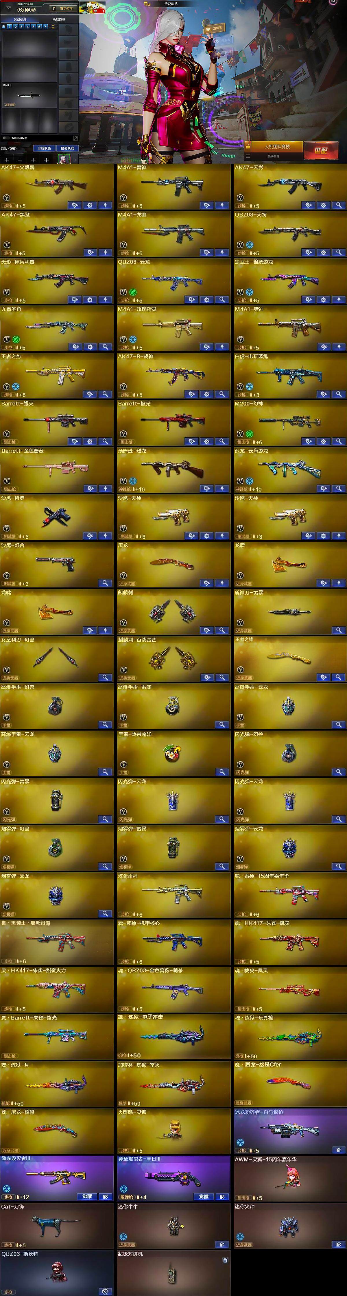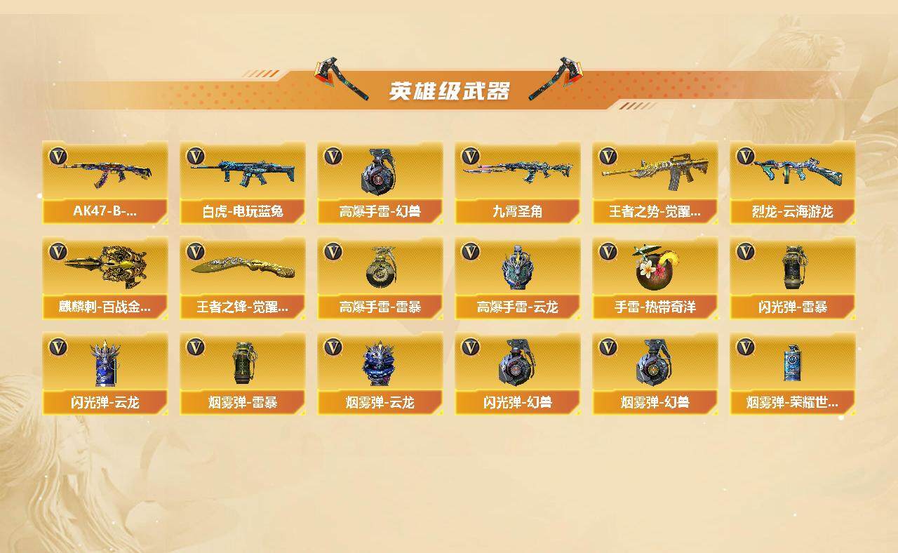 【英雄级武器】:AK47-火麒麟,M4A1-雷神,AK47-无影,AK47-黑鲨,M4A1-龙血,QBZ03-天罚,无影-神兵利器,QBZ03-云龙,黑武士-锦绣游龙,九霄圣角,M4A1-玫瑰精灵,M4A1-猎神,王者之势-觉醒版,AK47-B-战神,白虎-电玩蓝兔,Barrett-毁灭,Barrett-极光,M200-幻神,Barrett-金色蔷薇,汤姆逊-烈龙,烈龙-云海游龙,沙鹰-修罗,沙鹰-天神*2,沙鹰-幻兽,屠龙,龙啸*2,麒麟刺,斩神刀-雷暴,女皇利刃-幻兽,麒麟刺-百战金芒,王者之锋-觉醒版,高爆手雷-幻兽,高爆手雷-雷暴,高爆手雷-云龙*2,手雷-热带奇洋,闪光弹-幻兽,闪光弹-雷暴,闪光弹-云龙*2,烟雾弹-幻兽,烟雾弹-雷暴,烟雾弹-云龙*2,烟雾弹-荣耀世冠EP