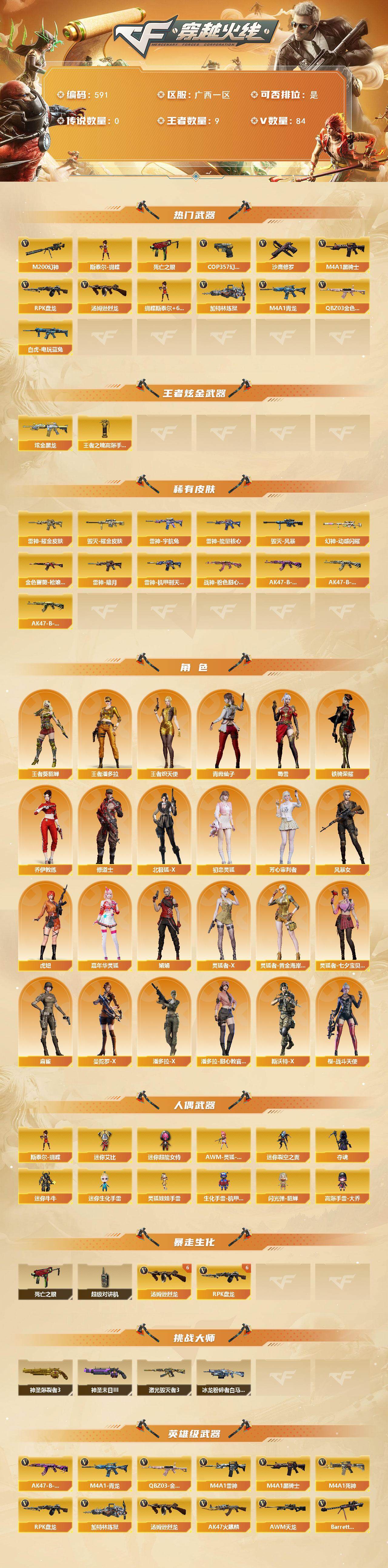 [15002336]广西一区-84V-9王者-1炫金 【热门武器】:QBZ03-金色蔷薇,M4A1-青龙,M200-幻神,死亡之眼,白虎-电玩蓝兔,M4A1-黑骑士,汤姆逊-烈龙*6,RPK-盘龙*6,加特林-炼狱,斯泰尔-蝴蝶,COP 357-幻灵*2,沙鹰-修罗*4 【王者炫金武器】:炫金黑龙,王者之魄高爆手雷*2 【皮肤】:幻神-动感闪耀 皮肤,金色蔷薇-枪娘阿敏 皮肤,雷神-暗月,雷神-能量核心,雷神-耀金皮肤,雷神-机甲刑天皮肤,雷神-宇航兔皮肤,毁灭耀金皮肤,毁灭-风暴,战神-粉色甜心皮肤,AK47-B-常胜将军-曹操,AK47-B-常胜将军-刘备,AK47-B-常胜将军-孙权 【角色】:王者-葵-貂蝉,王者潘多拉,王者炽天使,乔伊教练,修道士,北极狐-X,初恋灵狐,芳心审判者,风暴女*2,虎妞,嘉年华灵狐,娟娟,灵狐者-X,灵狐者-黄金海岸,灵狐者-七夕宝贝,麻雀,曼陀罗-X,潘多拉-X,潘多拉-甜心教官,青霞仙子,斯沃特-X,蜀雪,铁骑荣耀,樱-战斗天使 【人偶武器】:斯泰尔-蝴蝶,AWM-灵狐-15周年嘉年华,迷你裂空之翼,夺魂,迷你牛牛,迷你生化手雷,生化手雷-机甲核心,闪光弹-貂蝉,高爆手雷-大乔,迷你艾比,迷你超能女侍,灵狐娃娃手雷 【暴走生化】:死亡之眼,超级对讲机 【挑战大师】:神圣爆裂者III,冰龙粉碎者-白马银枪,激光毁灭者III*3,神圣爆裂者-末日III 【英雄级武器】:AK47-火麒麟,M4A1-雷神,M4A1-黑骑士,M4A1-死神,AK47-黑鲨,M4A1-龙血,M4A1-青龙,无影-神兵利器,QBZ03-金色蔷薇,M4A1-猎神*2,烈火-动感闪耀,王者之心-觉醒版,AK-47-猩红传说*4,AK47-B-战神,黑骑士-海王,AK47-B-常胜将军,白虎-电玩蓝兔,王者芳薇-觉醒版,AWM-天龙,Barrett-毁灭,Barrett-极光,M200-幻神,Barrett-朱雀,王者蔷薇-觉醒版,RPK-盘龙*6,加特林-炼狱,炼狱-风暴,汤姆逊-烈龙*6,沙鹰-修罗*4,沙鹰-天神*3,COP 357-幻灵*2,天神-动感闪耀,屠龙,擎天*3,麒麟刺*4,屠龙-动感闪耀,王者之啸-觉醒版*3,王者之击-觉醒版,高爆手雷-幻灵*7,手雷-动感闪耀,闪光弹-幻灵*7,烟雾弹-幻灵*7,M4A1-赤狱骑士 【道具】:全能枪王背包,炫彩背包,热带奇