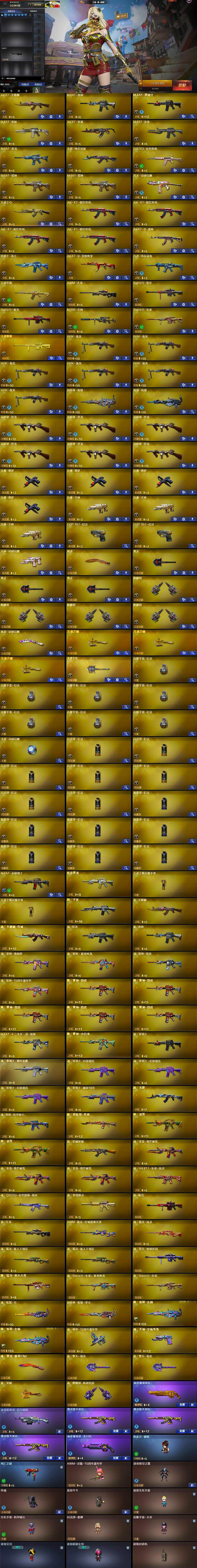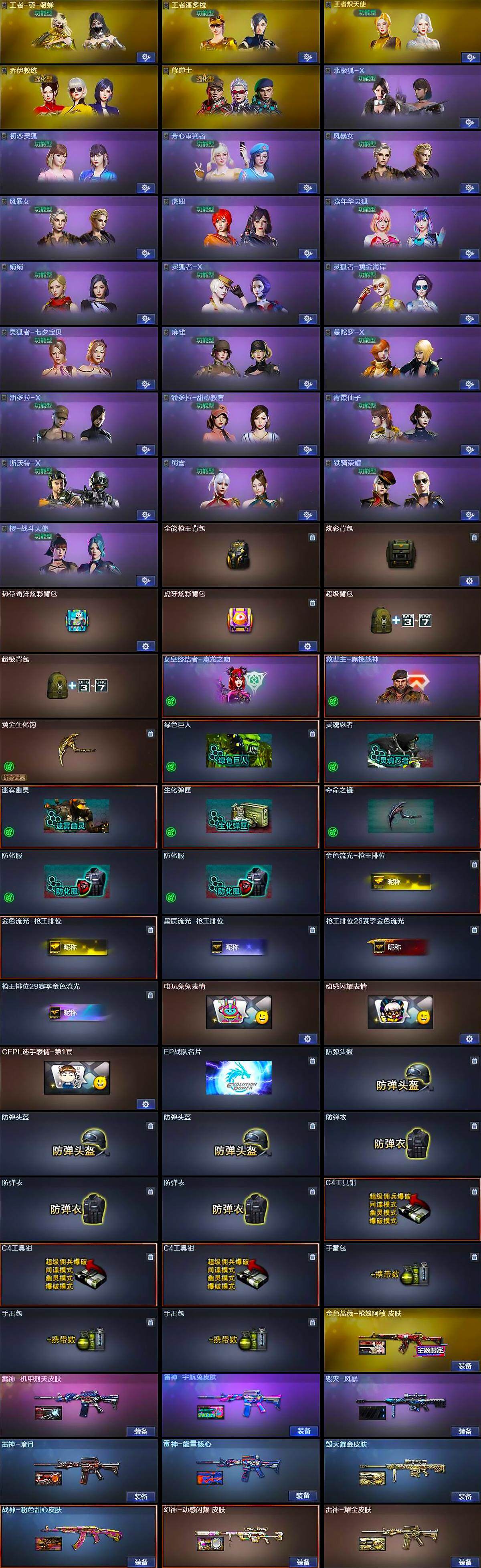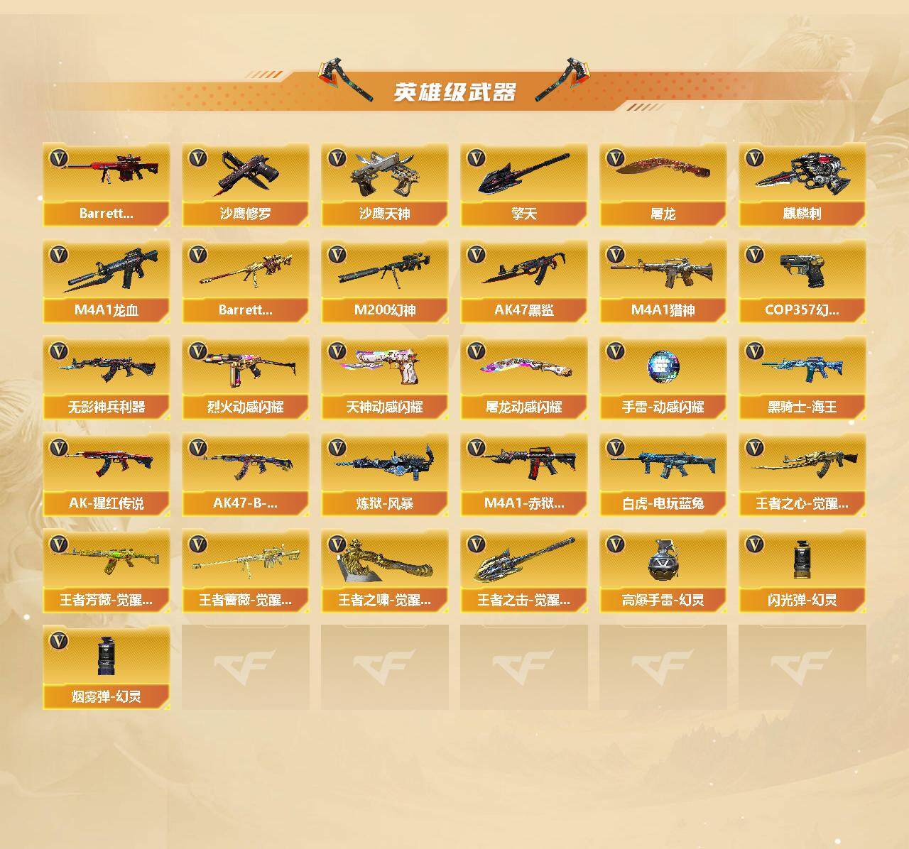 【英雄级武器】:AK47-火麒麟,M4A1-雷神,M4A1-黑骑士,M4A1-死神,AK47-黑鲨,M4A1-龙血,M4A1-青龙,无影-神兵利器,QBZ03-金色蔷薇,M4A1-猎神*2,烈火-动感闪耀,王者之心-觉醒版,AK-47-猩红传说*4,AK47-B-战神,黑骑士-海王,AK47-B-常胜将军,白虎-电玩蓝兔,王者芳薇-觉醒版,AWM-天龙,Barrett-毁灭,Barrett-极光,M200-幻神,Barrett-朱雀,王者蔷薇-觉醒版,RPK-盘龙*6,加特林-炼狱,炼狱-风暴,汤姆逊-烈龙*6,沙鹰-修罗*4,沙鹰-天神*3,COP 357-幻灵*2,天神-动感闪耀,屠龙,擎天*3,麒麟刺*4,屠龙-动感闪耀,王者之啸-觉醒版*3,王者之击-觉醒版,高爆手雷-幻灵*7,手雷-动感闪耀,闪光弹-幻灵*7,烟雾弹-幻灵*7,M4A1-赤狱骑士