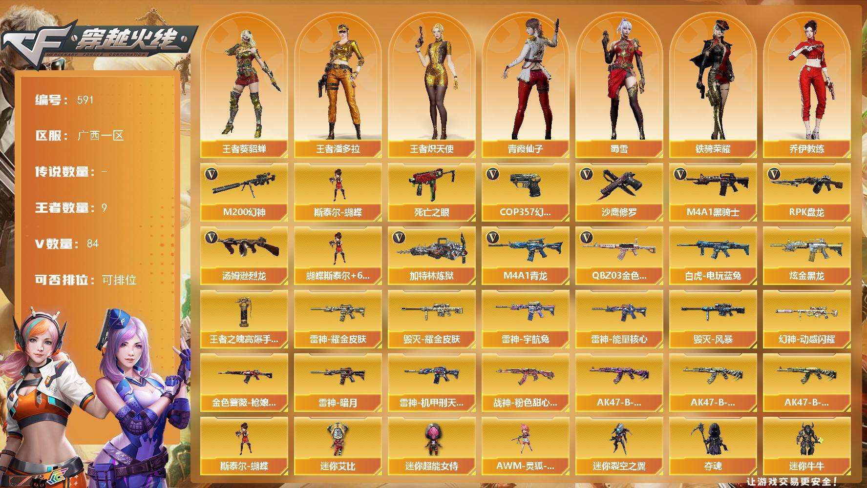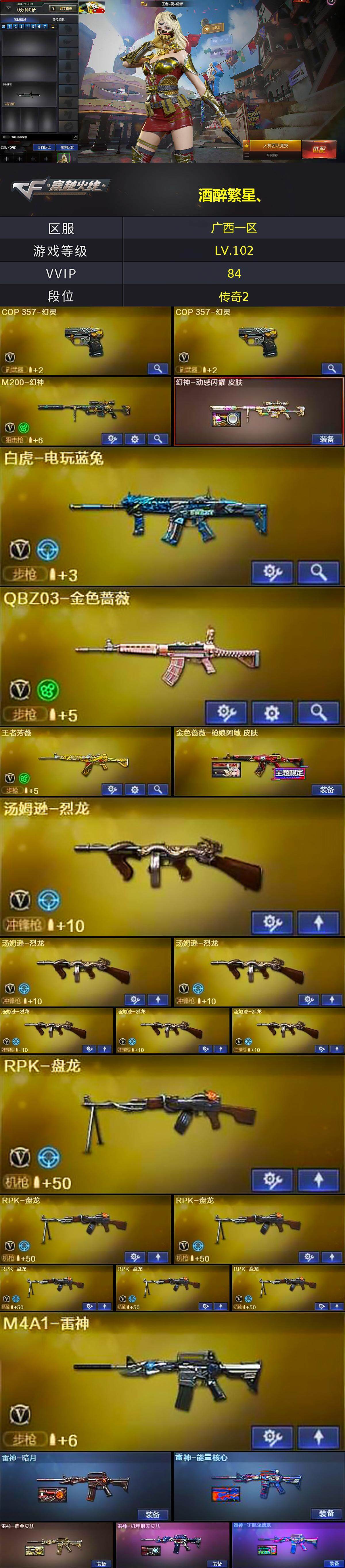 - [12012139]1传说角色 2炫金武器 39V武器 可二次 可修改实名 优质装备:M200-幻神,QBZ03-金色蔷薇,白虎-电玩蓝兔,AK47-火麒麟,M4A1-黑骑士,M4A1-黑龙,Barrett-极光,AWM-裁决,AA-12-雷霆,AN94-超新星,HK417-朱雀,汤姆逊-烈龙,沙鹰-修罗,沙鹰-天神,屠龙,擎天,Barrett-暗月传说,龙啸-烈火龙威,金色蔷薇-古蛇迷踪,修罗-古蛇迷踪,死神-雪域霜狐,Barrett-碧霄极光,麒麟刺-百战金芒,炼狱-百战金芒,机械迷城-穹宇,USP-冥王 排位资格:有 V武器:AK47-B-战神,黑骑士-海王 炫金武器:炫金超新星,炫金天龙