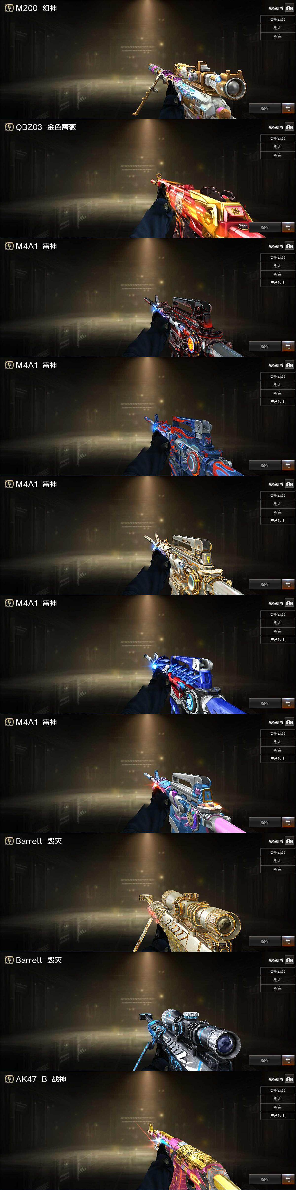 【热门武器】:QBZ03-金色蔷薇,M4A1-青龙,M200-幻神,死亡之眼,白虎-电玩蓝兔,M4A1-黑骑士,汤姆逊-烈龙*6,RPK-盘龙*6,加特林-炼狱,斯泰尔-蝴蝶,COP 357-幻灵*2,沙鹰-修罗*4