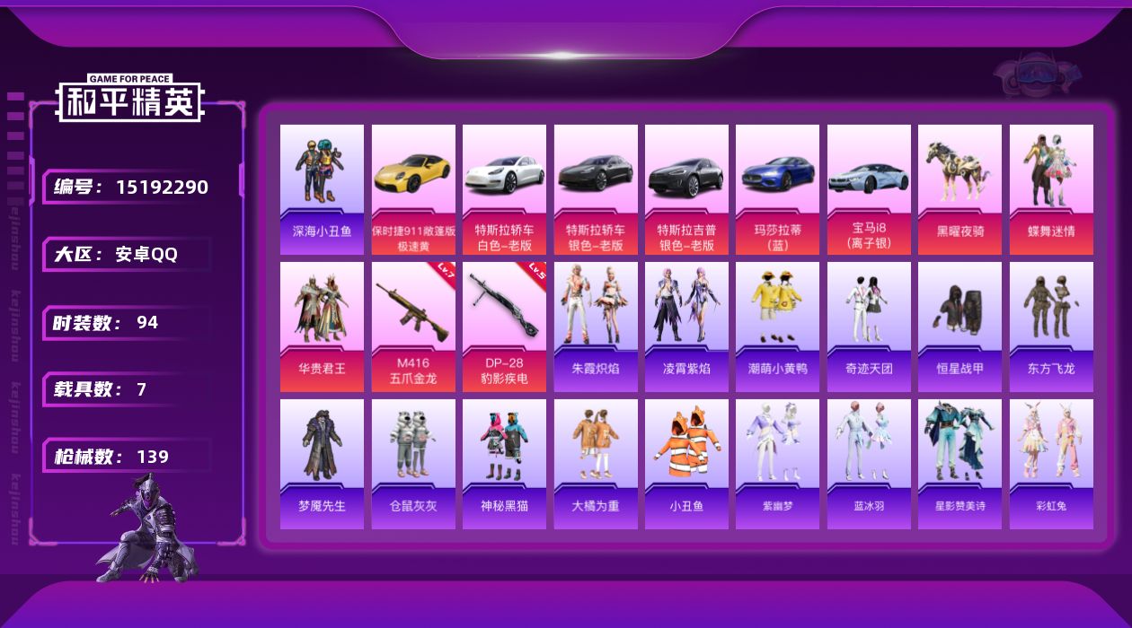 [15192290]【店主推荐捡漏号!可直接换绑】 安卓 手Q-2粉装-2特效枪-7载具-2粉色飞行器-4.9w热力值-1王牌印记-94套装-139枪皮【热门品类】:套装-深海小丑鱼,套装-小丑鱼,套装-潮萌小黄鸭,小恶魔头饰【粉色载具】:特斯拉Model 3(珍珠白),特斯拉Model 3(冷光银),特斯拉Model X(冷光银),玛莎拉蒂Ghibli(蓝),宝马i8(离子银),保时捷911 敞篷版(极黄),黑曜夜骑【粉色套装】:粉装-蝶舞迷情,粉装-华贵君王【粉色枪皮等级】:M416-五爪金龙(七级),DP-28-豹影疾电(五级)【粉色飞行器】:梦幻火箭飞行器,灵猫魔法师飞行器