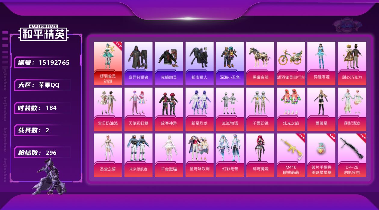 [15192765]【店主推荐捡漏号!可直接换绑】/素材身法号/绝世印记2 苹果 手Q-1神装-18粉装-21特效枪-2载具-9粉色飞行器-10w热力值-10王牌印记-184套装-296枪皮【红色神装等级】:辉羽雀灵-初翊(二级)【热门品类】:套装-浪漫天命,套装-赤蝎幽灵,套装-都市猎人,套装-深海小丑鱼,套装-小丑鱼,套装-奇异狩猎者,套装-龟仙人,套装-暗影哥特,套装-红红火火,角色-8号机,角色-Mark.06,角色-六号稻草人【粉色载具】:黑曜夜骑,辉羽雀灵自行车【粉色套装】:粉装-甜心巧克力,粉装-宝贝奶油派,粉装-天使彩虹糖,粉装-放客神游,粉装-新星烈龙,粉装-岚岚物语,粉装-千面幻镜,粉装-炫光之旅,角色-蔷薇星,粉装-莲影清波,角色-圣堂之誓,粉装-未来领航者,角色-千金淑猫,粉装-星穹咏叹调,粉装-幻彩电音,角色-绯穹魔姬,角色-异瞳寒姬【粉色枪皮等级】:AKM-绿萝繁花(五级),AKM-幽焰骑士(三级),AKM-幻海仙踪(五级),SCAR-L-锦绣绵绵(五级),M416-暖熊萌萌(六级),GROZA-镜光银凌(五级),AUG-暖羊咩咩(五级),UMP45-量子极限(五级),AKS-74U-信仰神谕(一级),AKS-74U-星穹咏叹调(五级),P90-粉樱探戈(五级),Kar98K-巳巳如意(五级),M24-莲影清波(四级),Mk14-甜梦熊击(五级),AMR-炫光之旅(五级),DP-28-豹影疾电(五级),MG3-辉羽雀灵(三级),MG-36-幻彩电音(四级),烟雾弹-电雾迷城(四级),破片手榴弹-瓶中星球(一级),破片手榴弹-美味星星糖(六级)【粉色飞行器】:齐天大圣飞行器,沙丘之主天马,花傲天飞行器,幽焰列车飞行器,雀灵庇佑飞行器,终晖之翼飞行器,灵猫魔法师飞行器,飞天猪飞行器