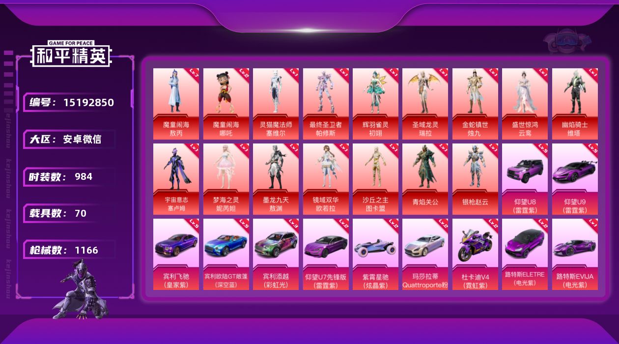 [15192850]16套神装满级红装可随意切换-273粉装-153特效枪-72载具-124粉色飞行器-84万热力值-984套装-1166枪皮 【红色载具】:路特斯ELETRE(电光紫)(二级),路特斯EVIJA(电光紫)(一级),玛莎拉蒂MC20(幻星粉)(一级),玛莎拉蒂Quattroporte(幻星粉)(二级),玛莎拉蒂Grecale(幻星粉)(一级),迈凯伦570S(镭射紫)(一级),迈凯伦570S(炫冰蓝)(一级),宾利添越(彩虹光)(三级),宾利BATUR(星火红)(一级),宾利飞驰(皇家紫)(五级),宾利欧陆GT敞篷(深空蓝)(五级),杜卡迪 Panigale V4(霓虹紫)(二级),布加迪威龙(星云粉)(一级),仰望U8(雷霆紫)(五级),仰望U7(雷霆紫)(二级),仰望U9(雷霆紫)(五级),紫霄星驰(炫晶紫)(二级) 【红色神装等级】:魔童闹海-敖丙(七级),魔童闹海-哪吒(二级),灵猫魔法师-塞维尔(一级),最终圣卫者-帕修斯(一级),辉羽雀灵-初翊(一级),圣域龙灵-瑞拉(一级),金蛇镇世-烛九(一级),盛世惊鸿-云鸾(一级),幽焰骑士-维塔(一级),宇宙意志-塞卢姆(一级),梦海之灵-妮芮妲(一级),墨龙九天-敖渊(一级),镜域双华-欧若拉(一级),沙丘之主-图卡盟(一级),角色-青焰关公(一级),角色-银枪赵云(一级) 【红色角色神装】:魔童闹海-敖丙,魔童闹海-哪吒,灵猫魔法师-塞维尔,最终圣卫者-帕修斯,辉羽雀灵-初翊,圣域龙灵-瑞拉,金蛇镇世-烛九,盛世惊鸿-云鸾,幽焰骑士-维塔,宇宙意志-塞卢姆,梦海之灵-妮芮妲,墨龙九天-敖渊,镜域双华-欧若拉,沙丘之主-图卡盟,角色-青焰关公,角色-银枪赵云 【热门品类】:粉装-怪诞乔克,粉装-雪国幻梦,粉装-梦幻火箭,粉装-畅跳缤纷,粉装-童趣迷兔,粉装-音爆索尼克,粉装-缤纷油彩,粉装-彩装战姬,粉装-繁龙极客,套装-寒蝎幽灵,套装-浪漫天命,套装-赤蝎幽灵,套装-火箭少女101,套装-都市猎人,套装-冥河战士,套装-派对舞王,套装-深海小丑鱼,套装-小丑鱼,套装-奇异狩猎者,角色-军刀雅典娜,套装-胖达团团,套装-胖达圆圆,套装-黄金大亨,套装-天网终结者,套装-金羽特工,套装-沙漠守护者,套装-忍者信条,套装-星河浪客,套装-暗夜行者,套装-浪客战士,套装-动感兔斯基人偶服,角色-2B战斗服款,角色-2