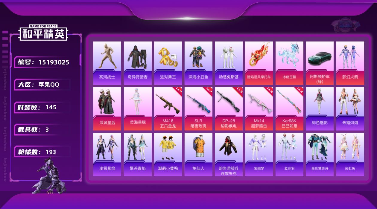 - [14567078]素材身法号/老木乃伊/无敌战神框2 苹果 微信-无敌战神框-1神装-5粉装-6特效枪-4粉色飞行器-3.6w热力值-11王牌印记-69套装-111枪皮【红色神装等级】:魔童闹海-哪吒(一级)【热门品类】:套装-冥河战士,套装-深海小丑鱼,套装-小丑鱼,套装-粉红小猪【粉色套装】:粉装-甜心巧克力,粉装-宝贝奶油派,粉装-天使彩虹糖,角色-歌者泠鸢,角色-冷漠罗丽【粉色枪皮等级】:AKM-甜心宝贝(四级),SCAR-L-魔童闹海 哪吒(三级),M416-风花雪月(七级),M416-电玩时刻(五级),Kar98K-巳巳如意(五级),DP-28-豹影疾电(五级)【粉色飞行器】:梦幻火箭飞行器,齐天大圣飞行器,飞天猪飞行器