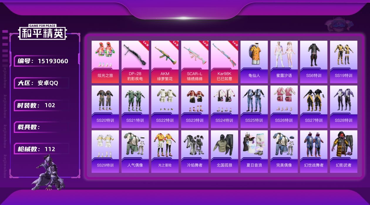 [15193060]【店主推荐捡漏号!可直接换绑】 安卓 手Q-1粉装-4特效枪-1粉色飞行器-3.1w热力值-7王牌印记-102套装-112枪皮【热门品类】:套装-龟仙人【粉色套装】:粉装-炫光之旅【粉色枪皮等级】:AKM-绿萝繁花(五级),SCAR-L-锦绣绵绵(五级),Kar98K-巳巳如意(五级),DP-28-豹影疾电(五级)