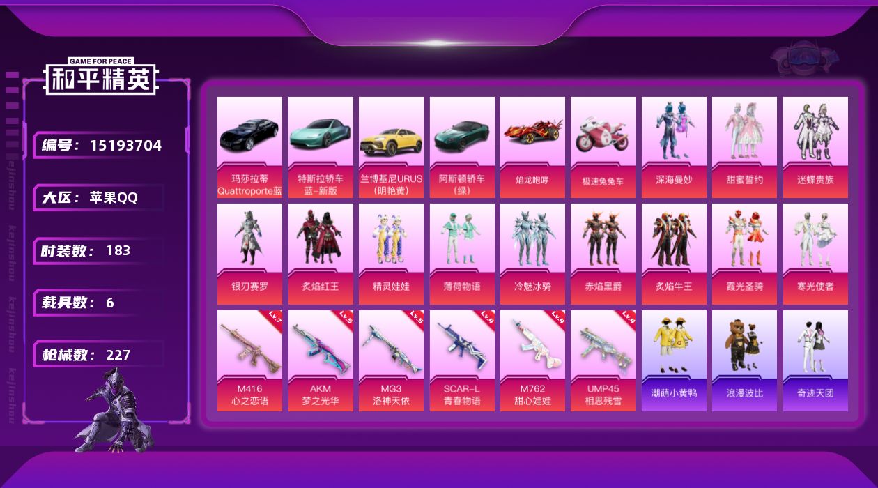 - [14224856]【1591】苹果 手Q-4粉装-3特效枪-9载具-1粉色飞行器-45993热力值-10王牌印记-75套装-127枪皮 【热门品类】:粉装-梦幻火箭,套装-忍者信条 【粉色载具】:兰博基尼Aventador SVJ(翡翠绿),兰博基尼URUS(明艳黄),玛莎拉蒂MC20(星石白),玛莎拉蒂Quattroporte(夜幕蓝),玛莎拉蒂Ghibli(粉),玛莎拉蒂Ghibli(蓝),乔治巴顿战车(乳石白),合金龙骨(蓝),焰龙咆哮 【粉色套装】:粉装-梦幻火箭,粉装-沙场疾风,粉装-炙焰牛王,粉装-幻彩电音 【粉色枪皮等级】:SCAR-L-梦幻火箭(六级),M416-五爪金龙(六级),DP-28-豹影疾电(一级) 【粉色枪皮】:SCAR-L-梦幻火箭,M416-五爪金龙,DP-28-豹影疾电 【粉色飞行器】:梦幻火箭飞行器 【粉色降落伞】:至尊龙雀降落伞,梦幻火箭降落伞,洛神天依降落伞,暗星紫秘降落伞,恐龙拽拽降落伞,筑梦精灵降落伞,智耀战神降落伞 【稀有套装】:套装-小鸟芋圆,套装-紫幽梦,套装-蓝冰羽,套装-星影赞美诗,套装-霓虹热舞,套装-彩虹兔,套装-云朵鹅,套装-雪绒豹,角色-乐音,角色-绛羽幽主 【稀有枪皮】:AKM-灼热熔岩,AKM-破晓战魂,AKM-虎虎生威,AKM-霓虹街区,M16A4-甜心亚梦,M16A4-蓝色火焰,SCAR-L-玉兔迎春,SCAR-L-黄金龙骨,M416-红色方程式,M416-葫芦兄弟,GROZA-异彩先驱,GROZA-田园牧歌,AUG-纯梦嫁纱,AUG-耀粉歌者,QBZ-洛神天依,QBZ-飞驰魅影,M762-天降萌叽,M762-橘柚倾心,M762-瑞龙福将,M762-风花雪月,M762-云朵鹅,Mk47-妙红点点,Mk47-洛神天依,G36C-星穹咏叹调,AC-VAL-天降萌叽,AC-VAL-甜心亚梦,蜜獾-垂柳戏鸭,蜜獾-天降萌叽,蜜獾-娇憨猪猪,蜜獾-绯穹魔姬,UZI-天降萌叽,UZI-娇憨猪猪,UZI-红色方程式,UMP45-夜灯,UMP45-海渊国主,UMP45-蓝色火焰,Vector-生命誓言,Vector-田园牧歌,Vector-音爆索尼克,汤姆逊-幻影战神,汤姆逊-异彩先驱,汤姆逊-暗夜鎏金,汤姆逊-炫彩节奏,汤姆逊-耀粉歌者,野牛-夜灯,MP5K-异彩先驱,MP5K-蓝莓炮弹,AKS-74U-辉羽雀灵,P90-飞驰