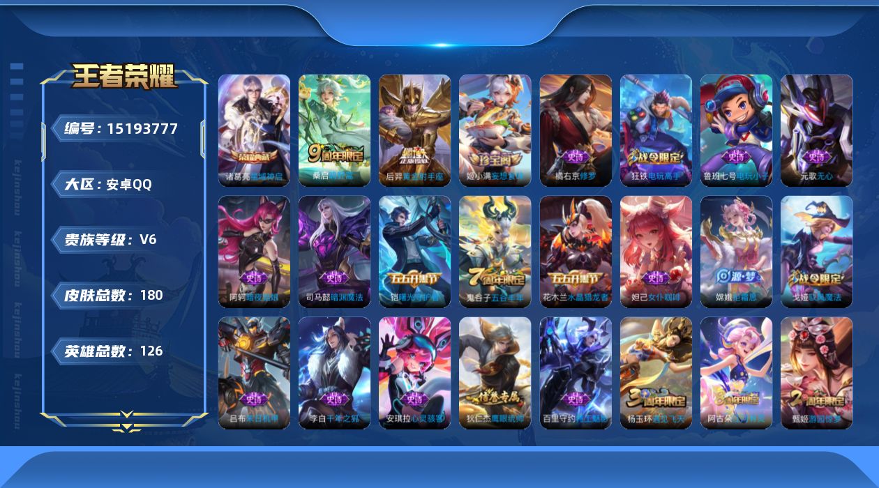 - [11960870]【商品标题】:安卓Q-V6-最强王者段位-123英雄-164皮肤-0典藏-0珍品无双-0无双-0珍品传说-4传说-31史诗 【传说皮肤】:桑启鸣野蒿,澜逐花归海,孙悟空齐天大圣,赵云淬星耀世 【限定皮肤】:姜子牙天穹之誓,狄仁杰阴阳师,赵云皇家上将,孙尚香蔷薇恋人,甄姬落雪兰心,曹操烛龙,典韦穷奇,狄仁杰魔术师,狄仁杰万华元夜,达摩沙漠行僧,项羽海滩派对,老夫子醍醐杖,程咬金演武夺筹,孙悟空至尊宝,孙悟空齐天大圣,牛魔御旌,李元芳云中旅人,钟馗驱傩正仪,雅典娜黎明之约,蔡文姬繁星吟游,太乙真人饕餮,鬼谷子原初探秘者,弈星混沌棋,明世隐疑决卦,裴擒虎李小龙,狂铁御狮,米莱狄御霄,云中君纤云弄巧,盾山御銮,鲁班大师探海日志,阿古朵江河有灵,张良古海寻踪,蒙犽百解令,鬼谷子天穹祈灯,沈梦溪龙舞盛年,刘邦剑破天穹,刘备异域游侠,周瑜熔金海岸 【赛季限定】:曹操烛龙,典韦穷奇,狄仁杰万华元夜,达摩沙漠行僧,老夫子醍醐杖,程咬金演武夺筹,张良古海寻踪,牛魔御旌,李元芳云中旅人,钟馗驱傩正仪,雅典娜黎明之约,太乙真人饕餮,鬼谷子原初探秘者,弈星混沌棋,明世隐疑决卦,狂铁御狮,米莱狄御霄,盾山御銮,鲁班大师探海日志,鬼谷子天穹祈灯,刘邦剑破天穹,姜子牙天穹之誓 【战令限定】:甄姬落雪兰心 【史诗皮肤】:赵云皇家上将,貂蝉圣诞恋歌,王昭君偶像歌手,狄仁杰魔术师,廉颇地狱岩魂,宫本武藏鬼剑武藏,孙尚香蔷薇恋人,孙尚香水果甜心,妲己魅力维加斯,曹操幽灵船长,孙悟空至尊宝,夏侯惇乘风破浪,蔡文姬舞动绿茵,刘禅天才门将,李元芳逐浪之夏,程咬金功夫厨神,白起星夜王子,孙策猫狗日记,狄仁杰鹰眼统帅,蔡文姬繁星吟游,裴擒虎李小龙,云中君纤云弄巧,雅典娜黎明之约,阿古朵江河有灵,蒙犽百解令,百里守约百相守梦,牛魔星界战将,姬小满飞车小橘子,阿轲化蝶舞,黄忠百相守梦,西施织梦人 【其他皮肤】:项羽海滩派对,韩信教廷特使,露娜哥特玫瑰,达摩大发明家,赵云白执事,赵云忍炎影,白起白色死神,牛魔西部大镖客,武则天东方不败,扁鹊化身博士,扁鹊救世之瞳,宫本武藏未来纪元,安琪拉玩偶对对碰,孙膑天使之翼,姜子牙时尚教父,妲己少女阿狸,典韦黄金武士,亚瑟死亡骑士,达摩拳王,花木兰兔女郎,甄姬花好人间,宫本武藏万象初新,狄仁杰阴阳师,关羽龙腾万里,钟无艳海滩丽影,太乙真人饕餮,宫本武藏霸王丸,曹操烛龙,老夫子功夫老