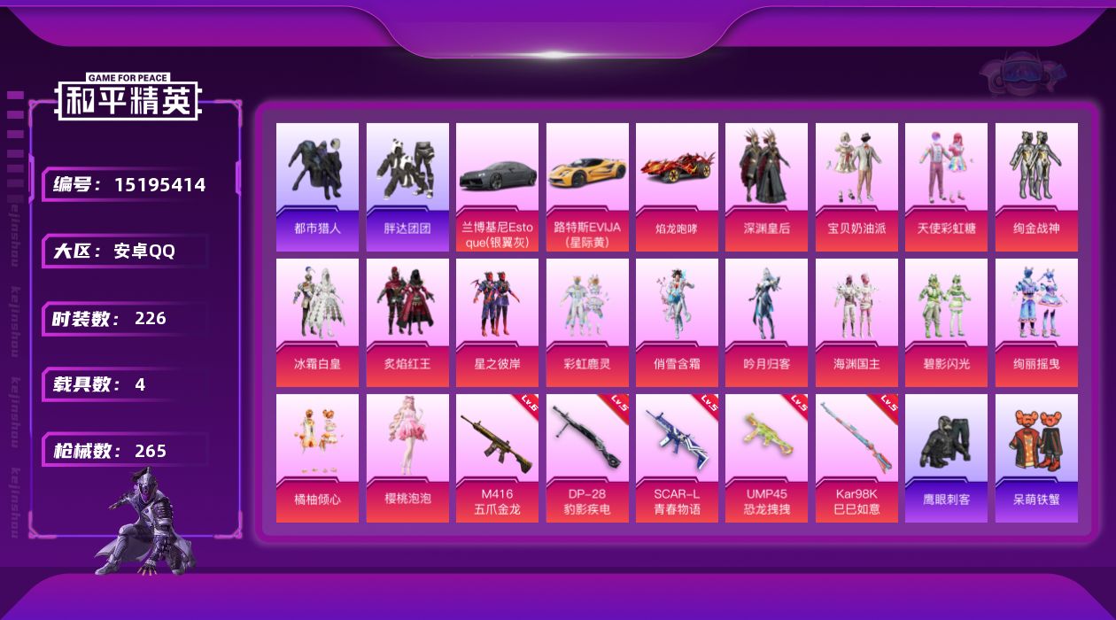 [15195414]【店主推荐捡漏号!可直接换绑】/素材身法号/地铁满天赋 安卓 手Q-15粉装-5特效枪-4载具-1粉色飞行器-9.6w热力值-17王牌印记-226套装-265枪皮【热门品类】:套装-浪漫天命,套装-都市猎人,套装-小丑鱼,套装-胖达团团,套装-金羽特工,套装-忍者信条,套装-龟仙人,套装-暗影哥特【粉色载具】:兰博基尼Estoque(银翼灰),路特斯EVIJA(星际黄),焰龙咆哮,僚机-萌兔起飞【粉色套装】:粉装-深渊皇后,粉装-宝贝奶油派,粉装-天使彩虹糖,粉装-绚金战神,粉装-冰霜白皇,粉装-炙焰红王,粉装-星之彼岸,粉装-彩虹鹿灵,粉装-俏雪含霜,粉装-吟月归客,粉装-海渊国主,粉装-碧影闪光,粉装-绚丽摇曳,粉装-橘柚倾心,角色-樱桃泡泡【粉色枪皮等级】:SCAR-L-青春物语(五级),M416-五爪金龙(六级),UMP45-恐龙拽拽(五级),Kar98K-巳巳如意(五级),DP-28-豹影疾电(五级)【粉色飞行器】:童趣迷兔飞行器