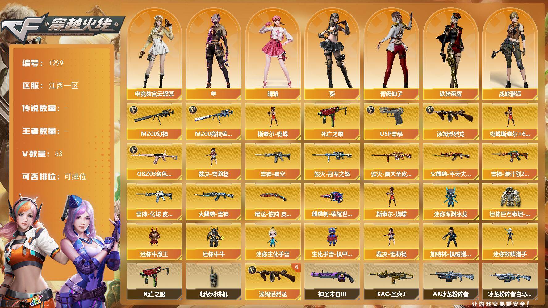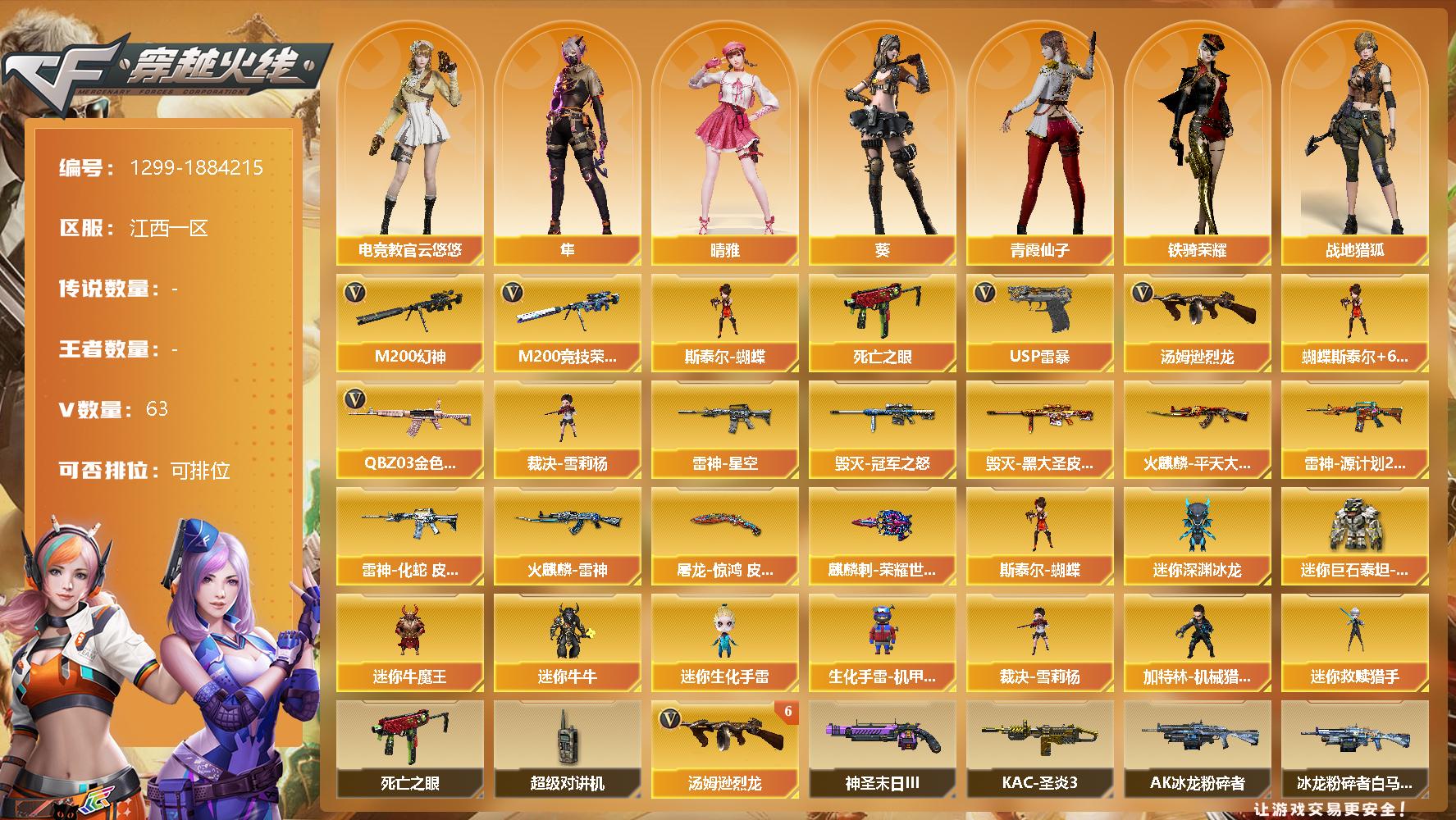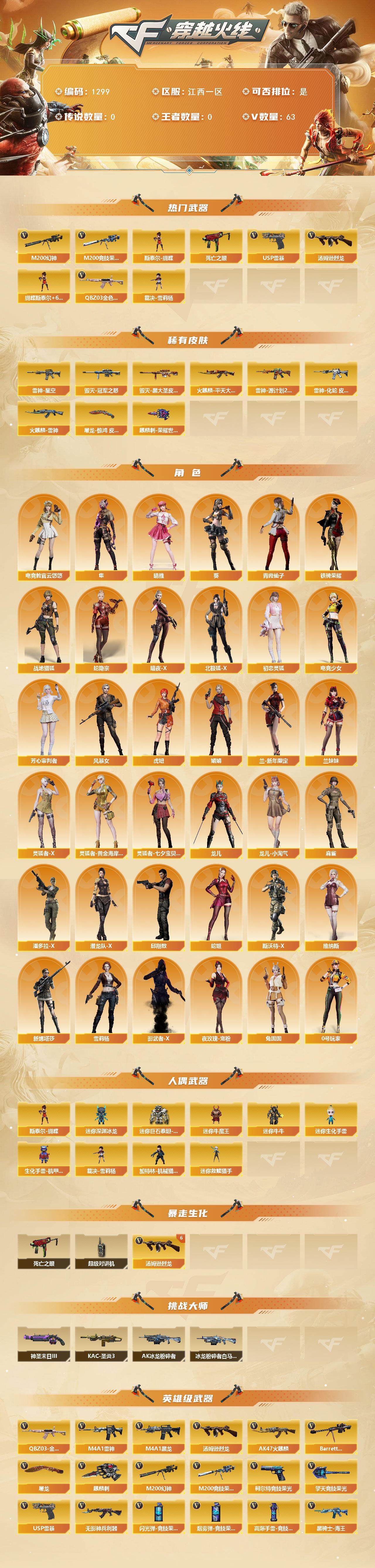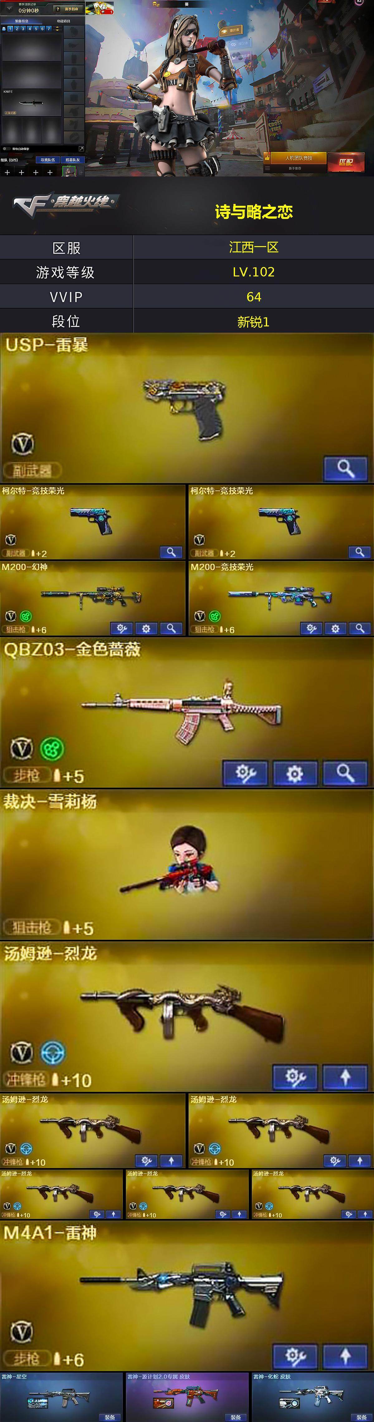 [15196766]江西一区-63V-0王者-0炫金 【热门武器】:QBZ03-金色蔷薇,M200-幻神,M200-竞技荣光,死亡之眼,汤姆逊-烈龙*6,斯泰尔-蝴蝶,裁决-雪莉杨,USP-雷暴 【皮肤】:雷神-星空,雷神-源计划2.0专属 皮肤,雷神-化蛇 皮肤,火麒麟-雷神,火麒麟-平天大圣,毁灭-冠军之怒,毁灭-黑大圣皮肤,屠龙-惊鸿 皮肤,麒麟刺-荣耀世冠白鲨 【角色】:葵,电竞教官-云悠悠,晴雅,隼,战