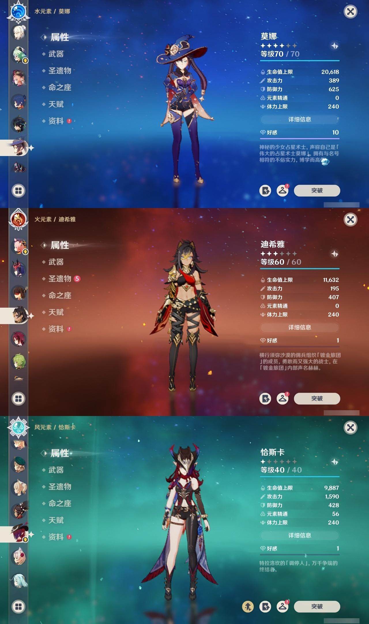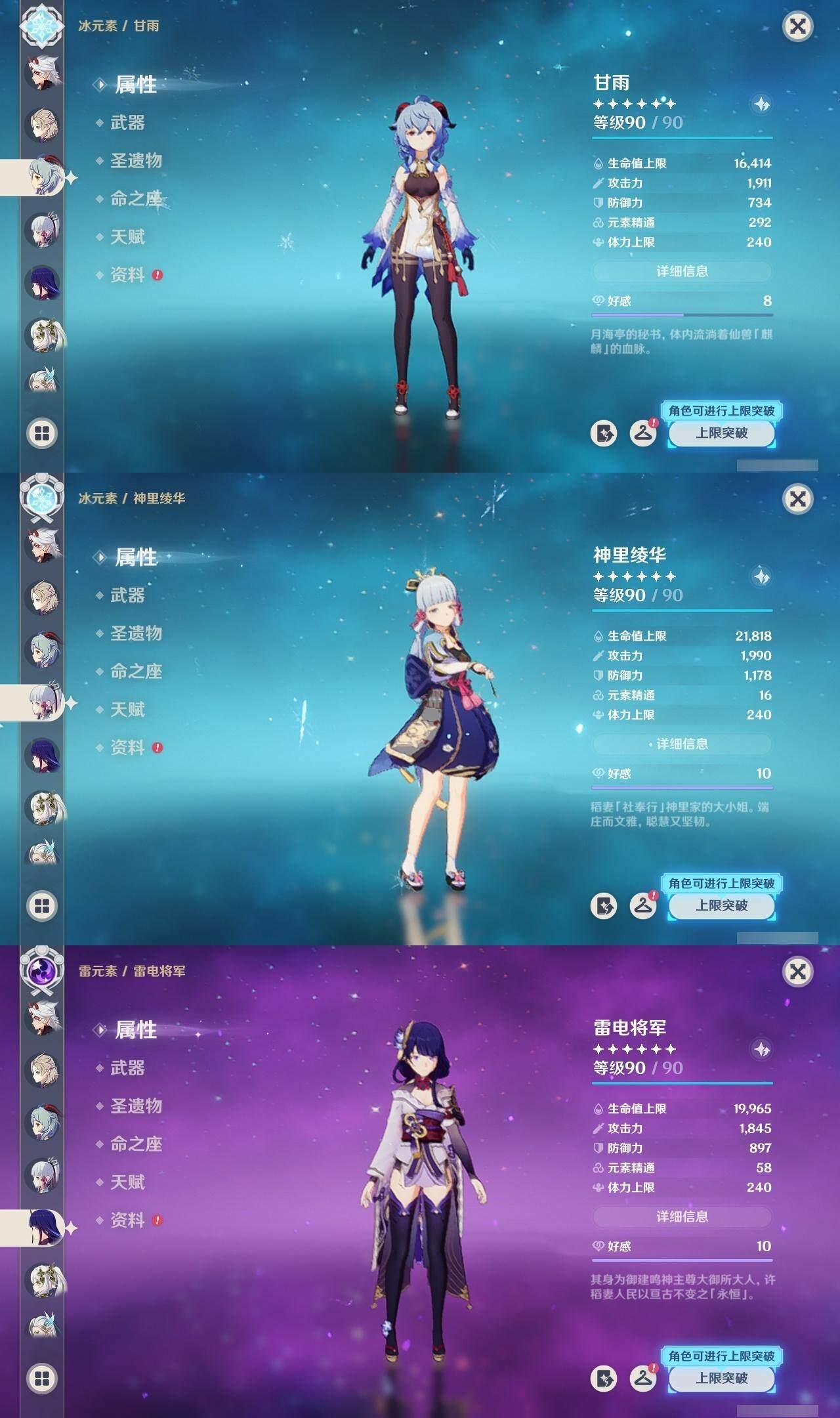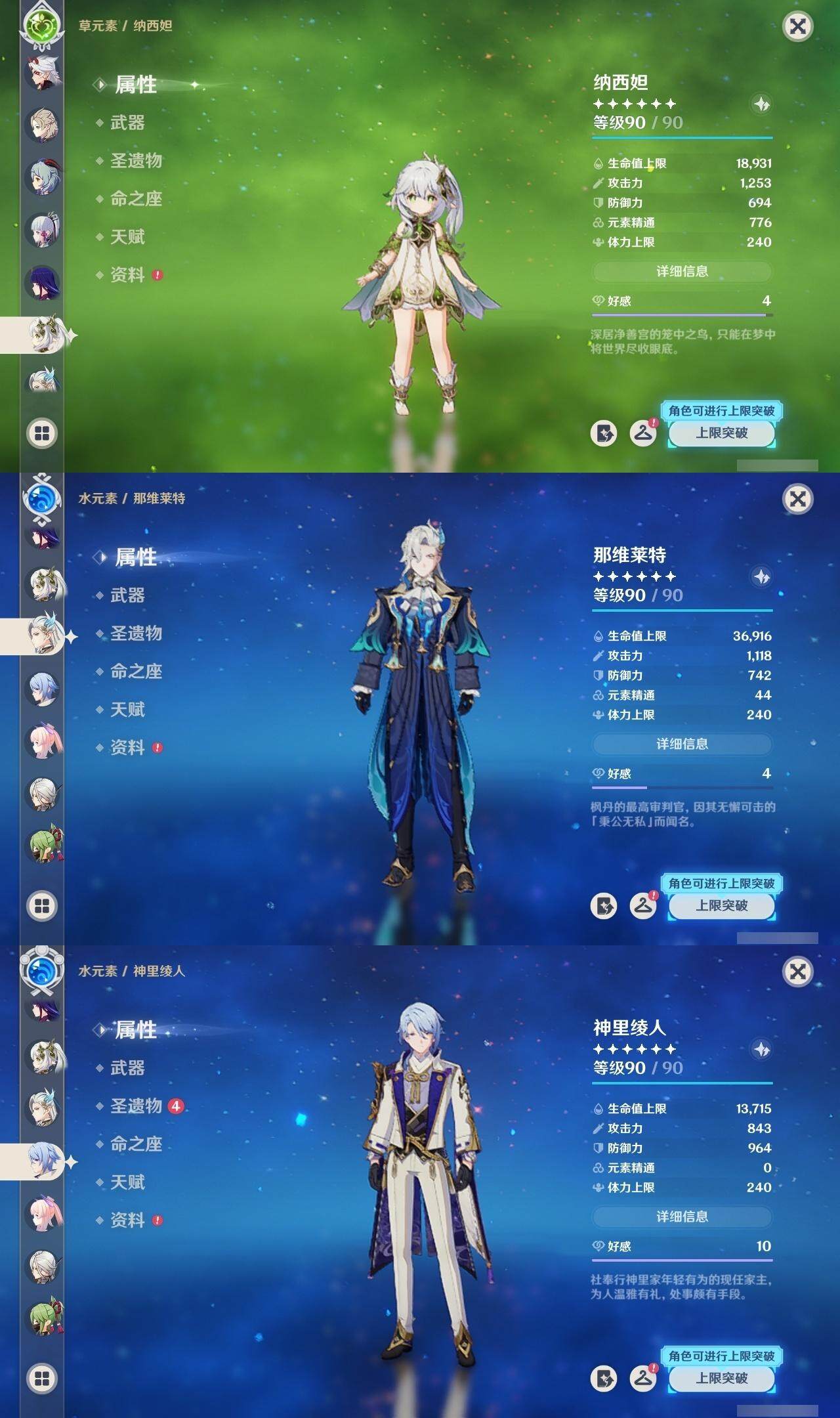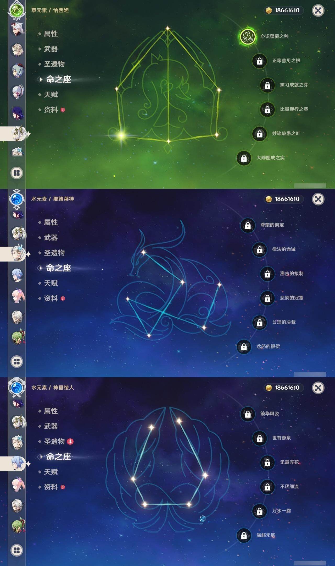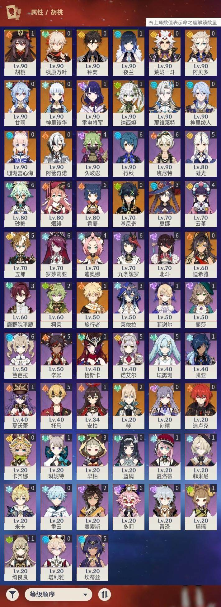 0命阿蕾奇诺,0命那维莱特,0命迪希雅,1命纳西妲,1命夜兰,0命神里绫人,0命荒泷一斗,1命雷电将军,0命枫原万叶,0命神里绫华,0命钟离,1命胡桃,0命甘雨,0命阿贝多,0命珊瑚宫心海,0命刻晴,2命琴,3命莫娜,0命迪卢克,0命基尼奇,0命恰斯卡,精1有乐御簾切,精1赤沙之杖,精1若水,精1终末嗟叹之诗,精1无工之剑,精1护摩之杖,精1和璞鸢,精1天空之脊,精1天空之刃
