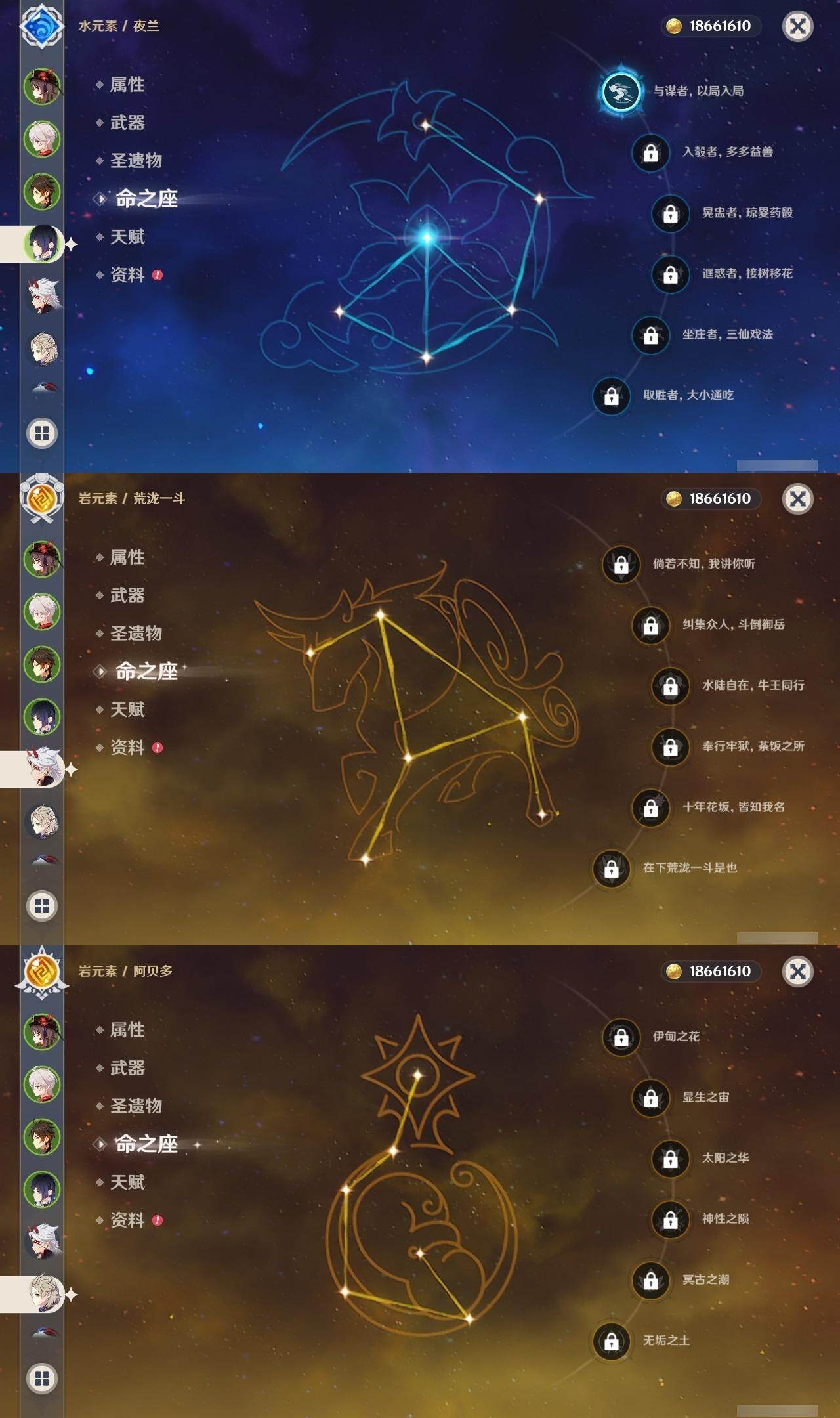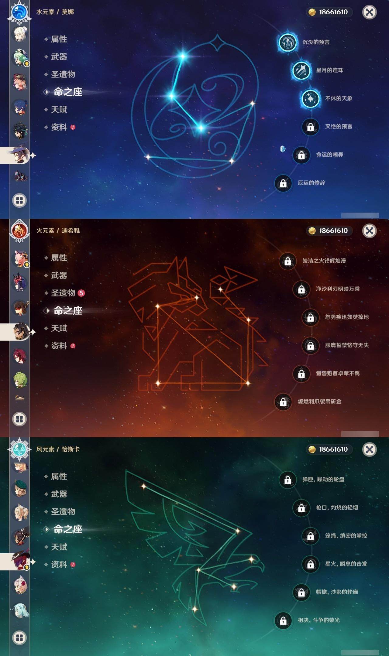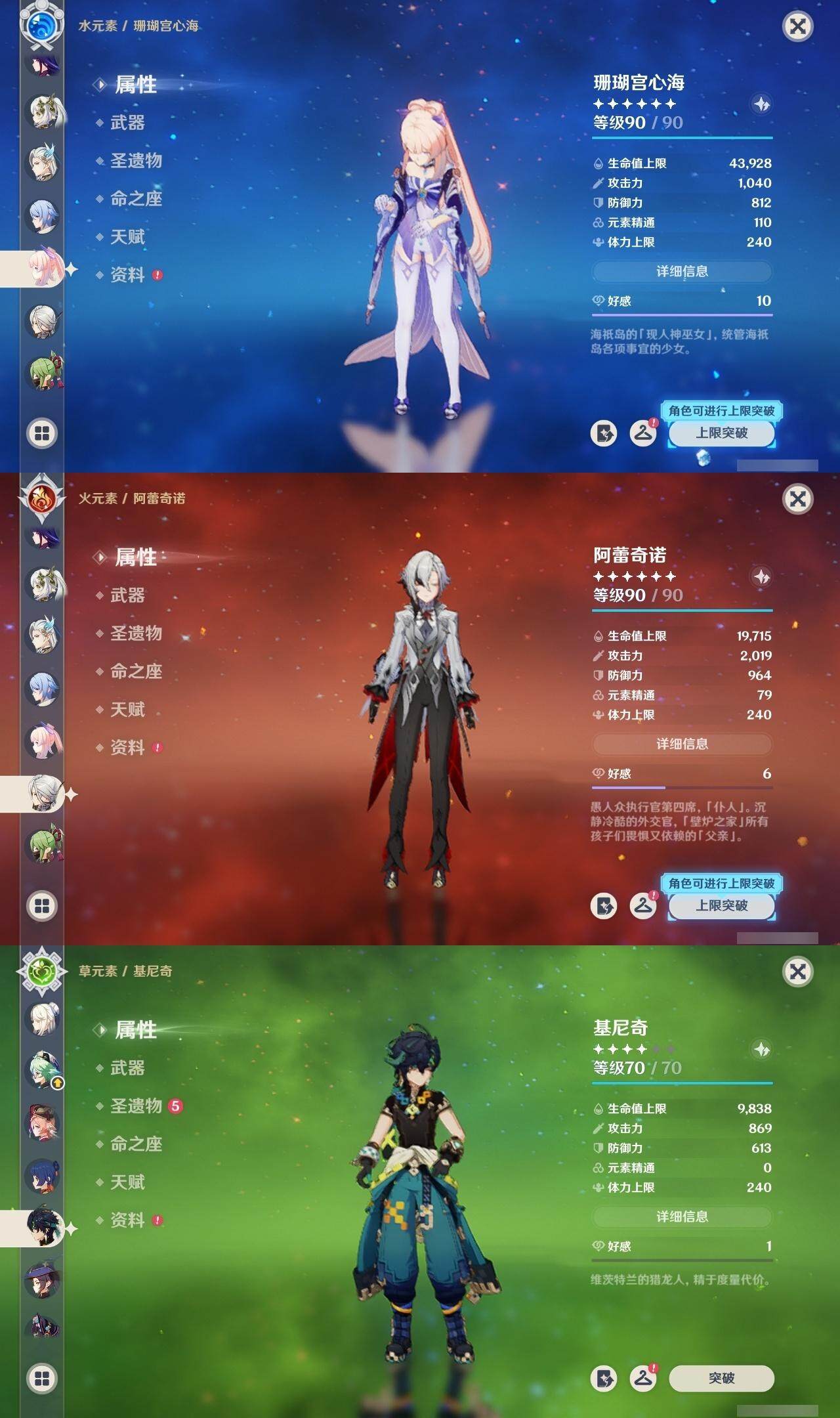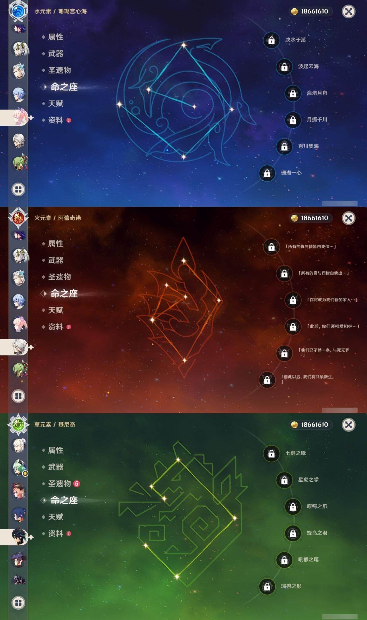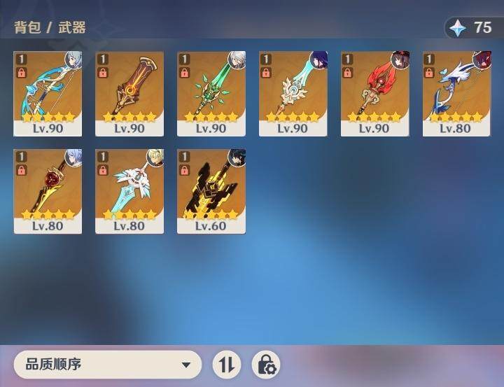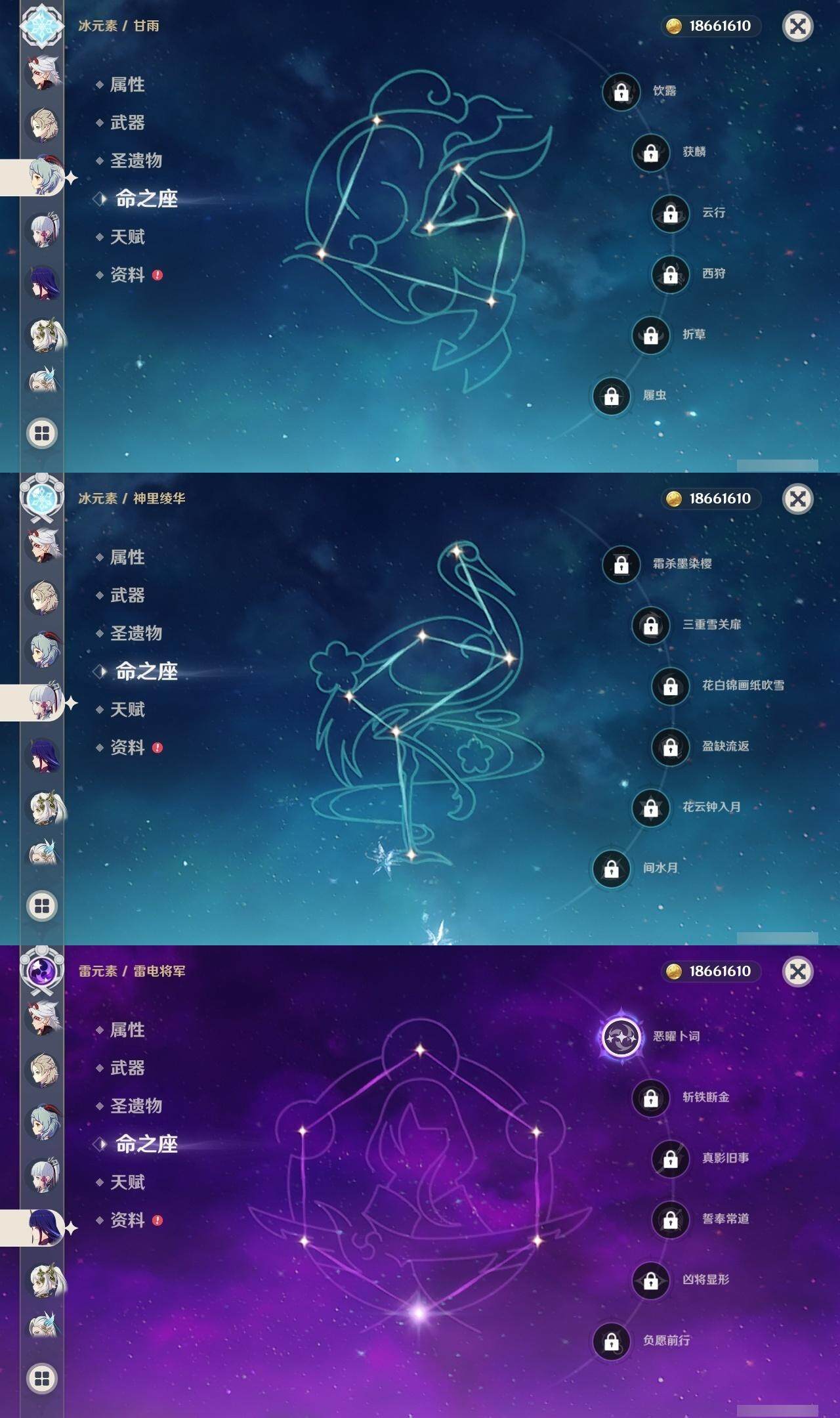 0命阿蕾奇诺,0命那维莱特,0命迪希雅,1命纳西妲,1命夜兰,0命神里绫人,0命荒泷一斗,1命雷电将军,0命枫原万叶,0命神里绫华,0命钟离,1命胡桃,0命甘雨,0命阿贝多,0命珊瑚宫心海,0命刻晴,2命琴,3命莫娜,0命迪卢克,0命基尼奇,0命恰斯卡,精1有乐御簾切,精1赤沙之杖,精1若水,精1终末嗟叹之诗,精1无工之剑,精1护摩之杖,精1和璞鸢,精1天空之脊,精1天空之刃