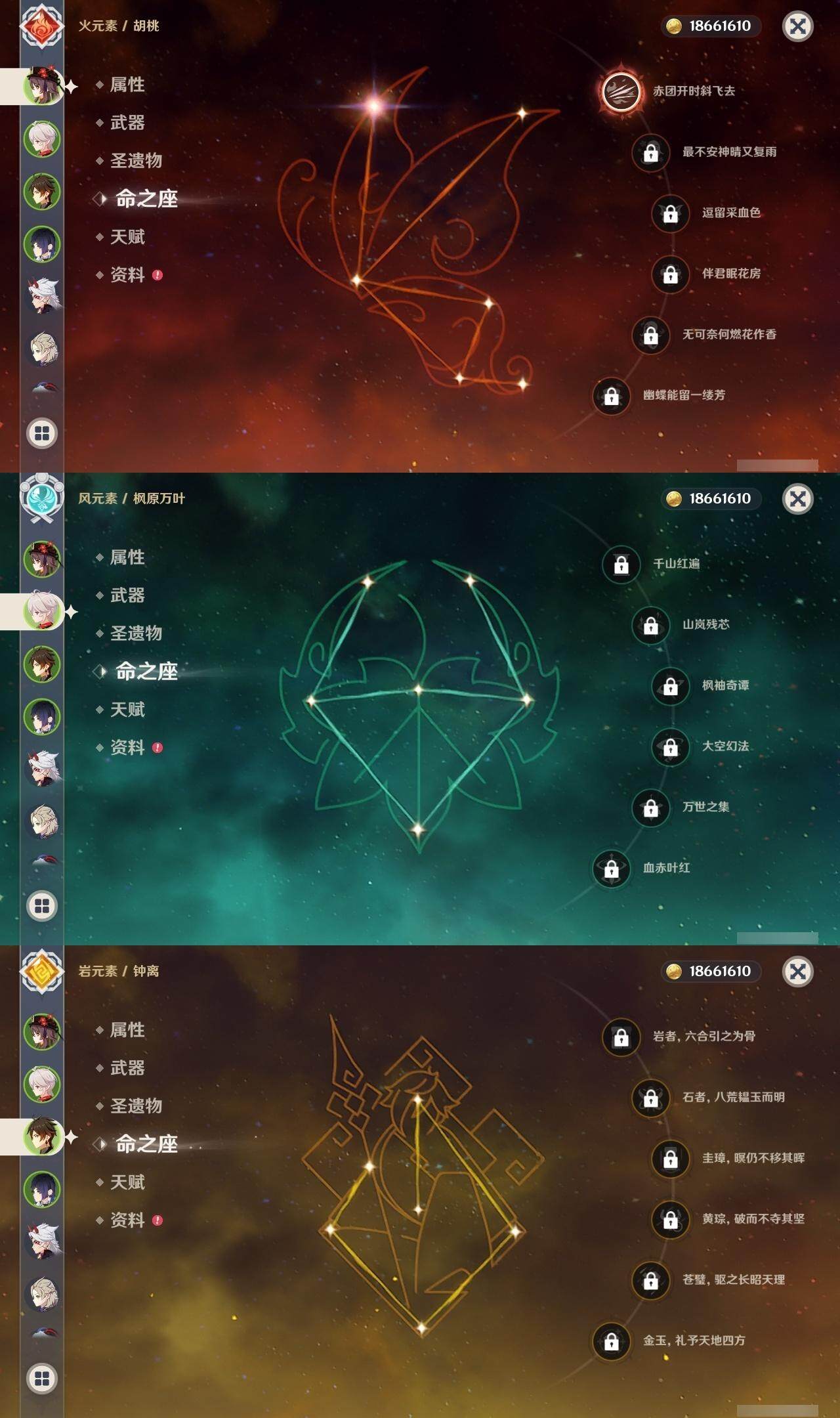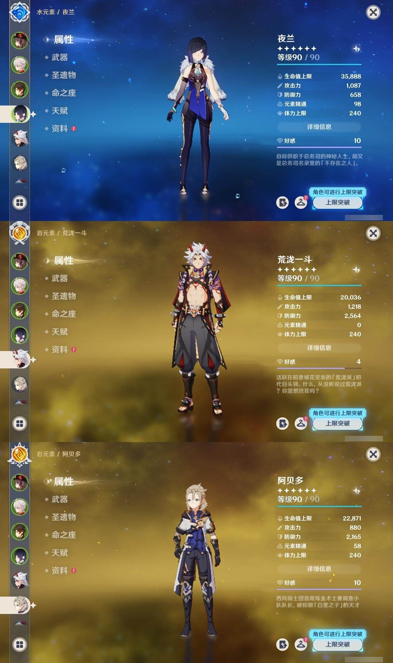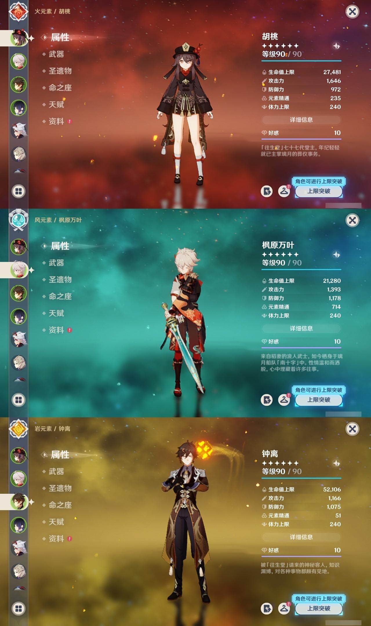 胡桃,枫原万叶,钟离,荒泷一斗,阿贝多,甘雨,神里凌华,雷电将军,珊瑚宫心海,莫娜,琴,刻晴,迪卢克
