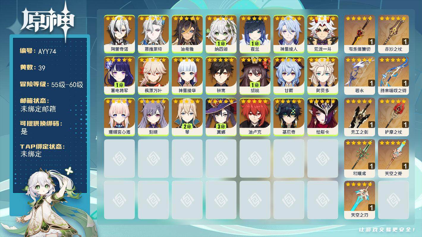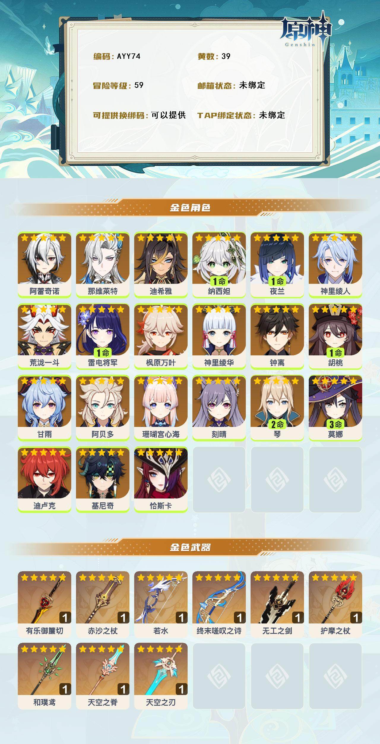 [15199238]59级/39黄/男主/21个五星角色/9个五星武器 0命阿蕾奇诺,0命那维莱特,0命迪希雅,1命纳西妲,1命夜兰,0命神里绫人,0命荒泷一斗,1命雷电将军,0命枫原万叶,0命神里绫华,0命钟离,1命胡桃,0命甘雨,0命阿贝多,0命珊瑚宫心海,0命刻晴,2命琴,3命莫娜,0命迪卢克,0命基尼奇,0命恰斯卡,精1有乐御簾切,精1赤沙之杖,精1若水,精1终末嗟叹之诗,精1无工之剑,精1护摩之杖,精1和璞鸢,精1天空之脊,精1天空之刃