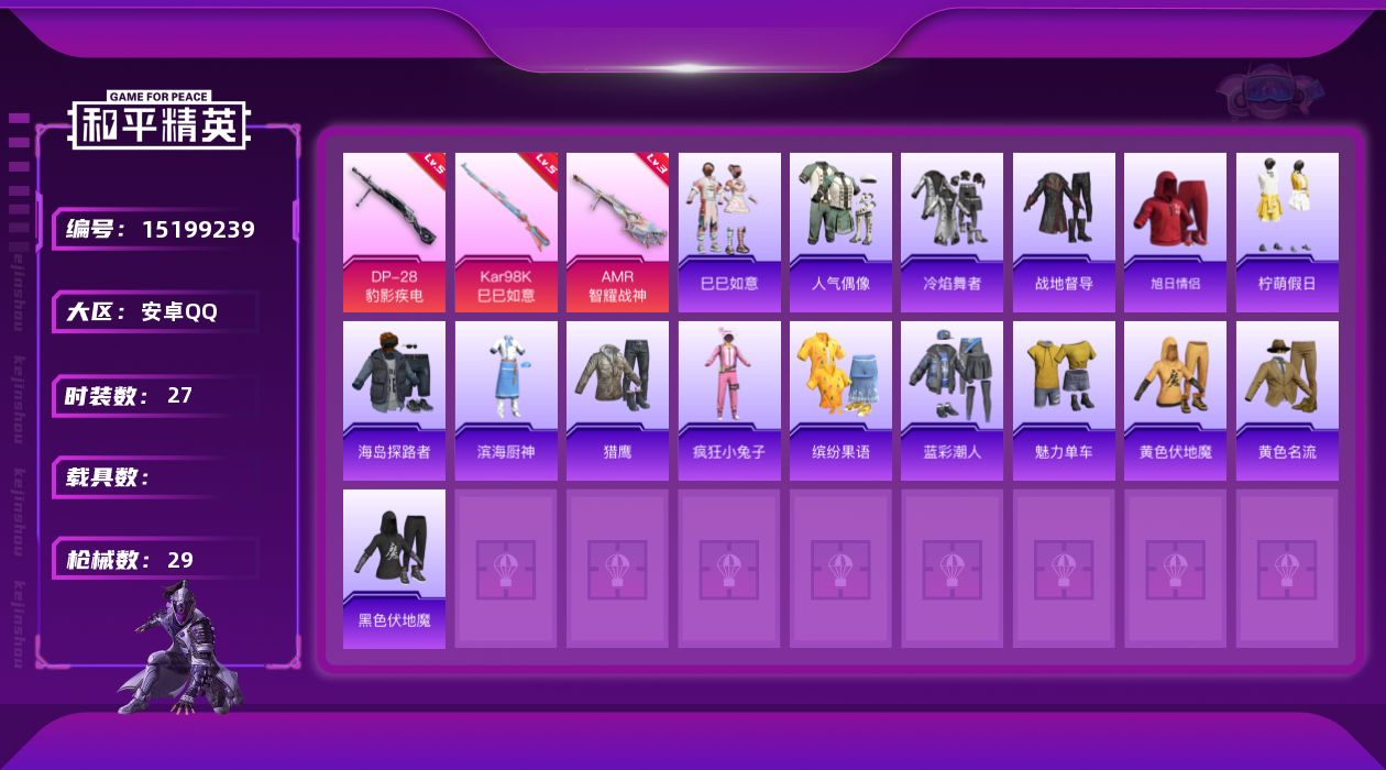 [15199239]可二次【店主推荐捡漏号!可直接换绑】安卓 手Q-3特效枪-1粉色飞行器-9010热力值-27套装-29枪皮【粉色枪皮等级】:Kar98K-巳巳如意(五级),AMR-智耀战神(三级),DP-28-豹影疾电(五级)