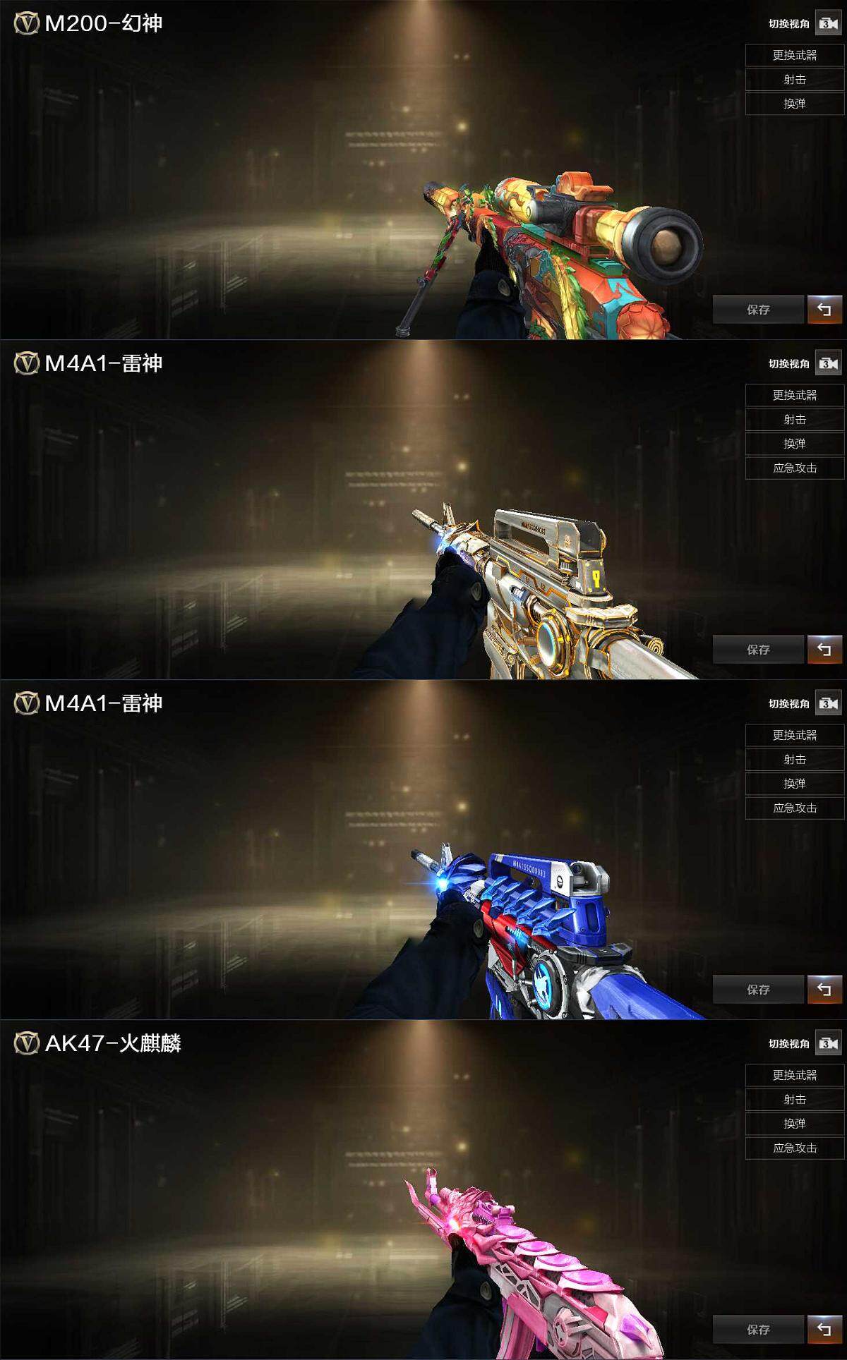 【热门武器】:QBZ03-金色蔷薇,HK417-朱雀,M4A1-青龙,M200-幻神,M4A1-黑骑士,加特林-炼狱,雷神-小红,COP 357-幻灵,沙鹰-修罗*3,金刚伞