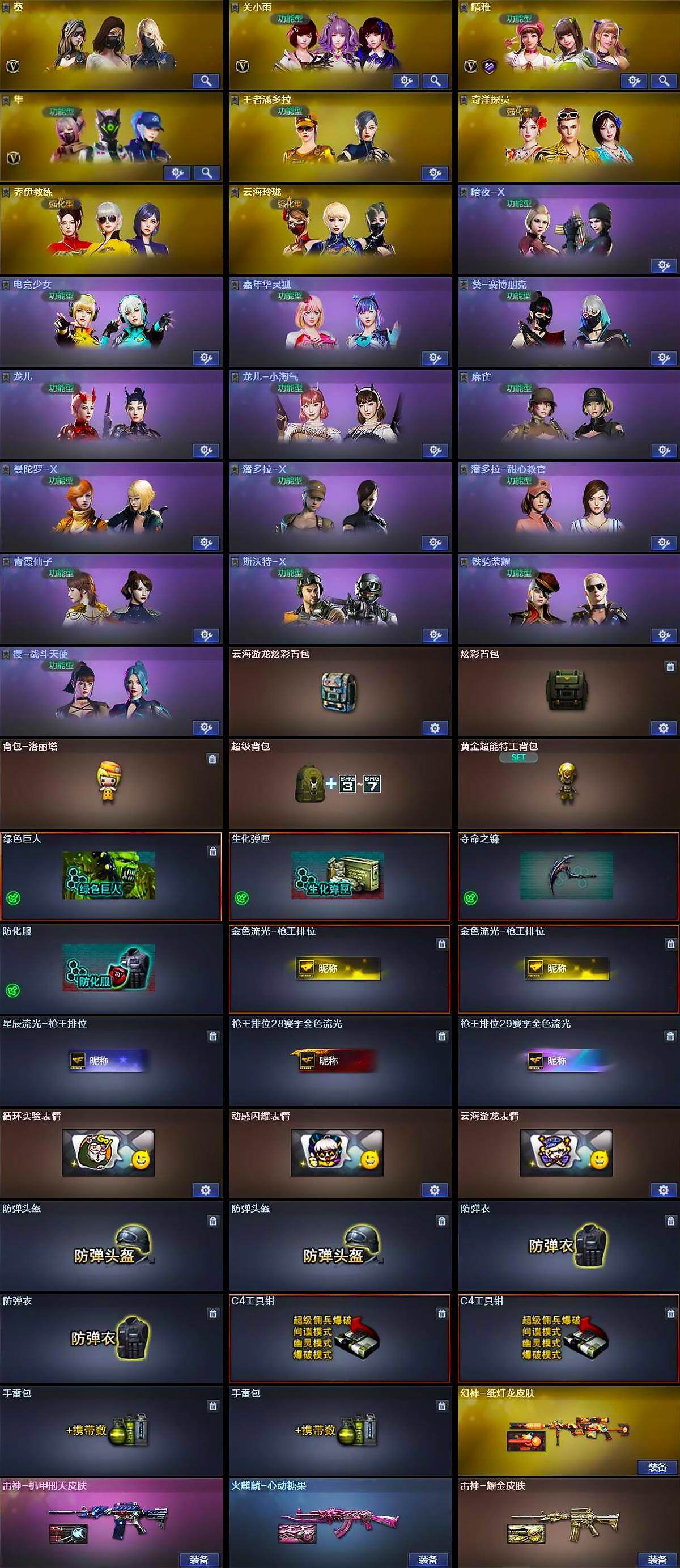 - [14419153]广西一区-20V-5王者-0炫金 【热门武器】:HK417-朱雀,M4A1-青龙,M200-幻神,金色蔷薇-古蛇迷踪,修罗-古蛇迷踪,M4A1-黑骑士,加特林-炼狱 【王者炫金武器】:王者之翼 【音效卡】:M200-幻神音效卡,M4A1-黑骑士音效卡 【皮肤】:幻神-荣耀世冠EP 皮肤,火麒麟-平天大圣,战神-粉色甜心皮肤,战神-紫绶金章皮肤,战神-流金岁月皮肤,AK47-B-常胜将军-曹操,AK47-B-常胜将军-刘备,AK47-B-常胜将军-孙权,修罗-星空 【角色】:战地猎狐,蛇隐宗,娟娟,兰-新年限定,玫瑰花神,潘多拉-甜心教官,潜龙队-X,青霞仙子,蛇姬,蜀雪,铁骑荣耀,雪莉杨,雪莉杨-摸金校尉,智影 【人偶武器】:迷你钢铁终结者,迷你深渊冰龙,迷你牛魔王,闪光弹-小乔,闪光弹-貂蝉,高爆手雷-大乔 【挑战大师】:AK47-冰龙粉碎者 【英雄级武器】:AK47-火麒麟,M4A1-雷神,M4A1-黑骑士,M4A1-青龙,HK417-朱雀,黑武士-锦绣游龙,金色蔷薇-古蛇迷踪,AK-47-猩红传说,AK47-B-战神,黑骑士-海王*2,AK47-B-常胜将军,M200-幻神,加特林-炼狱,沙鹰-天神,修罗-古蛇迷踪,屠龙,王者之啸-觉醒版,王者之击-觉醒版*2,高爆手雷-古蛇迷踪,烟雾弹-古蛇迷踪,烟雾弹-荣耀世冠EP 【道具】:EP战队炫彩背包,古蛇迷踪炫彩背包,炫彩背包,超级背包,女皇终结者-魔龙之吻,救世主-黑桃战神,黄金生化钩,绿色巨人,灵魂忍者,迷雾幽灵,生化弹匣,夺命之镰,防化服*2,枪王排位29赛季金色流光,古蛇迷踪打击特效,蛇隐宗表情,防弹头盔*4,防弹衣*5,C4工具钳*5,手雷包*4 【特殊枪械】:1黑骑士,1炼狱
