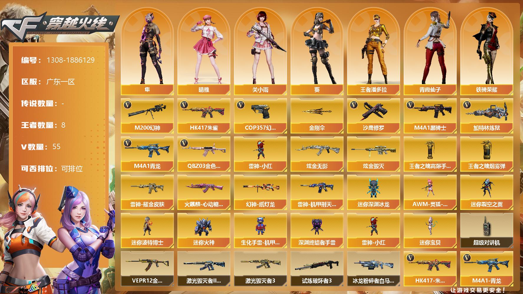 [15199278]广东一区-55V-8王者-2炫金 【热门武器】:QBZ03-金色蔷薇,HK417-朱雀,M4A1-青龙,M200-幻神,M4A1-黑骑士,加特林-炼狱,雷神-小红,COP 357-幻灵,沙鹰-修罗*3,金刚伞 【王者炫金武器】:炫金无影,炫金毁灭,王者之魄高爆手雷*2,王者之魄烟雾弹 【皮肤】:幻神-纸灯龙皮肤,雷神-耀金皮肤,雷神-机甲刑天皮肤,火麒麟-心动糖果 【角色】:葵,关小雨,晴雅,