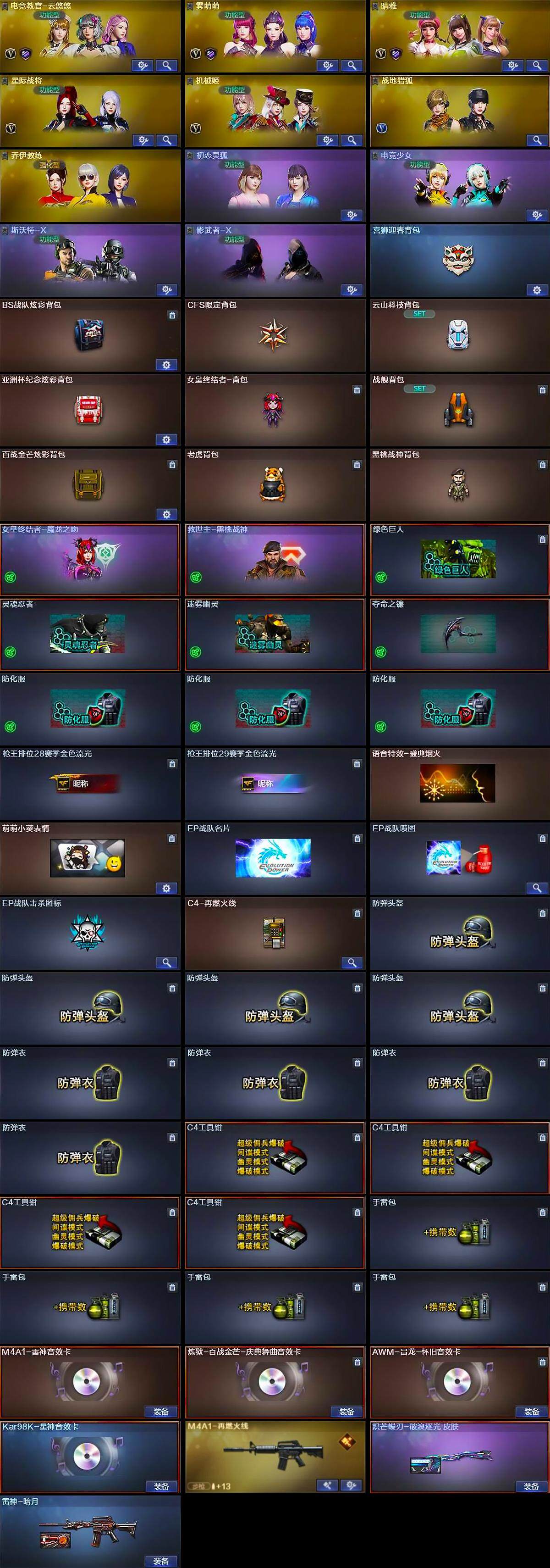 - [15243640]山东一区-43V-3王者-0炫金 【热门武器】:QBZ03-金色蔷薇,金色蔷薇-古蛇迷踪,修罗-古蛇迷踪,Kar98K-星神,毁灭-孙三炮,COP 357-幻灵*2 【音效卡】:炼狱-百战金芒-庆典舞曲音效卡 【皮肤】:QBZ03-巅峰荣耀皮肤,雷神-R.LGD-CFPLS18冠军,M4A1-雷神-新春神龙皮肤,雷神-源计划2.0专属 皮肤,M4A1-再燃火线,火麒麟-华夏之心,轻型军用手斧-再燃火线 【角色】:影豹,鹰,王者-零-国色天香,王者凌霄,蛇隐宗,奇洋探员,乔伊教练,云海玲珑,暗夜-X,电竞少女,兰-空鹰,灵狐者-职业经理,龙儿,蛇姬,蜀雪,铁骑荣耀,雪莉杨 【人偶武器】:毁灭-孙三炮,Scar Light-马枪,生化手雷-机甲核心*2 【英雄级武器】:AK47-火麒麟,M4A1-雷神,M4A1-幻灵,金色蔷薇-古蛇迷踪,QBZ03-金色蔷薇,黑骑士-海王,Barrett-毁灭,Kar98K-星神,王者风神-觉醒版,炼狱-百战金芒,烈龙-云海游龙,COP 357-幻灵*2,修罗-古蛇迷踪,幻灵之锋,擎天-云海游龙,麒麟刺-百战金芒,高爆手雷-幻灵*7,手雷-云海游龙,高爆手雷-古蛇迷踪,闪光弹-幻灵*7,烟雾弹-幻灵*8,烟雾弹-古蛇迷踪,M4A1-赤狱骑士 【道具】:CFS限定背包,云海游龙炫彩背包,亚洲杯纪念炫彩背包,古蛇迷踪炫彩背包,百战金芒炫彩背包,老虎背包,超级背包,救世主-黑桃战神,绿色巨人,灵魂忍者,迷雾幽灵,夺命之镰,防化服*3,金色流光-枪王排位,星辰流光-枪王排位,枪王排位28赛季金色流光,枪王排位29赛季金色流光,语音特效-盛典烟火,古蛇迷踪打击特效,蛇隐宗表情,云海游龙表情,EP战队名片,EP战队喷图,EP战队击杀图标*2,C4-黑曜,防弹头盔*4,防弹衣*4,C4工具钳*4,手雷包*4 【特殊枪械】: