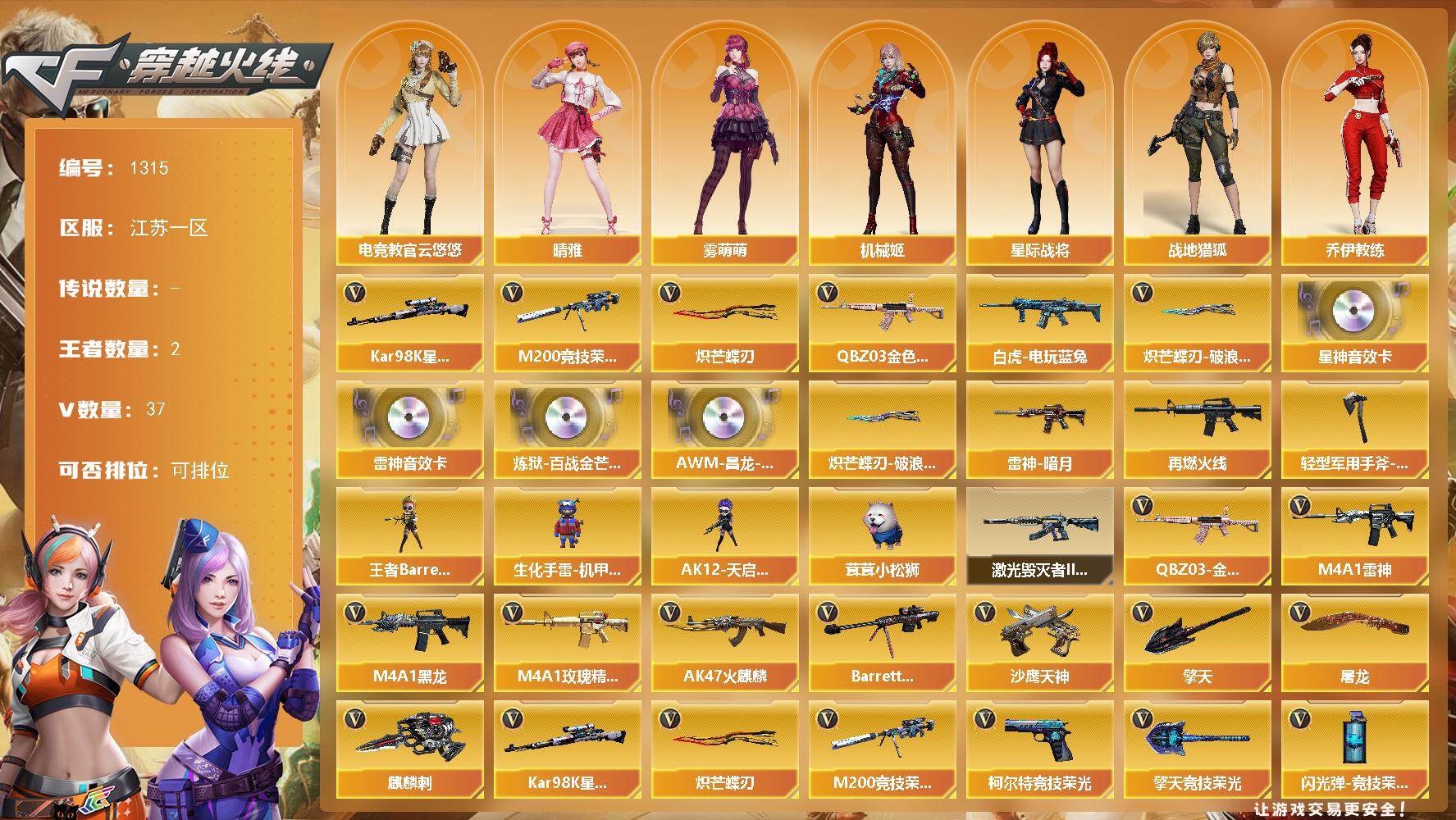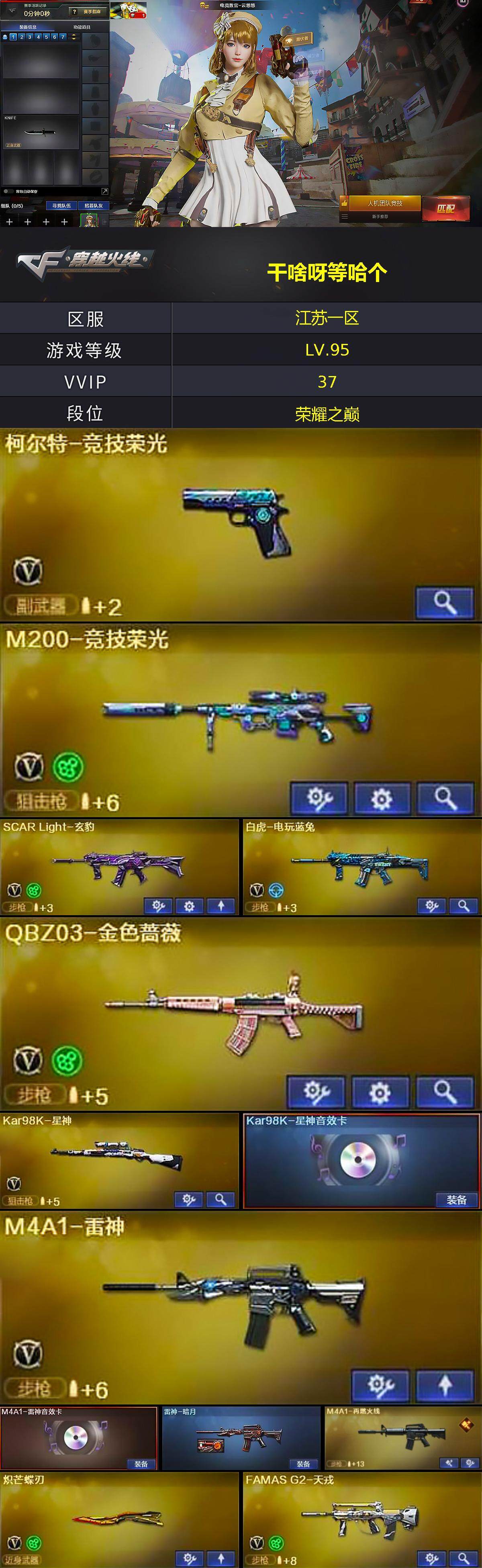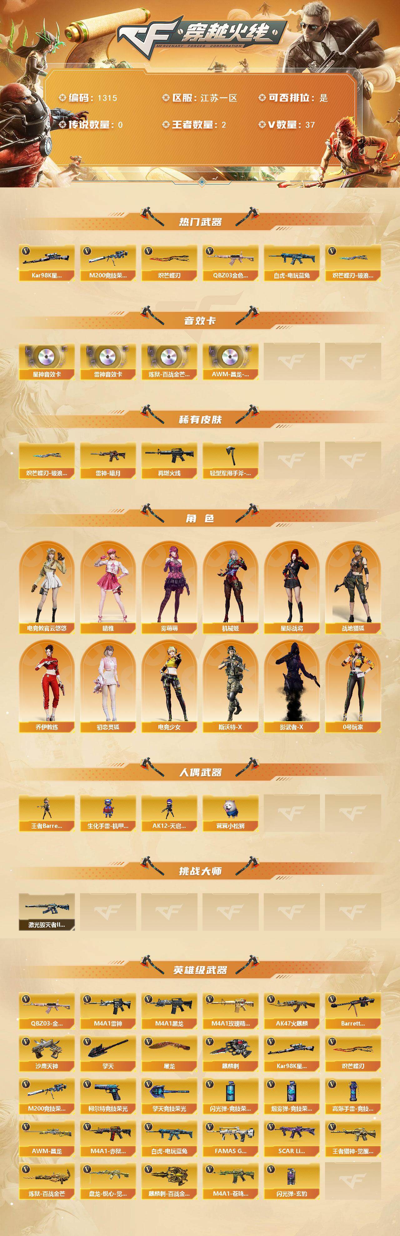 [15199649]江苏一区-37V-2王者-0炫金 【热门武器】:QBZ03-金色蔷薇,M200-竞技荣光,白虎-电玩蓝兔,Kar98K-星神,炽芒蝶刃,炽芒蝶刃-破浪逐光 皮肤 【音效卡】:M4A1-雷神音效卡,Kar98K-星神音效卡,炼狱-百战金芒-庆典舞曲音效卡,AWM-昌龙-怀旧音效卡 【皮肤】:雷神-暗月,M4A1-再燃火线,轻型军用手斧-再燃火线,炽芒蝶刃-破浪逐光 皮肤 【角色】:电竞教官-云悠