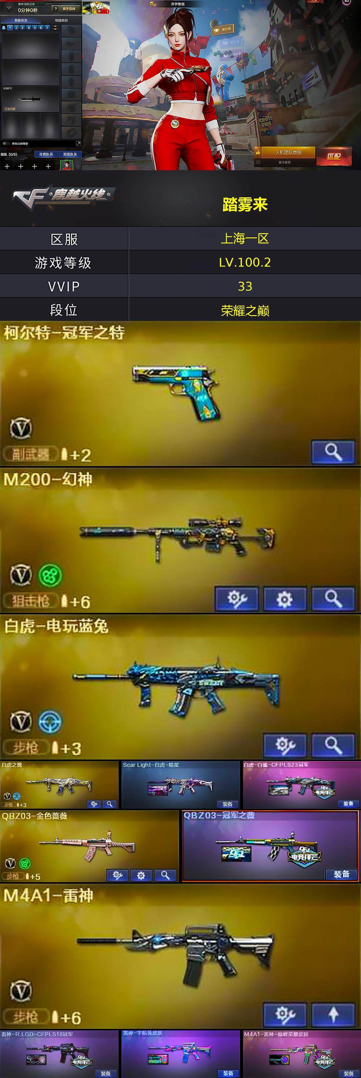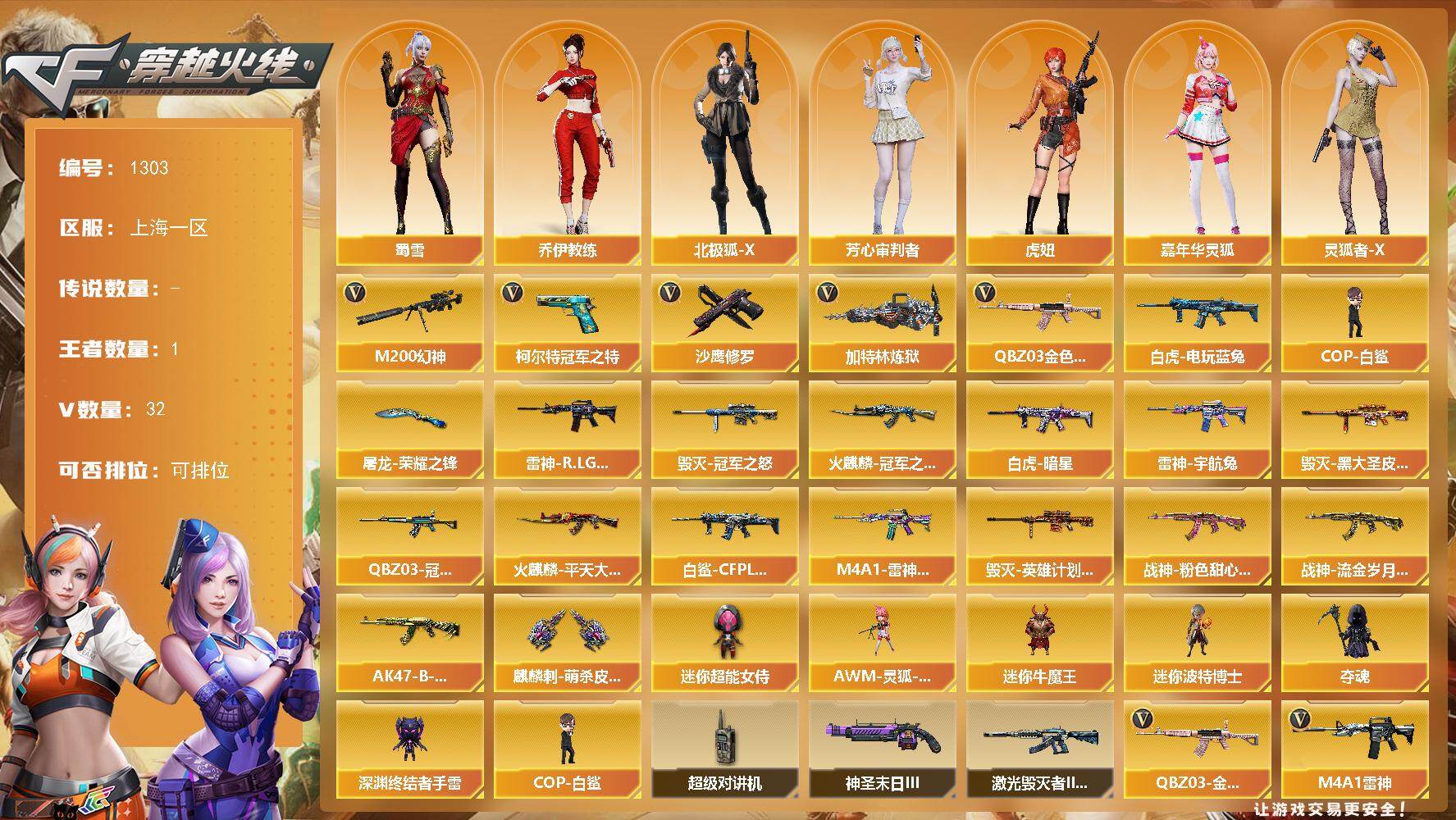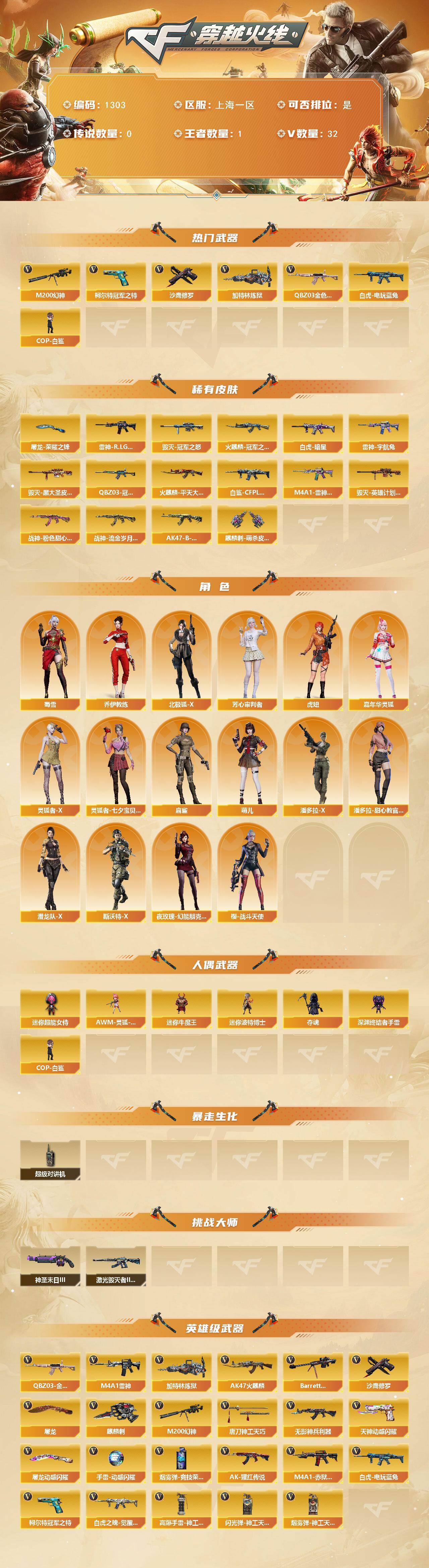 [15200101]上海一区-32V-1王者-0炫金 【热门武器】:QBZ03-金色蔷薇,M200-幻神,白虎-电玩蓝兔,柯尔特-冠军之特,加特林-炼狱,COP-白鲨,沙鹰-修罗 【皮肤】:Scar Light-白虎-暗星,白虎-白鲨-CFPLS23冠军,QBZ03-冠军之薇,雷神-R.LGD-CFPLS18冠军,雷神-宇航兔皮肤,M4A1-雷神-巅峰荣耀皮肤,火麒麟-冠军之心,火麒麟-平天大圣*2,毁灭-冠军之怒,毁灭-黑大圣皮肤,毁灭-英雄计划 皮肤,战神-粉色甜心皮肤,战神-流金岁月皮肤,AK47-B-常胜将军-孙权,屠龙-荣耀之锋*2,麒麟刺-萌杀皮肤 【角色】:乔伊教练,北极狐-X,芳心审判者,虎妞,嘉年华灵狐,灵狐者-X,灵狐者-七夕宝贝,麻雀,萌儿,潘多拉-X,潘多拉-甜心教官,潜龙队-X,斯沃特-X,蜀雪,夜玫瑰-幻能朋克,樱-战斗天使 【人偶武器】:COP-白鲨,AWM-灵狐-15周年嘉年华,迷你牛魔王,迷你波特博士,夺魂,深渊终结者手雷,迷你超能女侍 【暴走生化】:超级对讲机 【挑战大师】:激光毁灭者III-白马银枪,神圣爆裂者-末日III 【英雄级武器】:AK47-火麒麟,M4A1-雷神,无影-神兵利器,QBZ03-金色蔷薇,AK-47-猩红传说*3,白虎-电玩蓝兔,白虎之魄-觉醒版,Barrett-毁灭,M200-幻神,加特林-炼狱,沙鹰-修罗,柯尔特-冠军之特,天神-动感闪耀,屠龙,麒麟刺,唐刀-神工天巧,屠龙-动感闪耀,高爆手雷-神工天巧*4,手雷-动感闪耀,闪光弹-神工天巧*4,烟雾弹-竞技荣光,烟雾弹-神工天巧*4,M4A1-赤狱骑士 【道具】:AG战队炫彩背包,全能枪王背包,超级背包,夺命之镰,防化服,金色流光-枪王排位*2,星辰流光-枪王排位,枪王排位29赛季金色流光,语音特效-生化,电玩兔兔表情,斯沃特表情,动感闪耀表情,EP战队名片,C4-黑曜,防弹头盔*2,防弹衣*2,C4工具钳*2,手雷包*2 【特殊枪械】:1炼狱