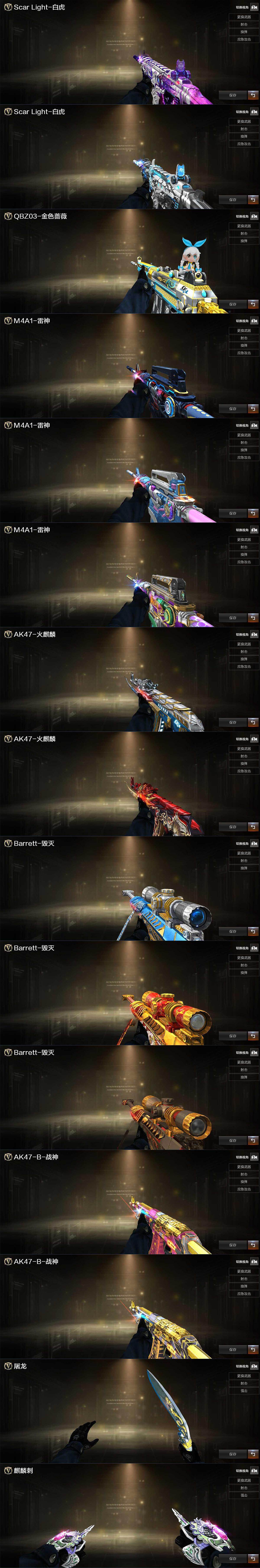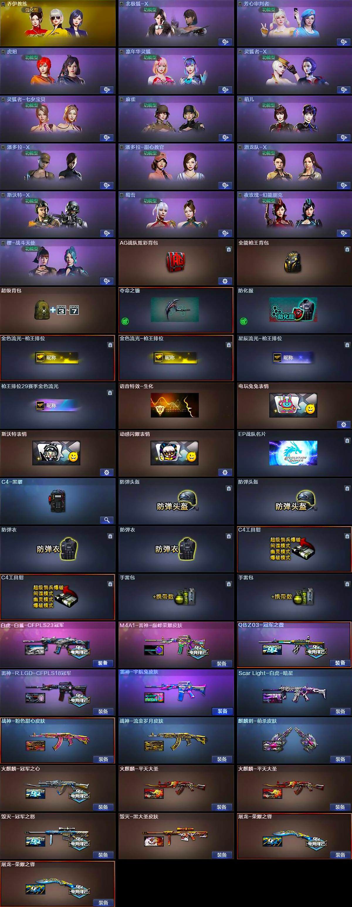 【皮肤】:Scar Light-白虎-暗星,白虎-白鲨-CFPLS23冠军,QBZ03-冠军之薇,雷神-R.LGD-CFPLS18冠军,雷神-宇航兔皮肤,M4A1-雷神-巅峰荣耀皮肤,火麒麟-冠军之心,火麒麟-平天大圣*2,毁灭-冠军之怒,毁灭-黑大圣皮肤,毁灭-英雄计划 皮肤,战神-粉色甜心皮肤,战神-流金岁月皮肤,AK47-B-常胜将军-孙权,屠龙-荣耀之锋*2,麒麟刺-萌杀皮肤