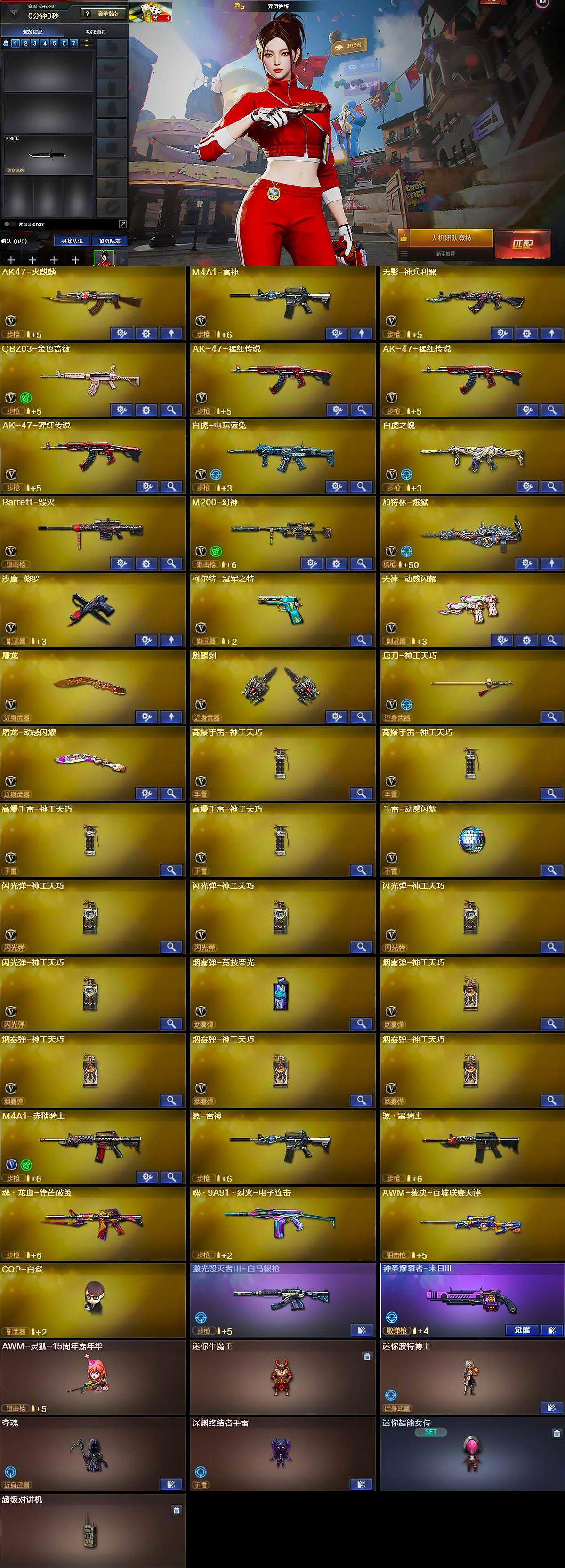 【英雄级武器】:AK47-火麒麟,M4A1-雷神,无影-神兵利器,QBZ03-金色蔷薇,AK-47-猩红传说*3,白虎-电玩蓝兔,白虎之魄-觉醒版,Barrett-毁灭,M200-幻神,加特林-炼狱,沙鹰-修罗,柯尔特-冠军之特,天神-动感闪耀,屠龙,麒麟刺,唐刀-神工天巧,屠龙-动感闪耀,高爆手雷-神工天巧*4,手雷-动感闪耀,闪光弹-神工天巧*4,烟雾弹-竞技荣光,烟雾弹-神工天巧*4,M4A1-赤狱骑士