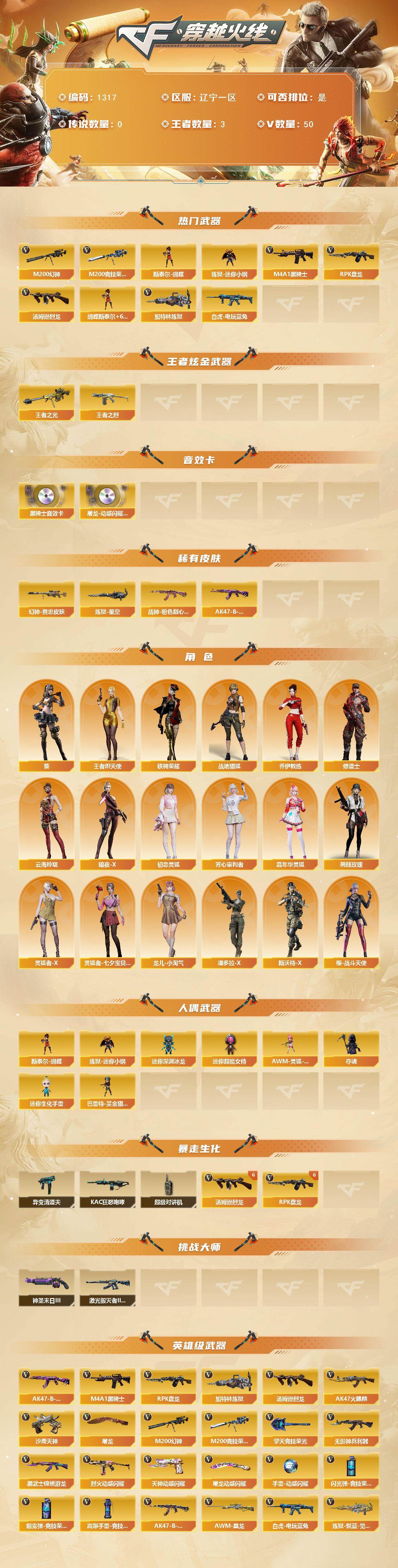 [15200195]辽宁一区-50V-3王者-0炫金 【热门武器】:M200-幻神,M200-竞技荣光,白虎-电玩蓝兔,炼狱-迷你小钢,M4A1-黑骑士,汤姆逊-烈龙*6,RPK-盘龙*6,加特林-炼狱,斯泰尔-蝴蝶 【王者炫金武器】:王者之烈,王者之光 【音效卡】:屠龙-动感闪耀 音效卡,M4A1-黑骑士音效卡 【皮肤】:M200-幻神-黄忠皮肤,战神-粉色甜心皮肤,AK47-B-常胜将军-曹操,炼狱-星空 【角色】:葵,战地猎狐,王者炽天使,乔伊教练,修道士,云海玲珑,暗夜-X,初恋灵狐,芳心审判者,嘉年华灵狐,荆棘玫瑰,灵狐者-X,灵狐者-七夕宝贝,龙儿-小淘气,潘多拉-X,斯沃特-X,铁骑荣耀,樱-战斗天使 【人偶武器】:炼狱-迷你小钢,斯泰尔-蝴蝶,AWM-灵狐-15周年嘉年华,迷你深渊冰龙,夺魂,迷你生化手雷*7,巴雷特-赏金猎人*2,迷你超能女侍 【暴走生化】:异变清道夫,KAC-狂怒咆哮,超级对讲机 【挑战大师】:激光毁灭者III-白马银枪,神圣爆裂者-末日III 【英雄级武器】:AK47-火麒麟,M4A1-黑骑士,无影-神兵利器,黑武士-锦绣游龙,烈火-动感闪耀,AK47-B-战神,AK47-B-常胜将军,白虎-电玩蓝兔,M200-幻神,M200-竞技荣光,RPK-盘龙*6,加特林-炼狱,炼狱-悦蓝-觉醒版,汤姆逊-烈龙*6,沙鹰-天神*6,天神-动感闪耀,屠龙,擎天-竞技荣光,屠龙-动感闪耀,高爆手雷-竞技荣光*2,手雷-动感闪耀,闪光弹-竞技荣光*5,烟雾弹-竞技荣光*4,AWM-昌龙 【道具】:虎牙炫彩背包,圣拳猎手-炽雪,女皇终结者-魔龙之吻,救世主-黑桃战神,黄金生化钩,绿色巨人,灵魂忍者,变异宝贝,迷雾幽灵,生化弹匣,夺命之镰,防化服*2,金色流光-枪王排位*2,星辰流光-枪王排位,巅峰赛先锋-金色流光,枪王排位28赛季金色流光,枪王排位29赛季金色流光,电玩兔兔表情,动感闪耀表情,防弹头盔*2,防弹衣*2,C4工具钳*2,手雷包*2 【特殊枪械】:蝴蝶斯泰尔+6烈龙,1黑骑士,6烈龙,6盘龙,1炼狱,1蝴蝶斯泰尔
