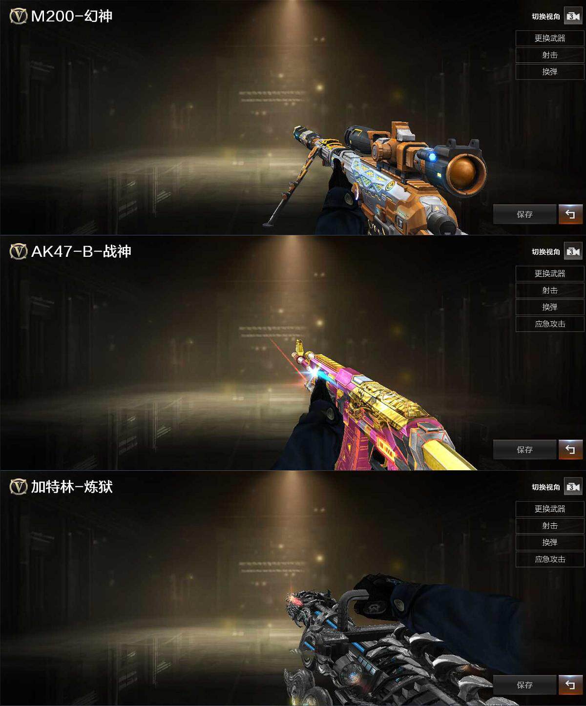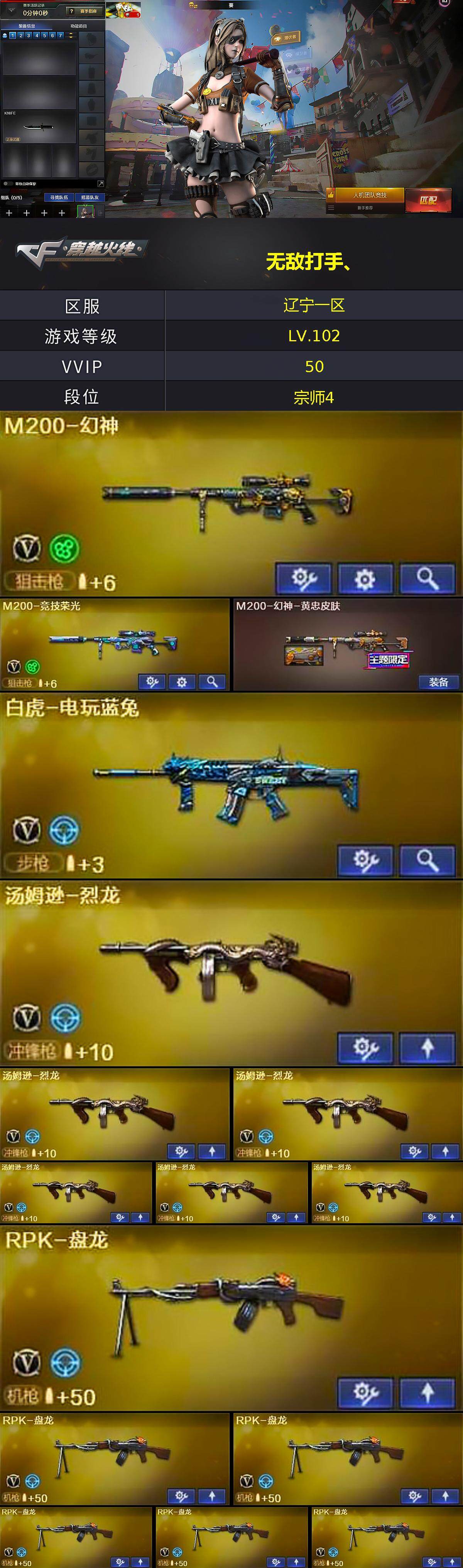 【热门武器】:M200-幻神,M200-竞技荣光,白虎-电玩蓝兔,炼狱-迷你小钢,M4A1-黑骑士,汤姆逊-烈龙*6,RPK-盘龙*6,加特林-炼狱,斯泰尔-蝴蝶